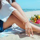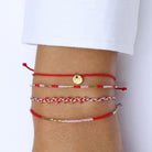 We used yarn in Deep Red, Light Blue and Blush Rose to braid it into a colorful bracelet. Twelve beads in Red and Gold add to the dainty charm of our Take a Twist Bracelet.