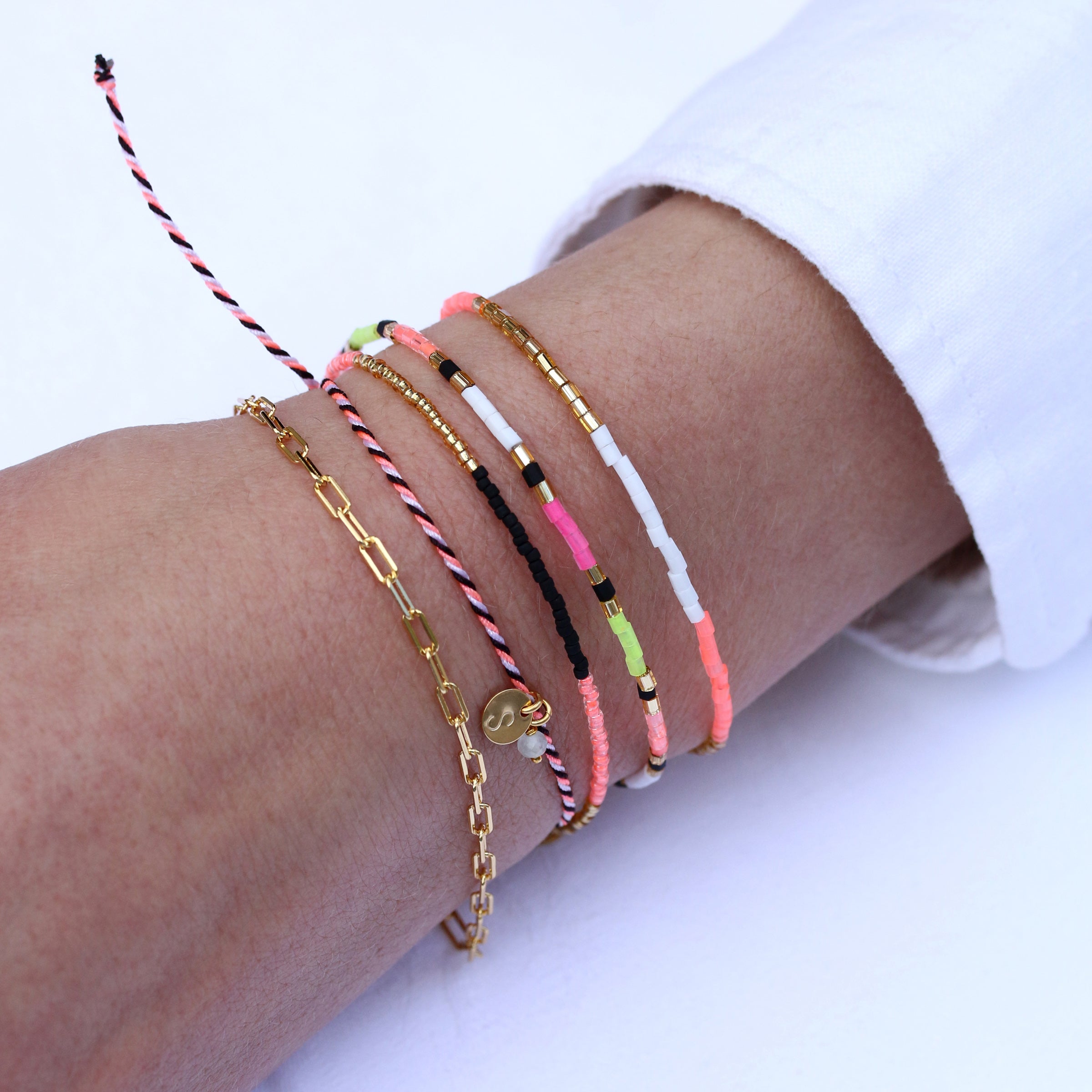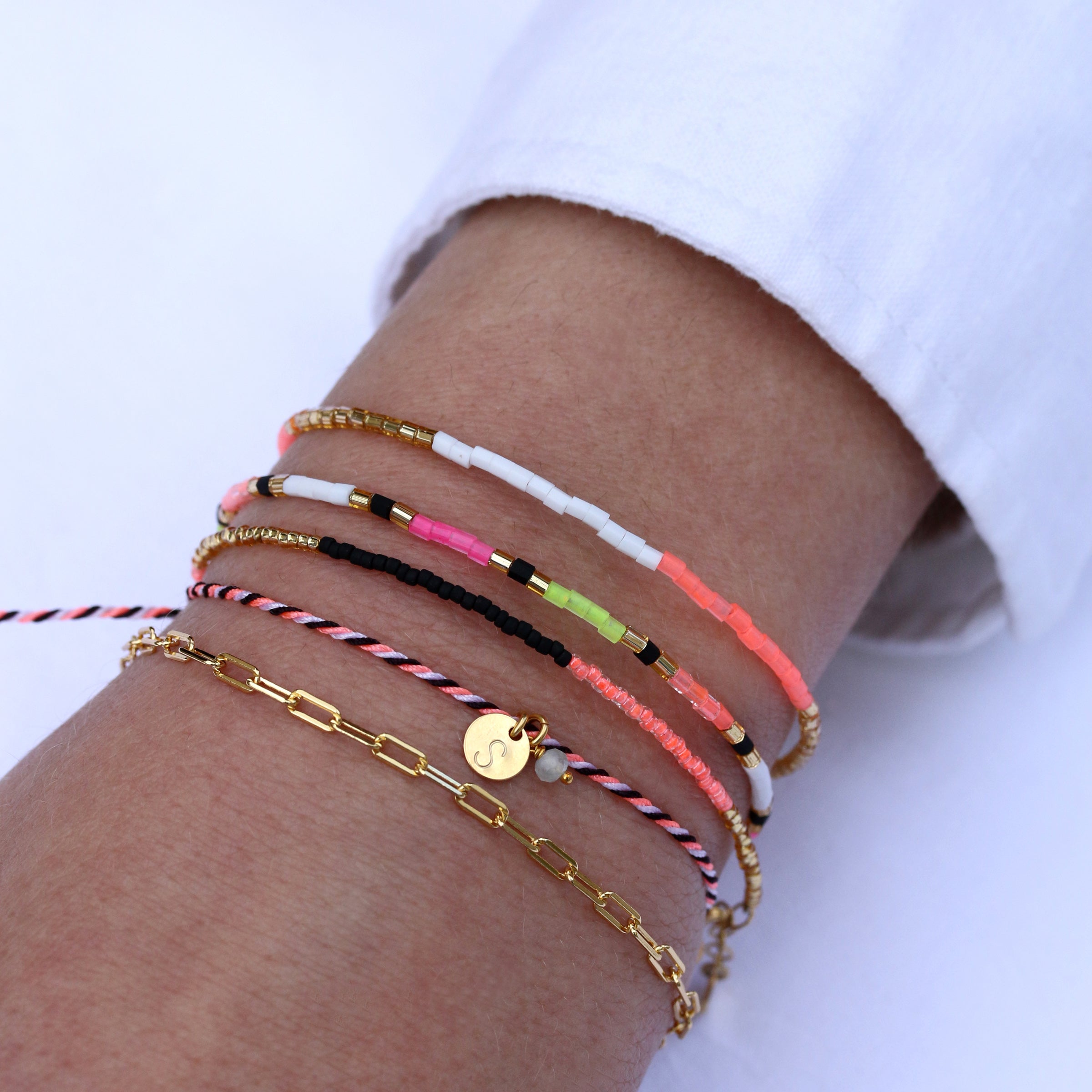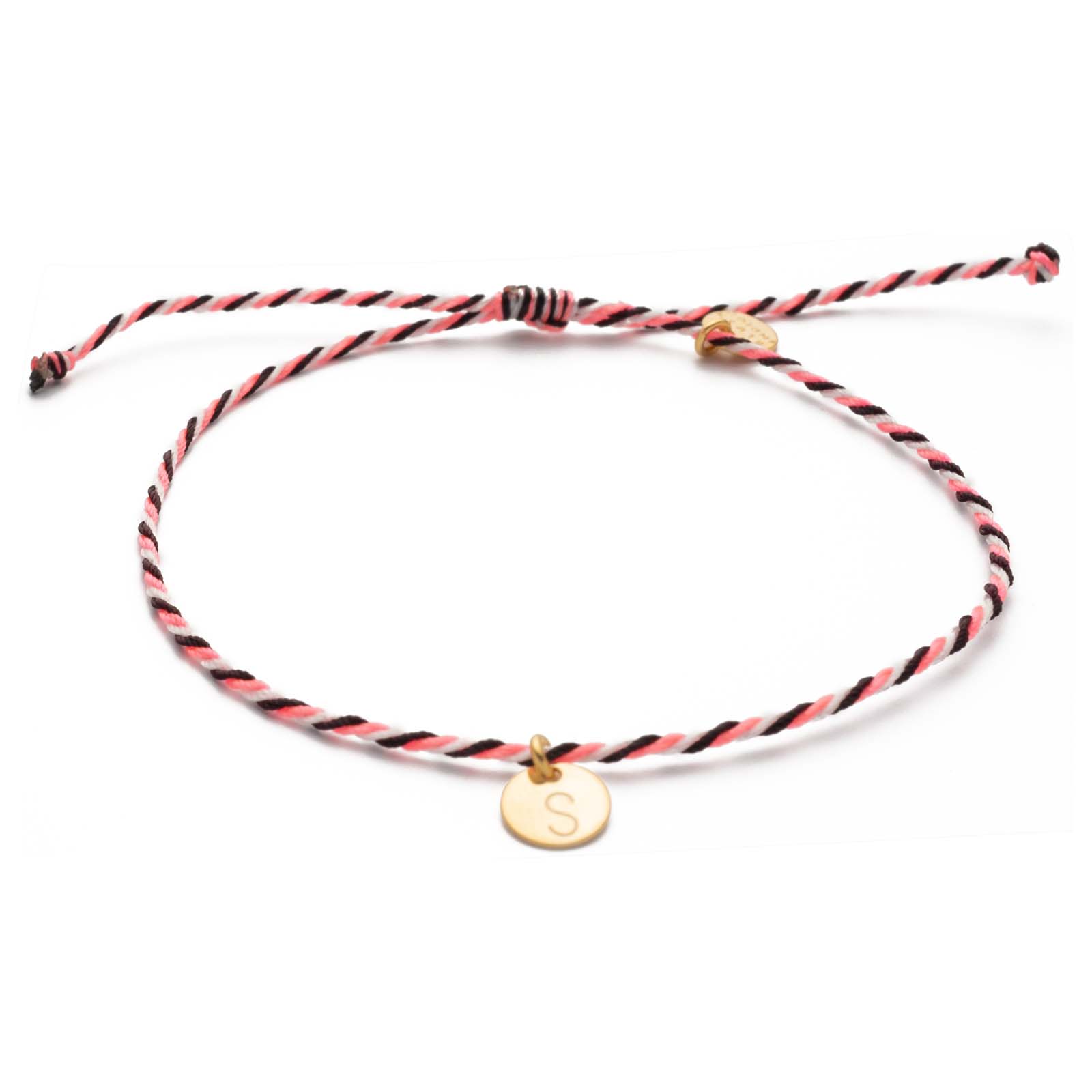 The circular 6 mm letter disk is available in gold and silver. It is stamped by hand, so no two are alike. The bracelet can be adjusted in size by the knot closure. All metal parts used are made of 24k gold plated brass and come from Germany and Italy.