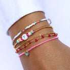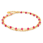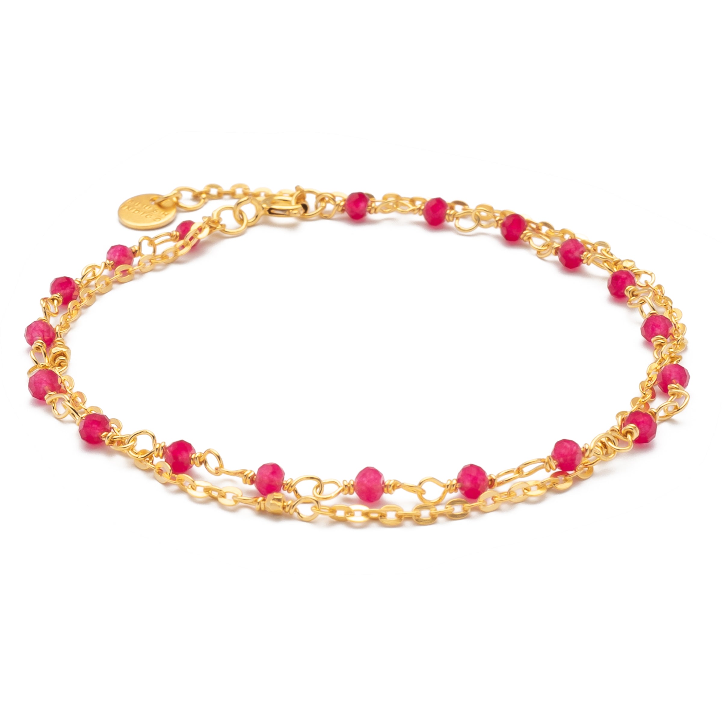The double strand bracelet from our Sweet Gem Series is a timeless classic. It consists of a series of delicate links and a number of pink fuchsia onyx. The stones are faceted, mostly opaque and have a shiny surface.