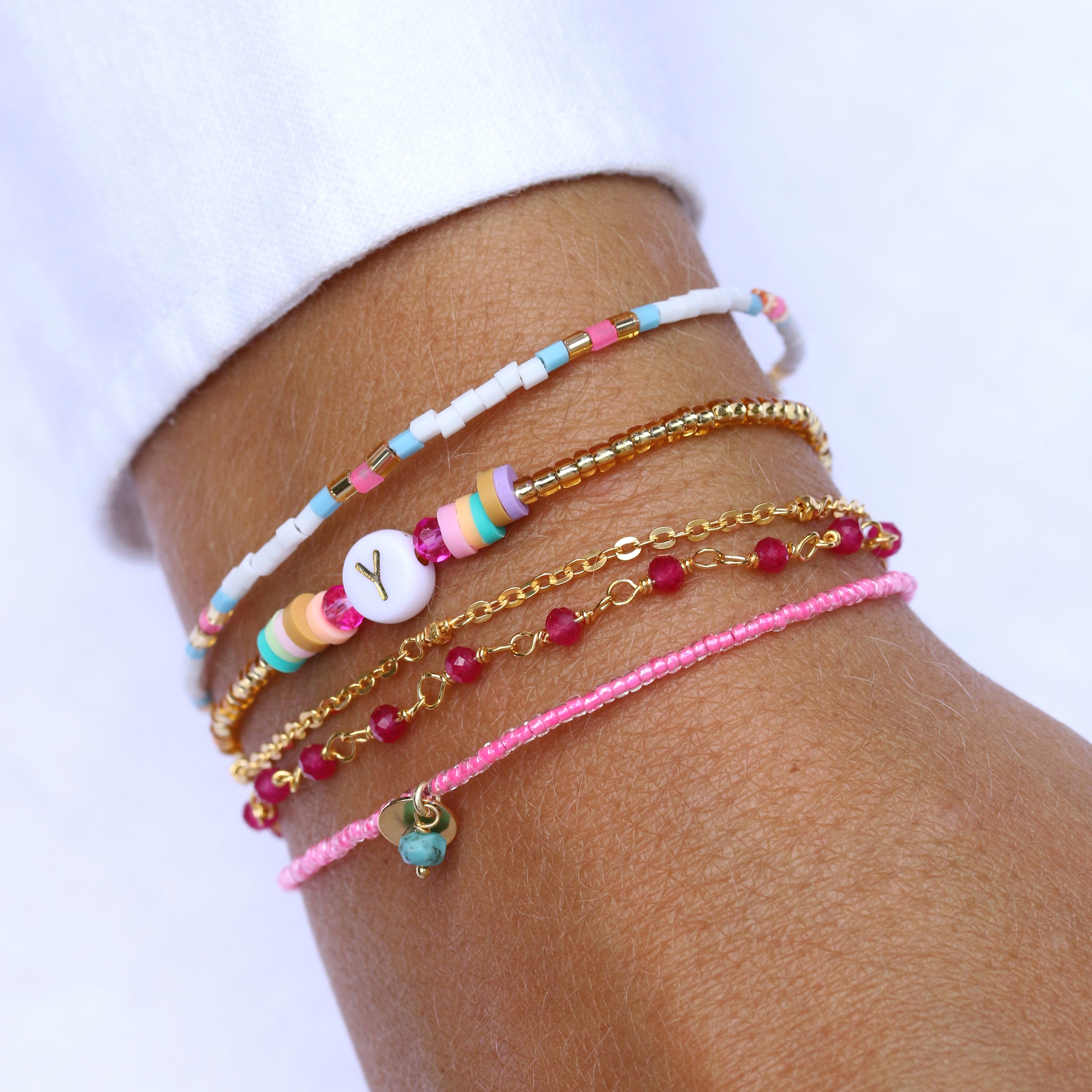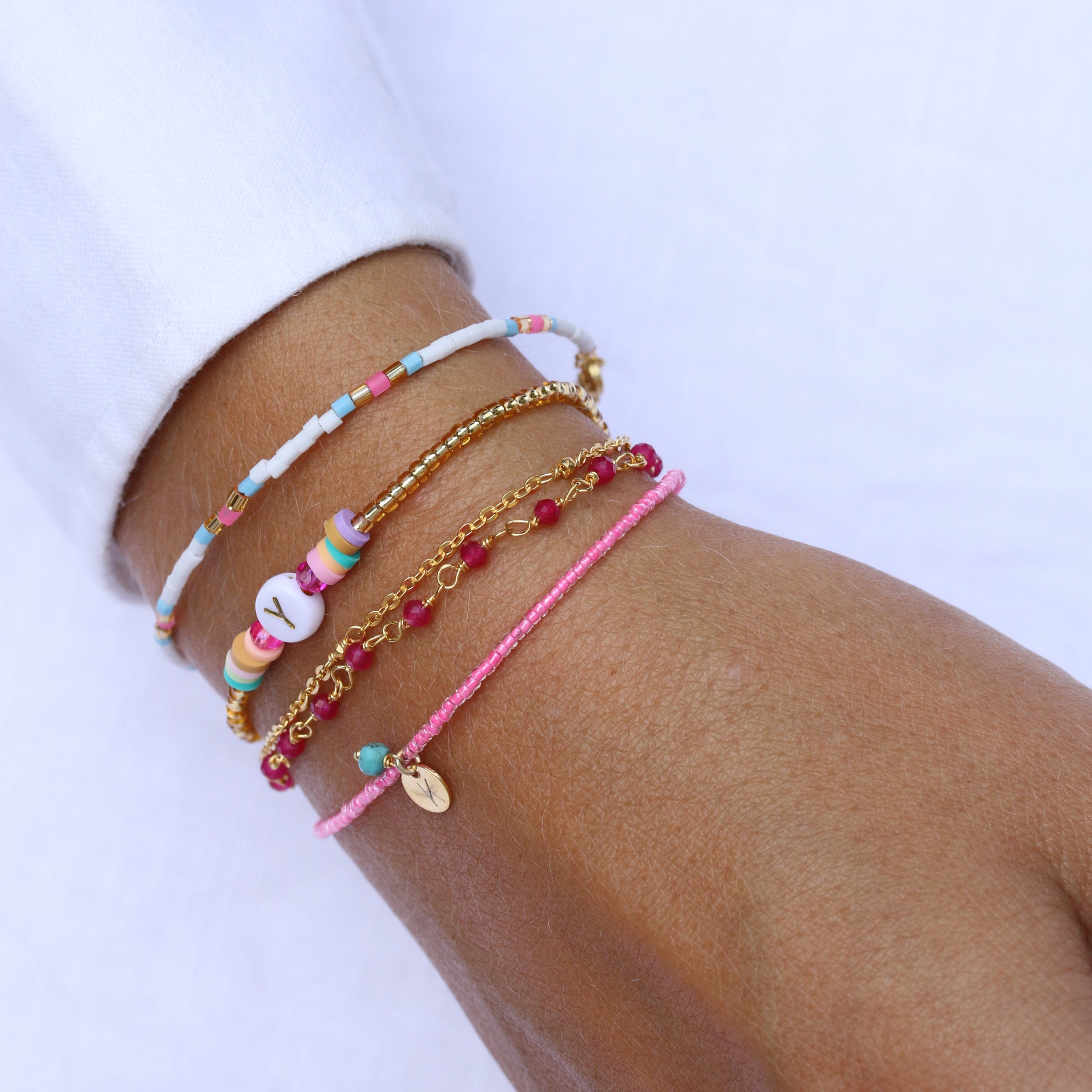 For our Gemstone collection we have designed refined jewellery with colourful semi-precious stones.The bracelet is 16 cm long and can be extended by 3 cm. The natural stones are always unique in their shape and colour. They measure approx. 2 mm. The bracelet is made of 925 silver and dipped in a 18k gold plating.