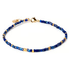 The silver Amalfi bracelet in Midnight Sky is a dark blue color mix on the wrist. Matte and shiny beads in various shades of blue set the tone. Silver beads add elegant accents.