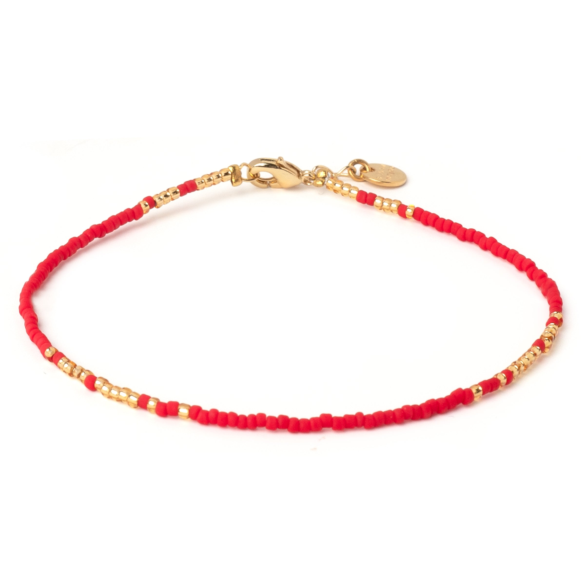 Mattrote Glasperlen vereinen sich mit feinen Goldakzenten zu einem Armband voller subtiler Eleganz. Ob als kräftiger Farbtupfer zu romantischen Outfits oder solo getragen – dieses zeitlose Schmuckstück in edlem Rot lässt sich vielseitig kombinieren und rundet jeden Look stilvoll ab.
