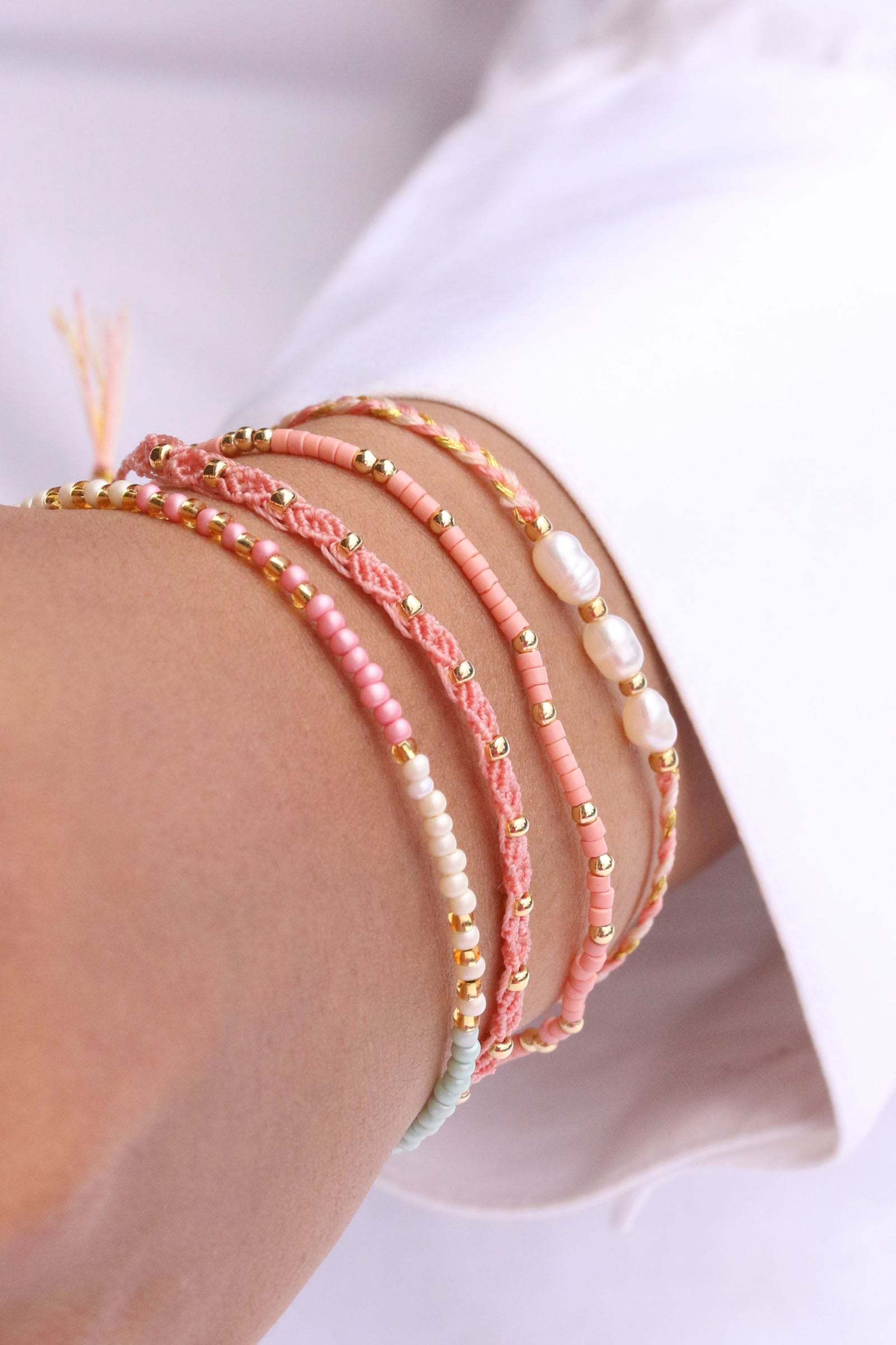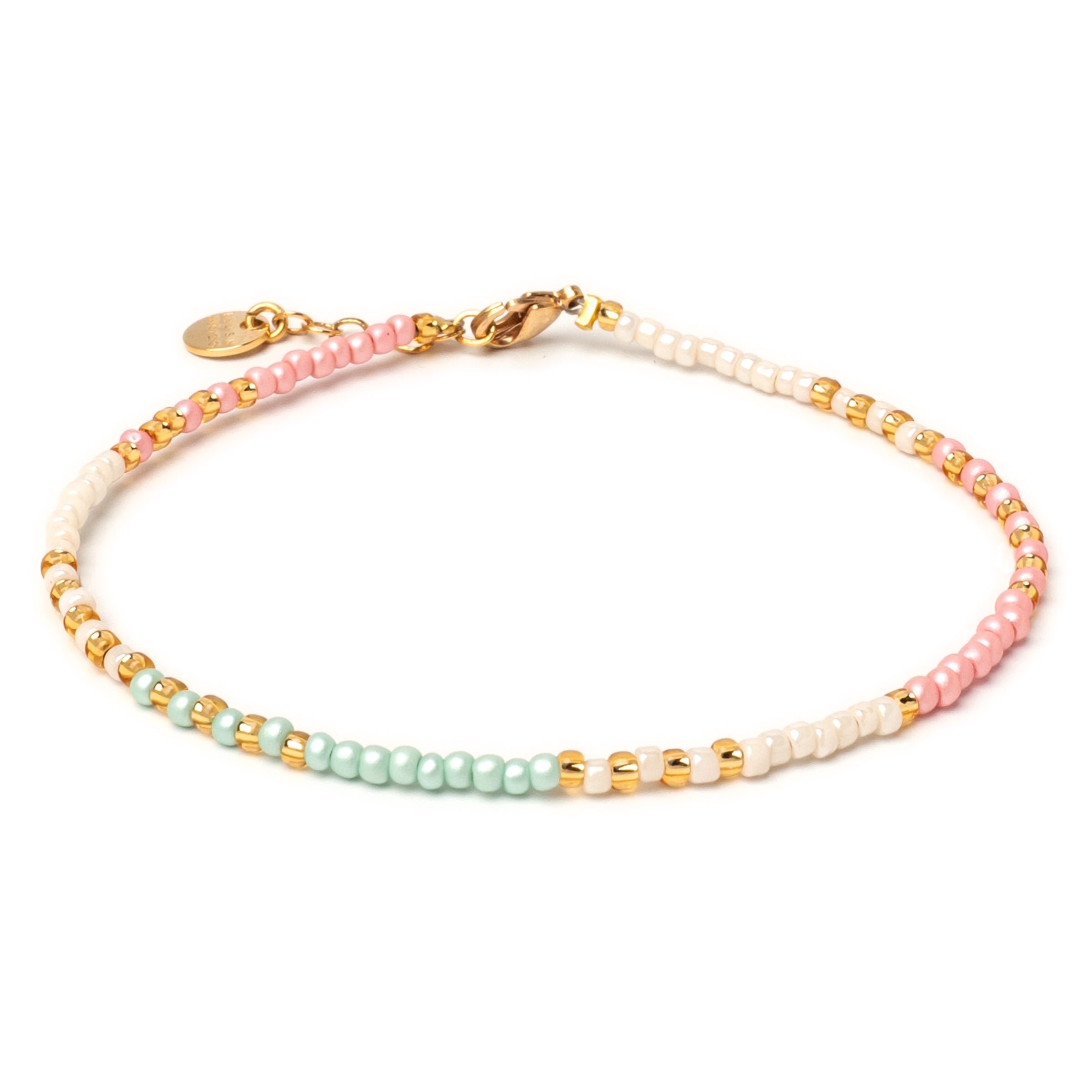 Our Marie Antoinette bracelet in the delicate icing colors metallic rose, fresh mint and ivory is truly regal. Scattered golden pearls add elegant accents.