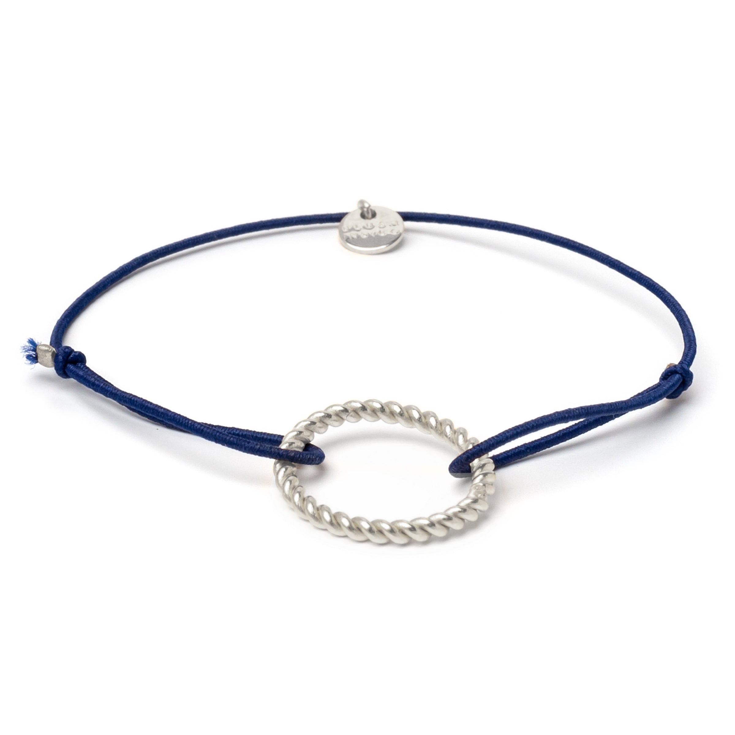 The pendant has a diameter of 14 mm. The ring bar is twisted and 1.7 mm thick. The size of the bracelet can be adjusted with two knot fasteners. The nylon strap is also elastic so that it fits every wrist.