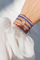 The Darling Circle bracelet has what it takes to become a favorite piece in your jewelry box. The elastic nylon strap in navy blue elegantly hugs your wrist. The twisted circular circle pendant made of 24k gold-plated stainless steel is the radiant centerpiece.
