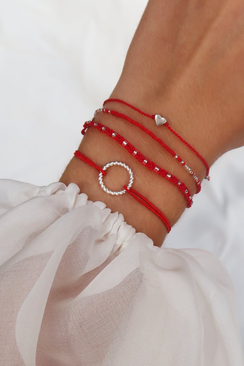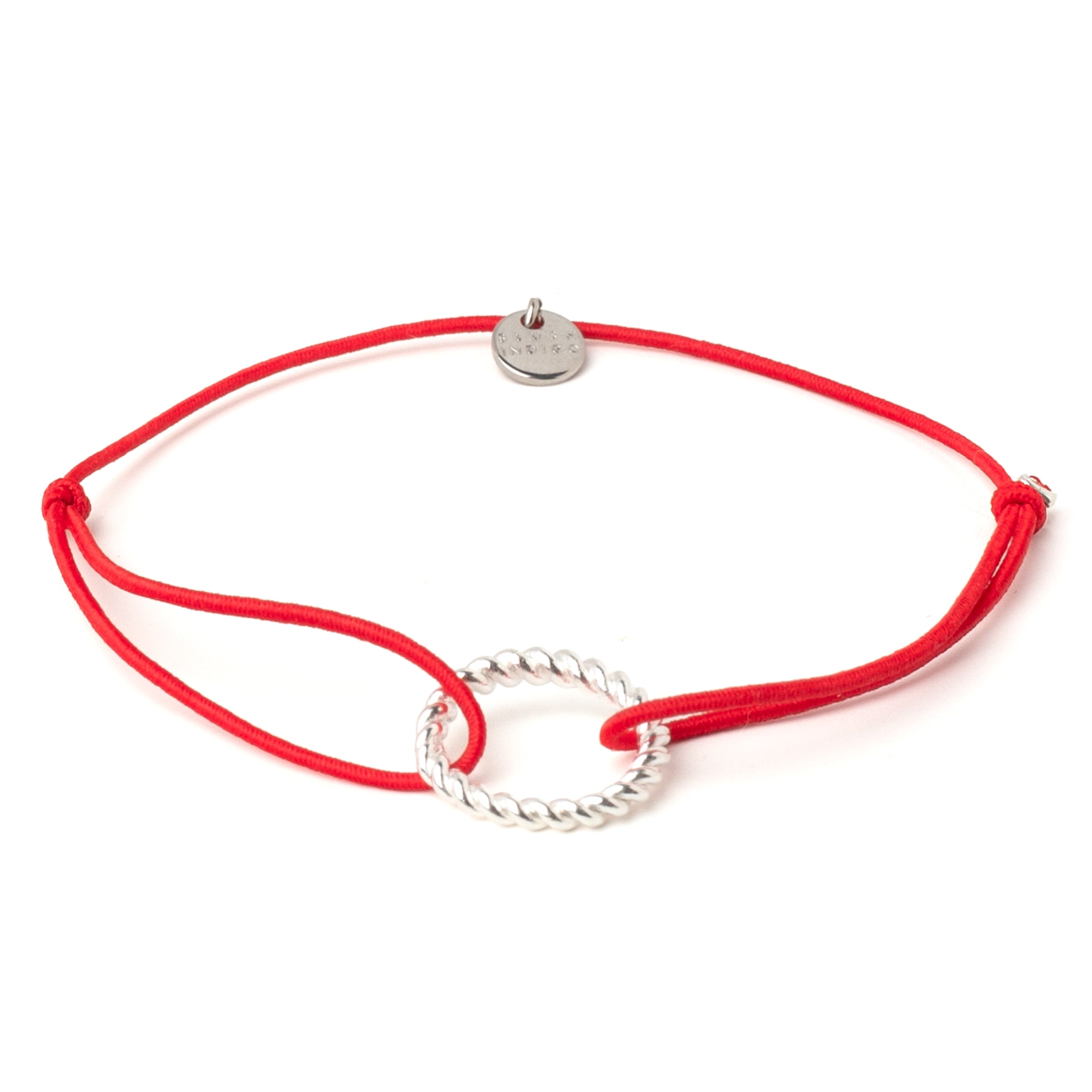 The pendant has a diameter of 14 mm. The ring bar is twisted and 1.7 mm thick. The size of the bracelet can be adjusted with two knot fasteners. The nylon strap is also elastic so that it fits every wrist.