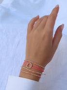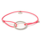 The Darling Circle bracelet has what it takes to become a favorite piece in your jewelry box. The elastic nylon strap in flamingo pink elegantly hugs your wrist. The twisted circular circle pendant made of 24k gold-plated stainless steel is the radiant centerpiece.