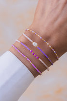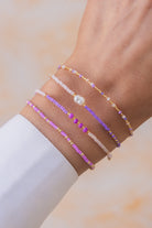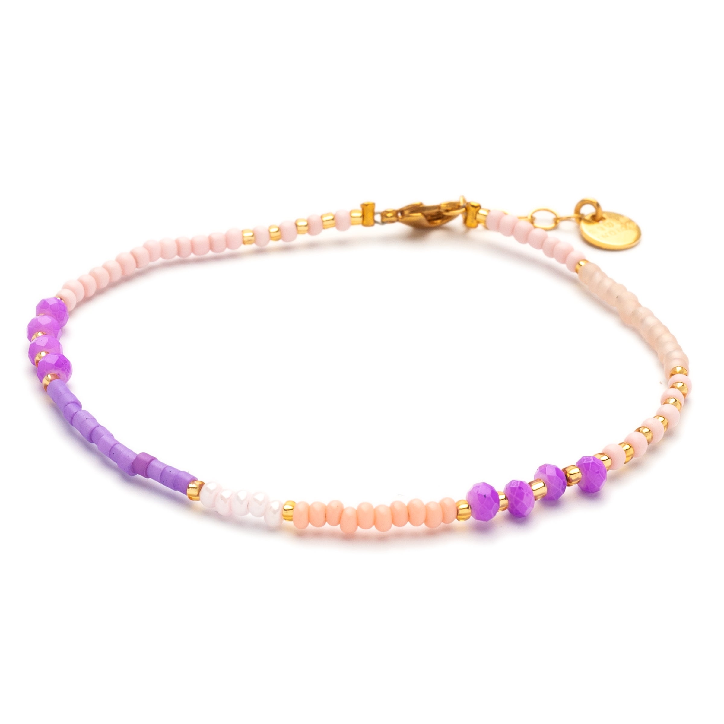 Our Milos bracelet is a beguiling melange of lilac, purple and blush rose. Purple glass crystals add elegant highlights. The Milos series from our Greece Collection includes other bracelets, anklets and a necklace.