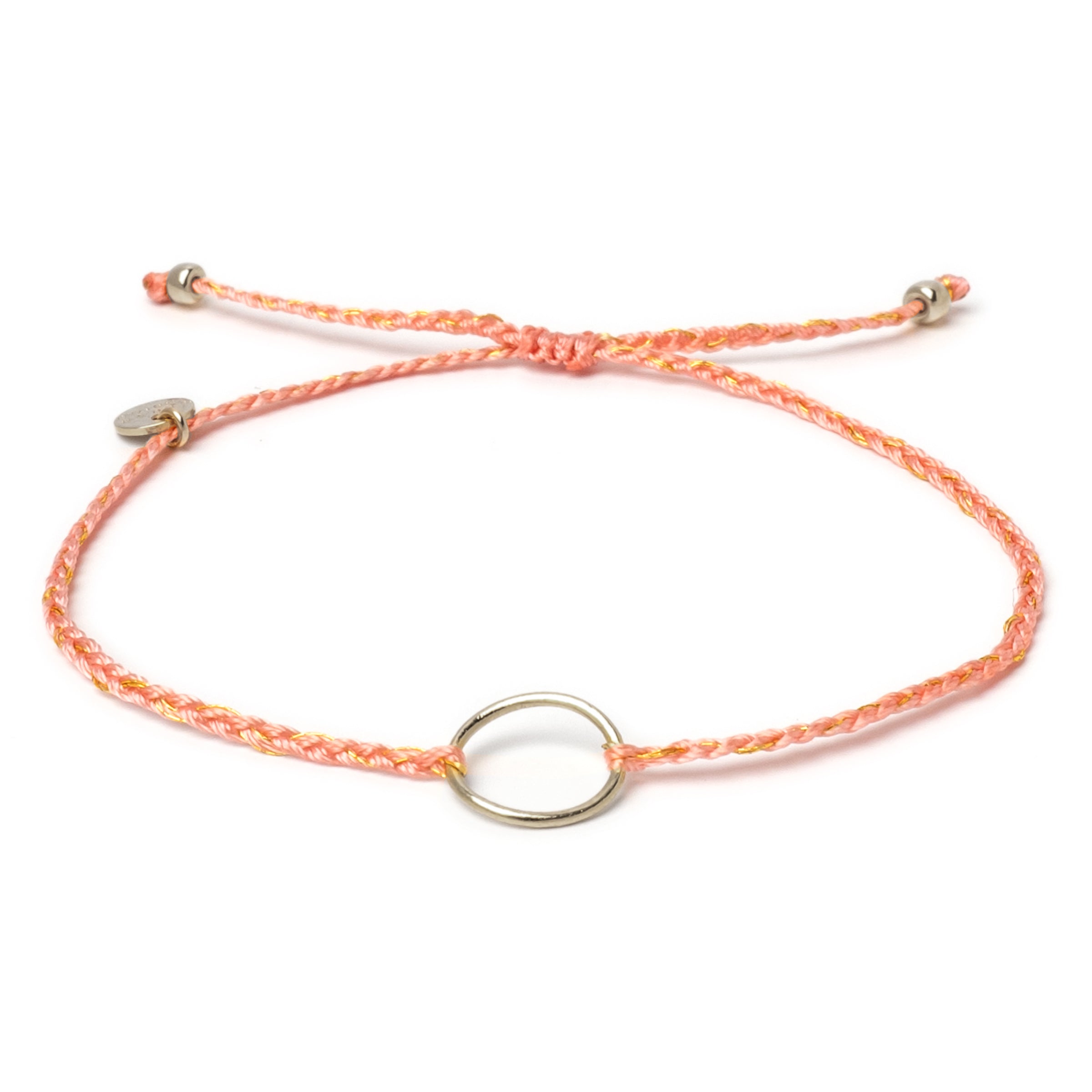 Our braided karma bracelet with circle pendant and interwoven gold threads brings an extra dose of sparkle to your wrist.