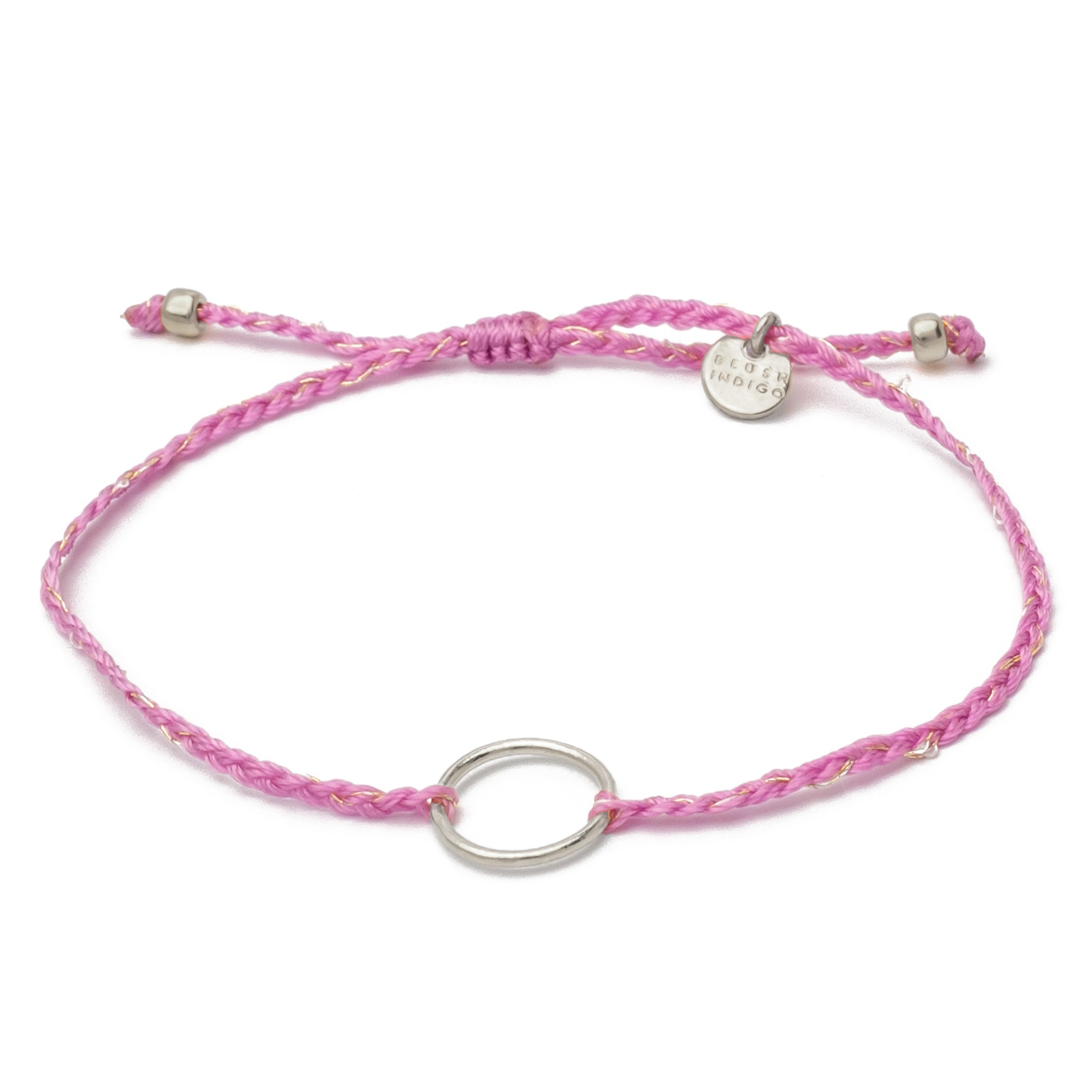Our braided karma bracelet with circle pendant and interwoven gold threads brings an extra dose of sparkle to your wrist.