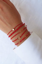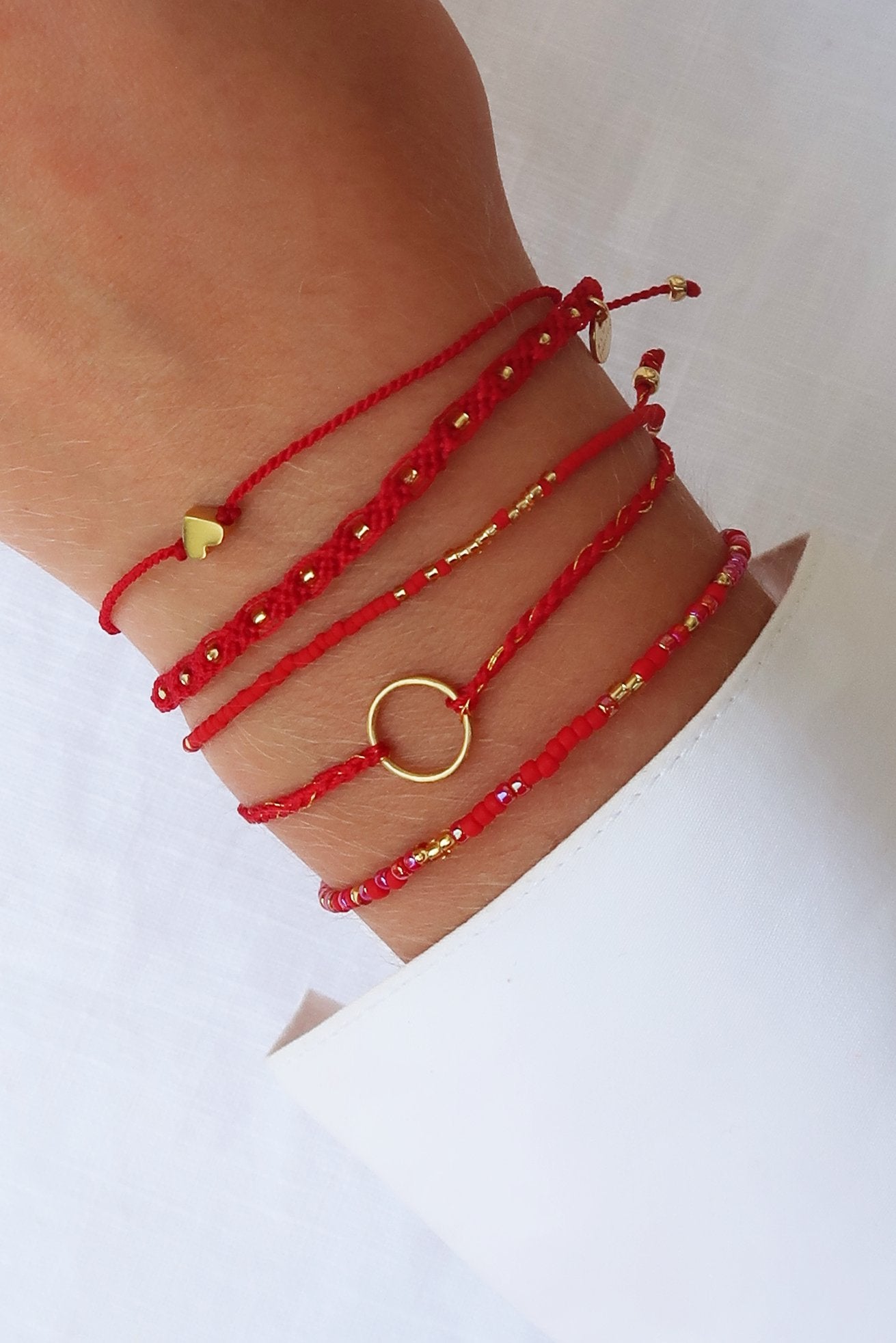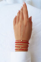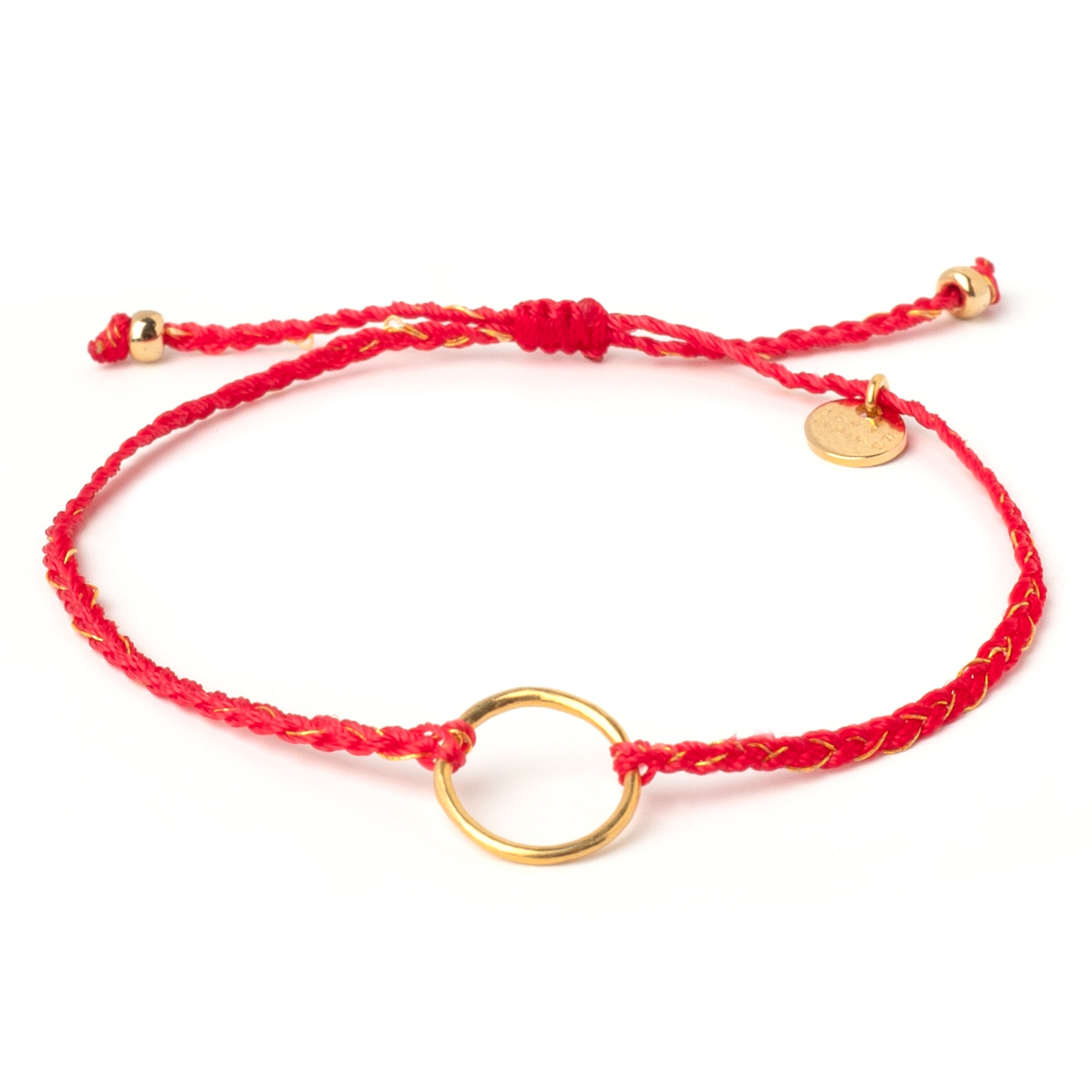 Our braided karma bracelet with circle pendant and interwoven gold threads brings an extra dose of sparkle to your wrist.