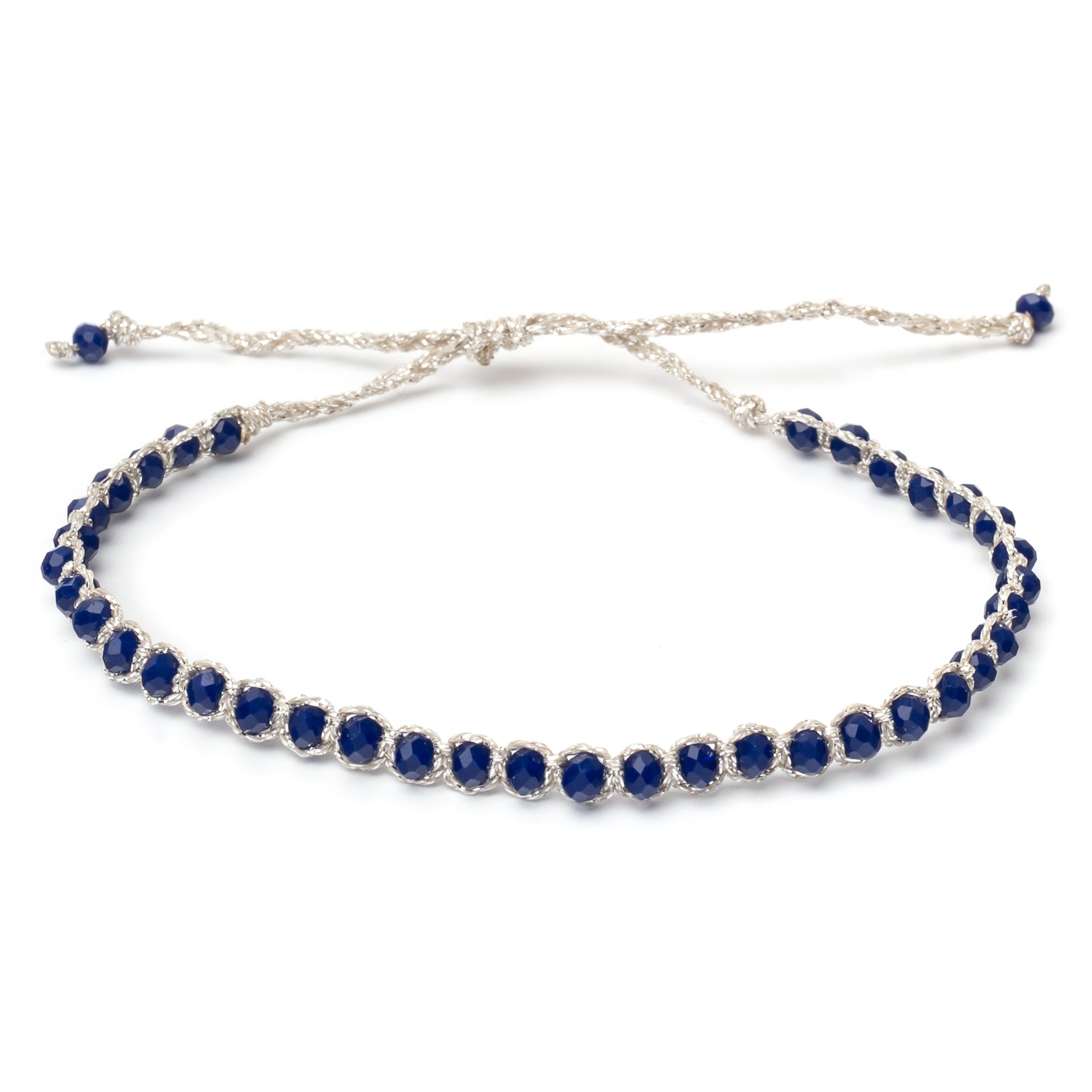 Your time to shine! Our Mino bracelet combines soft color accents with an irresistible glow. The matt indigo blue crystals are knotted in rows with glittering silver-colored textile to create an elegant bracelet.