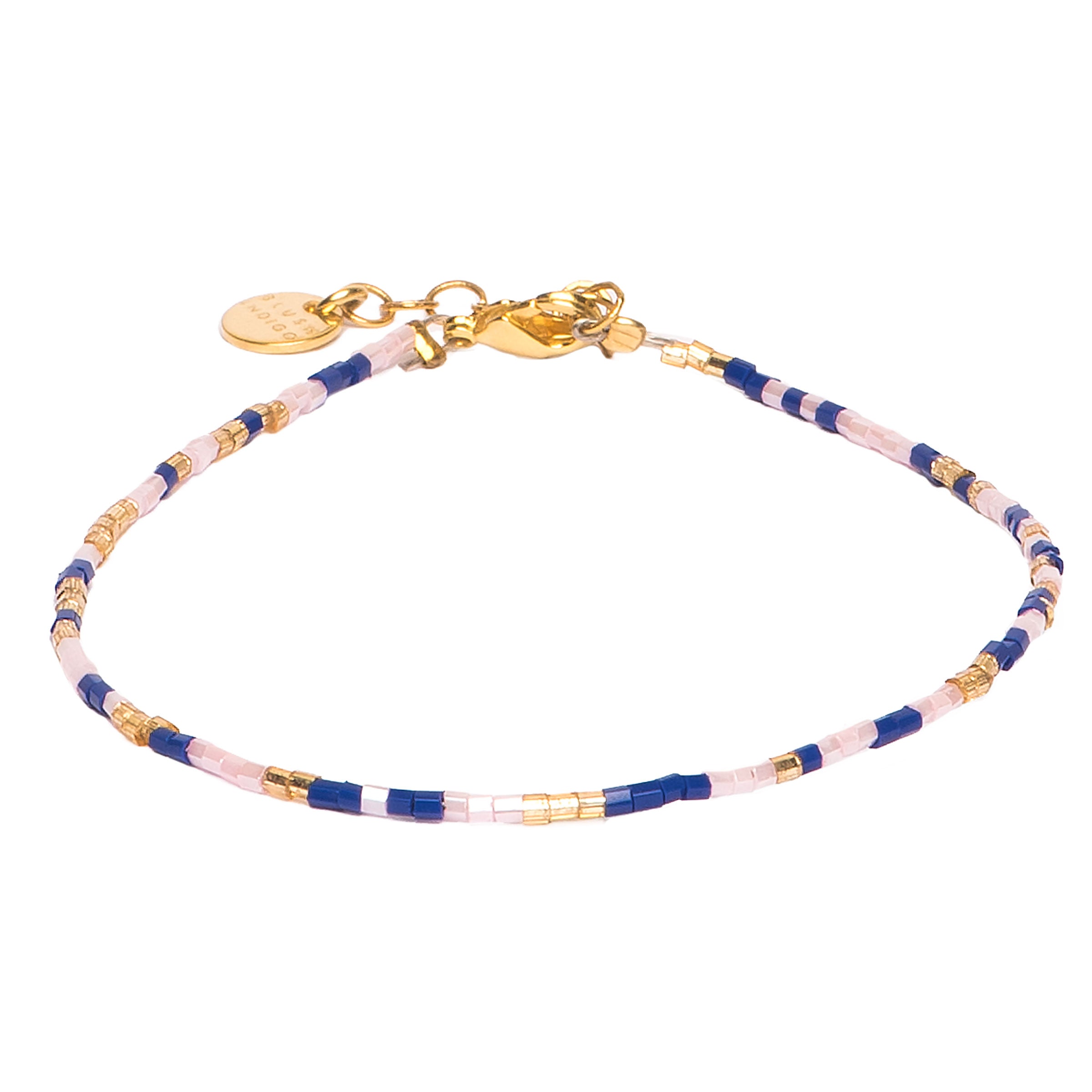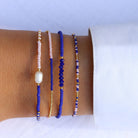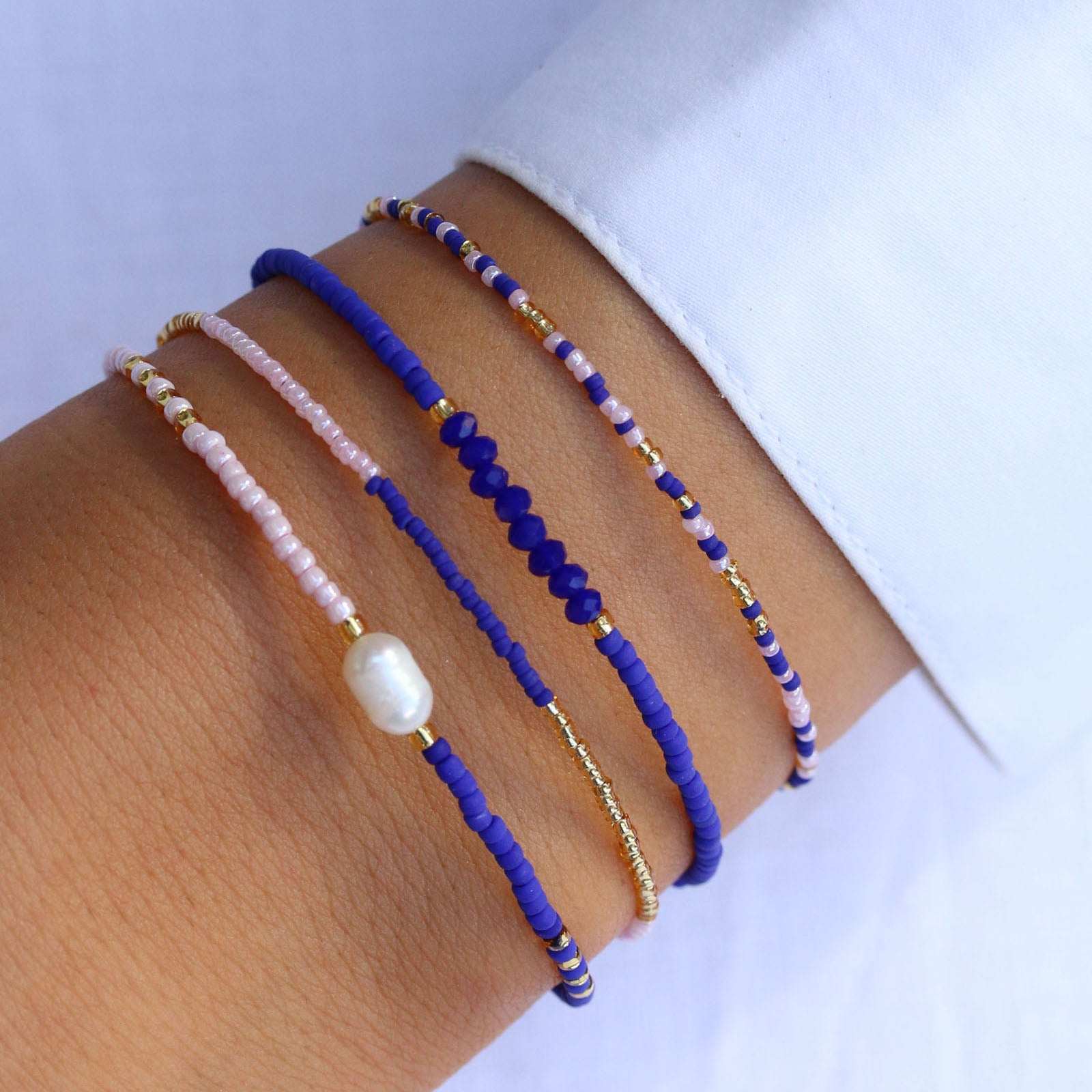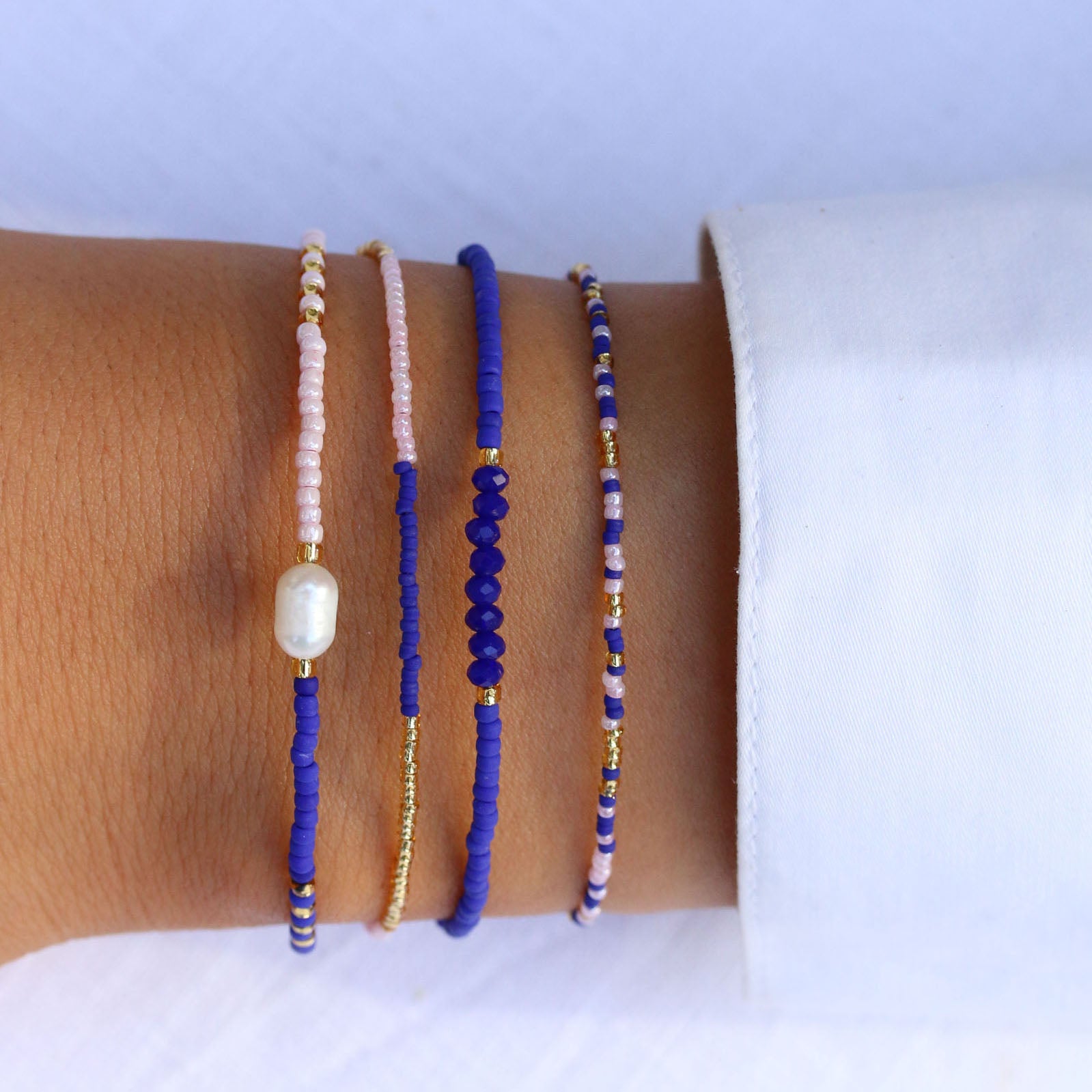 Another bracelet quartet lets you shine in our favorite colors Blush Rose and Indigo Blue. A freshwater pearl is the radiant focal point, framed by scattered gold beads.