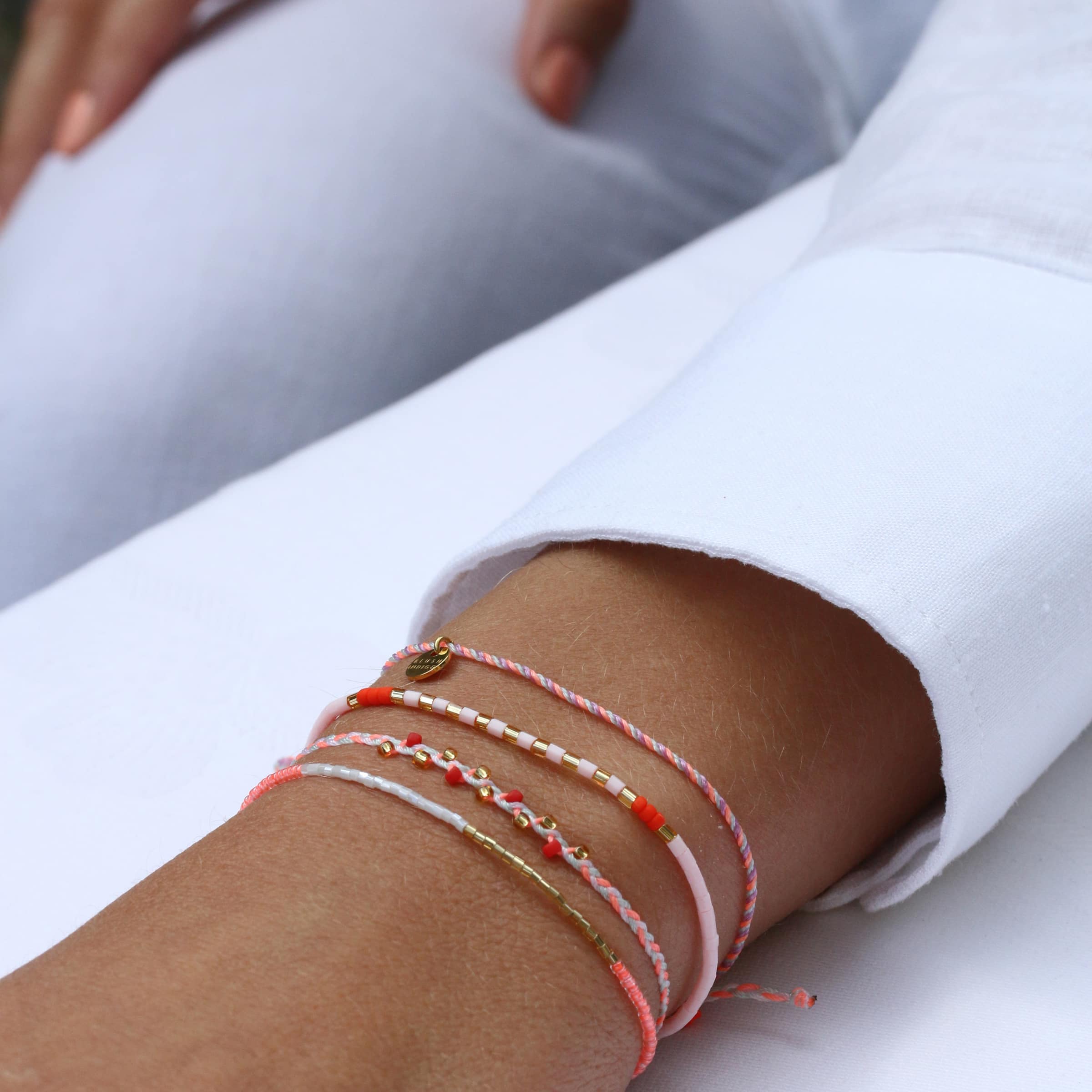 Are you a Cherry Blossom Girl? One Be Blush bracelet with beads in Coral, Gold and a shimmering Ivory teams up with one Sweet String and one Take a Twist bracelet featuring the same spectrum of colors. The Bali temple bracelet is a lucky