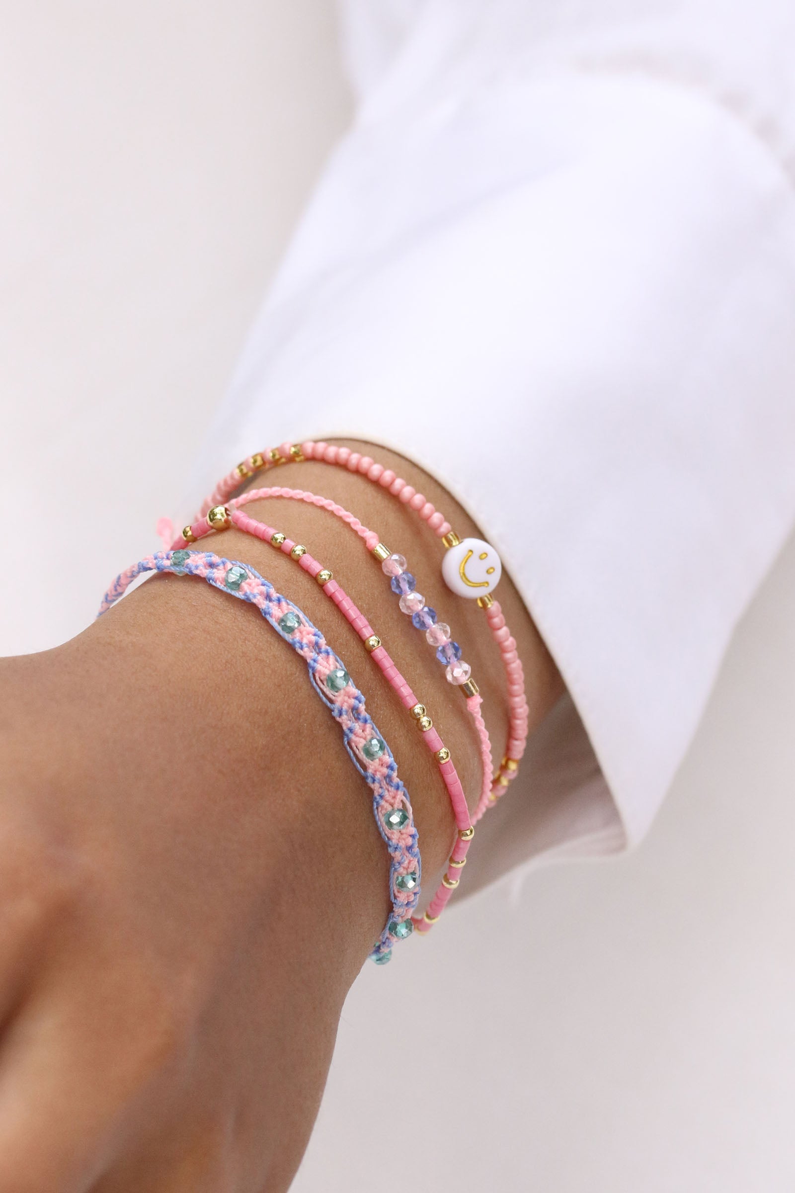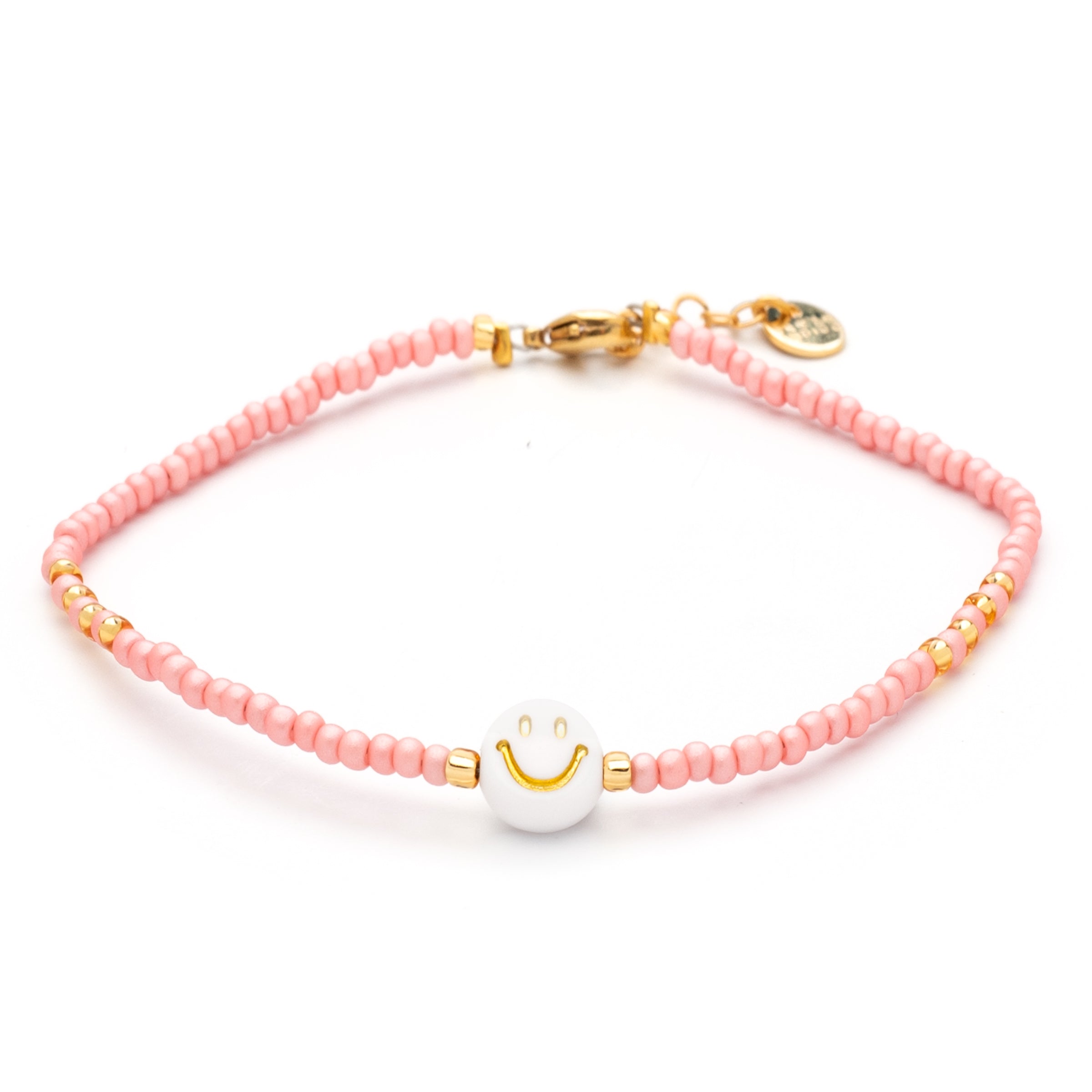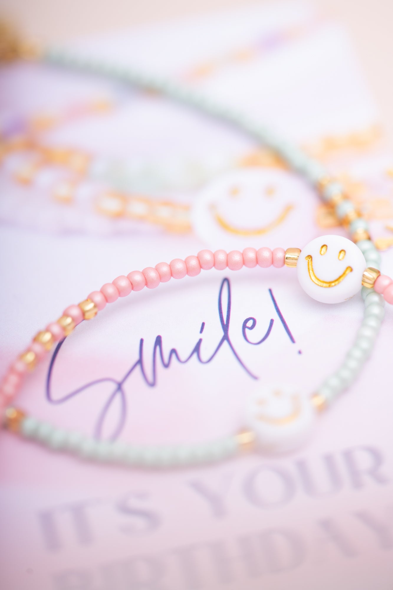 The Smile, it's your birthday 2 bracelet is the icing on your birthday cake: light pink beads with a metalic shimmer sweeten your wrist and alternate with golden beads. One smiley is grinning at you. Our Birthday series includes more smiley bracelets.