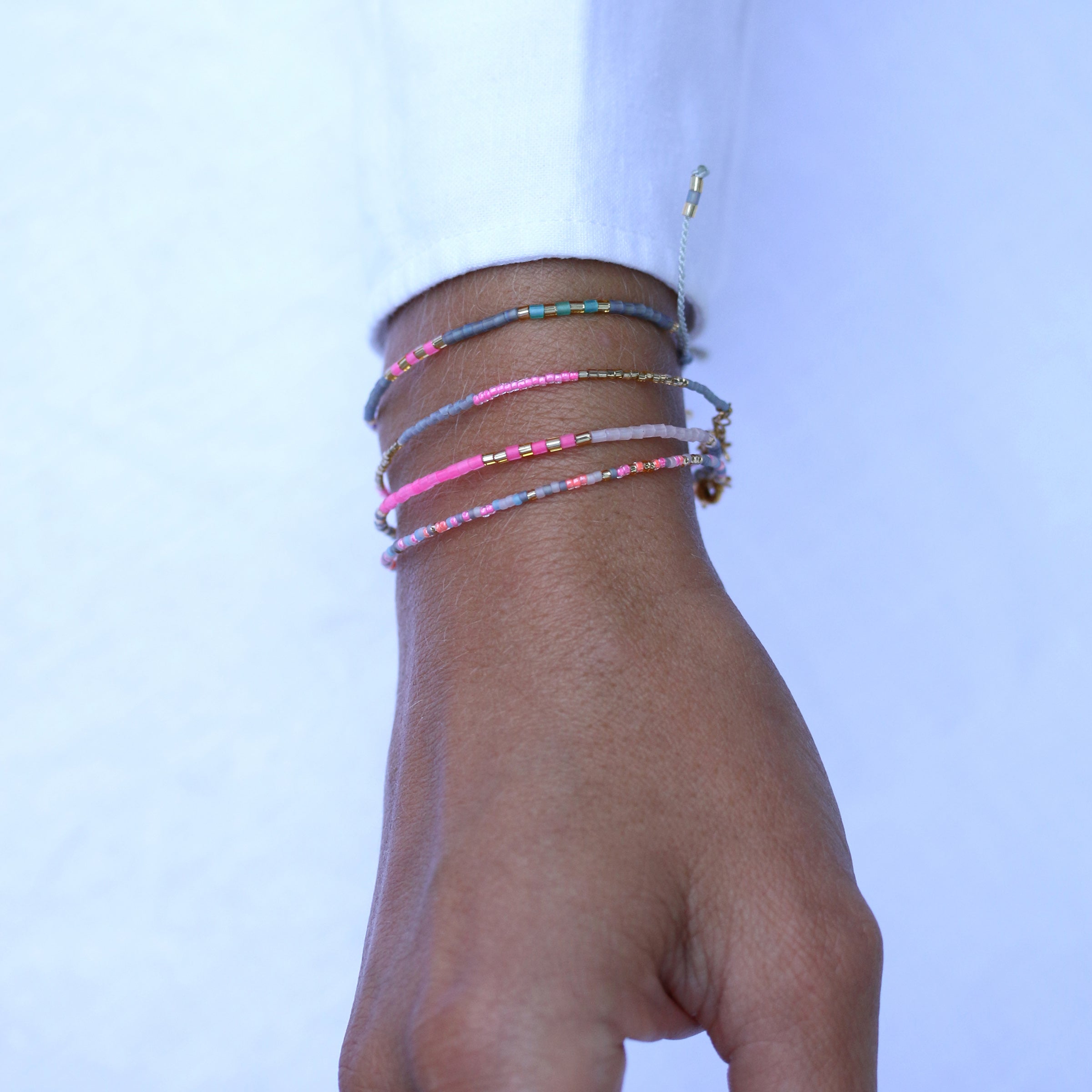 The golden bracelet Grey Season from our Sweet String series is a symphony of Frosted Grey with colourful highlights in Pink, Coral, Blush Rose and Light Blue. You can find the mix set of the same name with other grey favorites here.