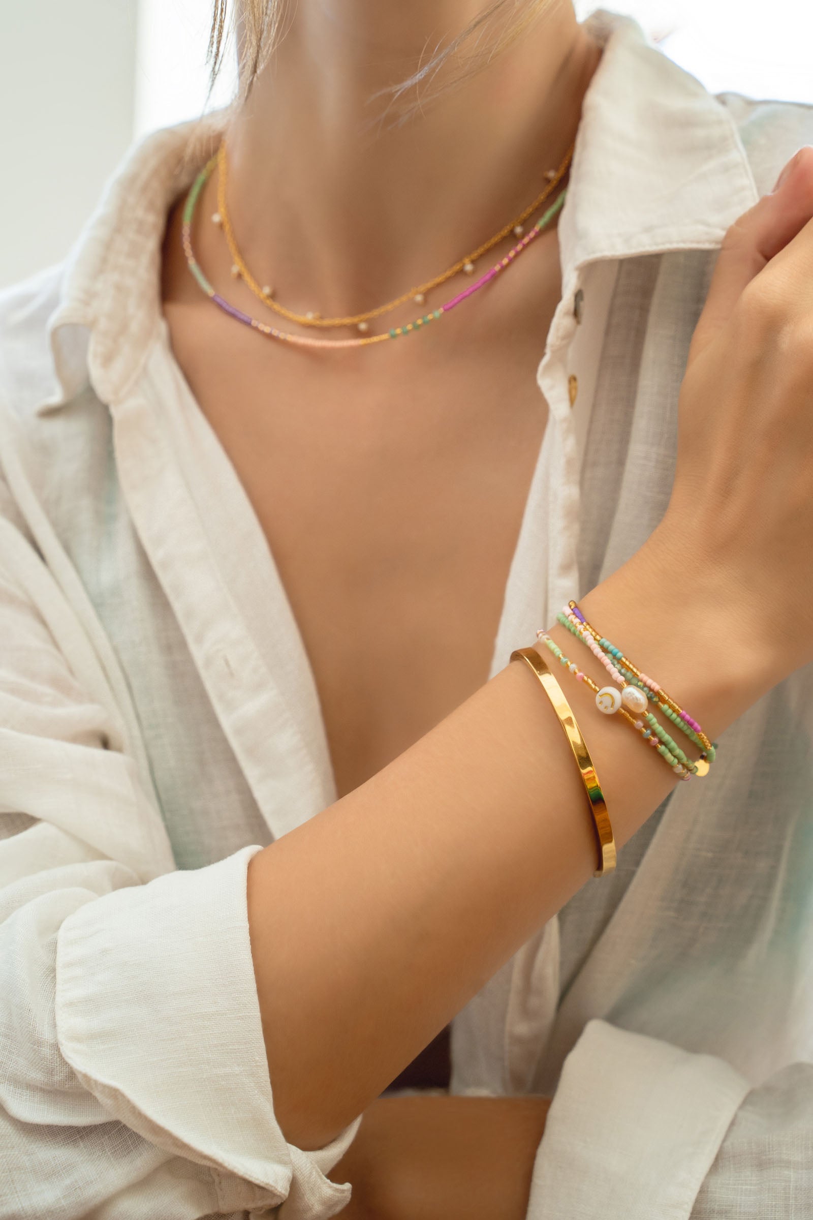 This also applies to the gold and silver beads. These are coated on the inside, so they will become duller over time due to wear on the jewelry wire. Please follow our care instructions below to ensure you can enjoy your jewelry for a long time.
