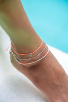 Let me be your anklet candy! Fresh mint, neon coral, and silver accents – the colorful anklet trio is complete.