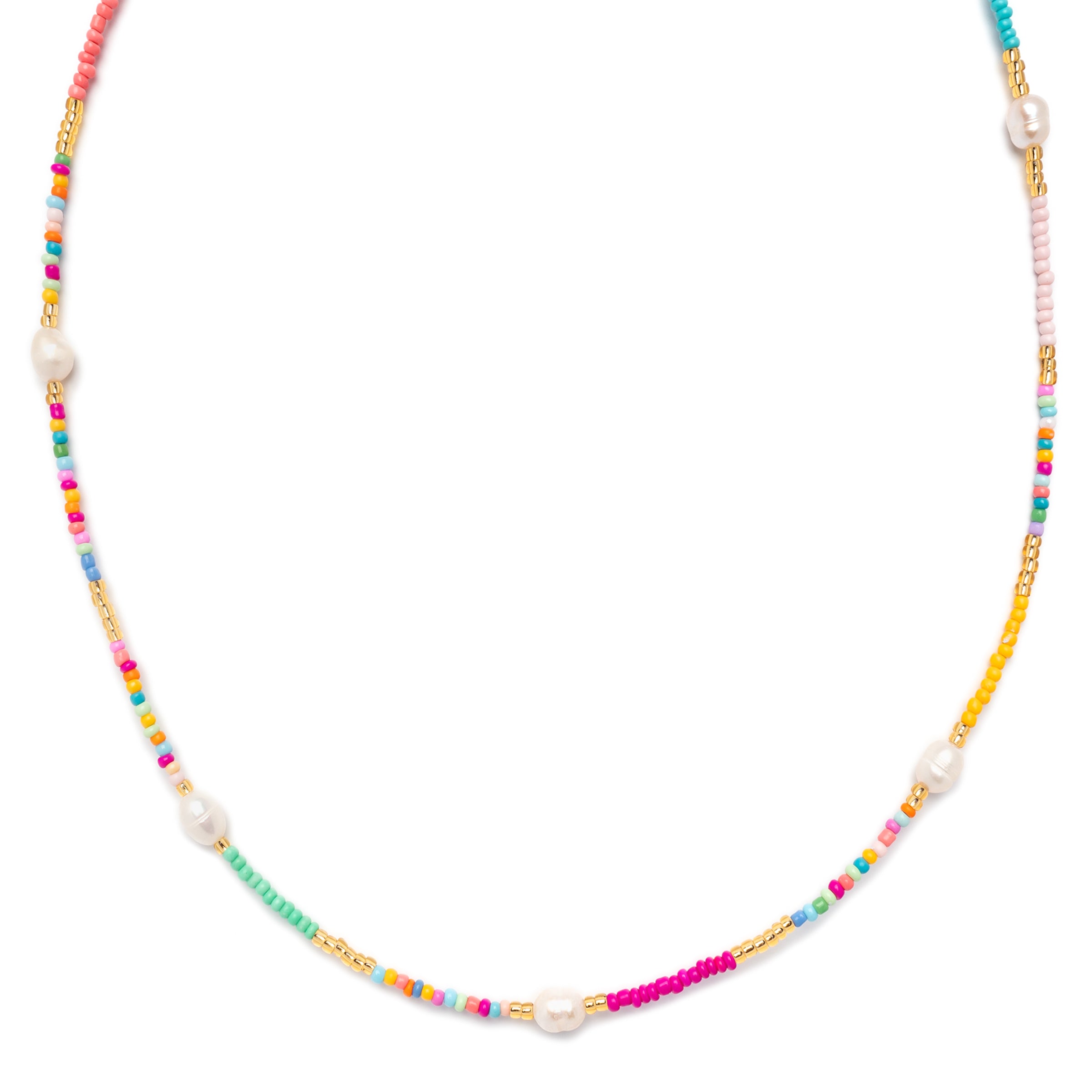 The necklace Gili is a color spectacle in a class of its own: Rocaille beads in neon pink, ocean green, yellow, mint green, orange, sky blue and many other colors are colorfully mixed. Gold-plated metal cubes add elegant accents and four freshwater pearls complete the island feeling.