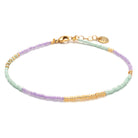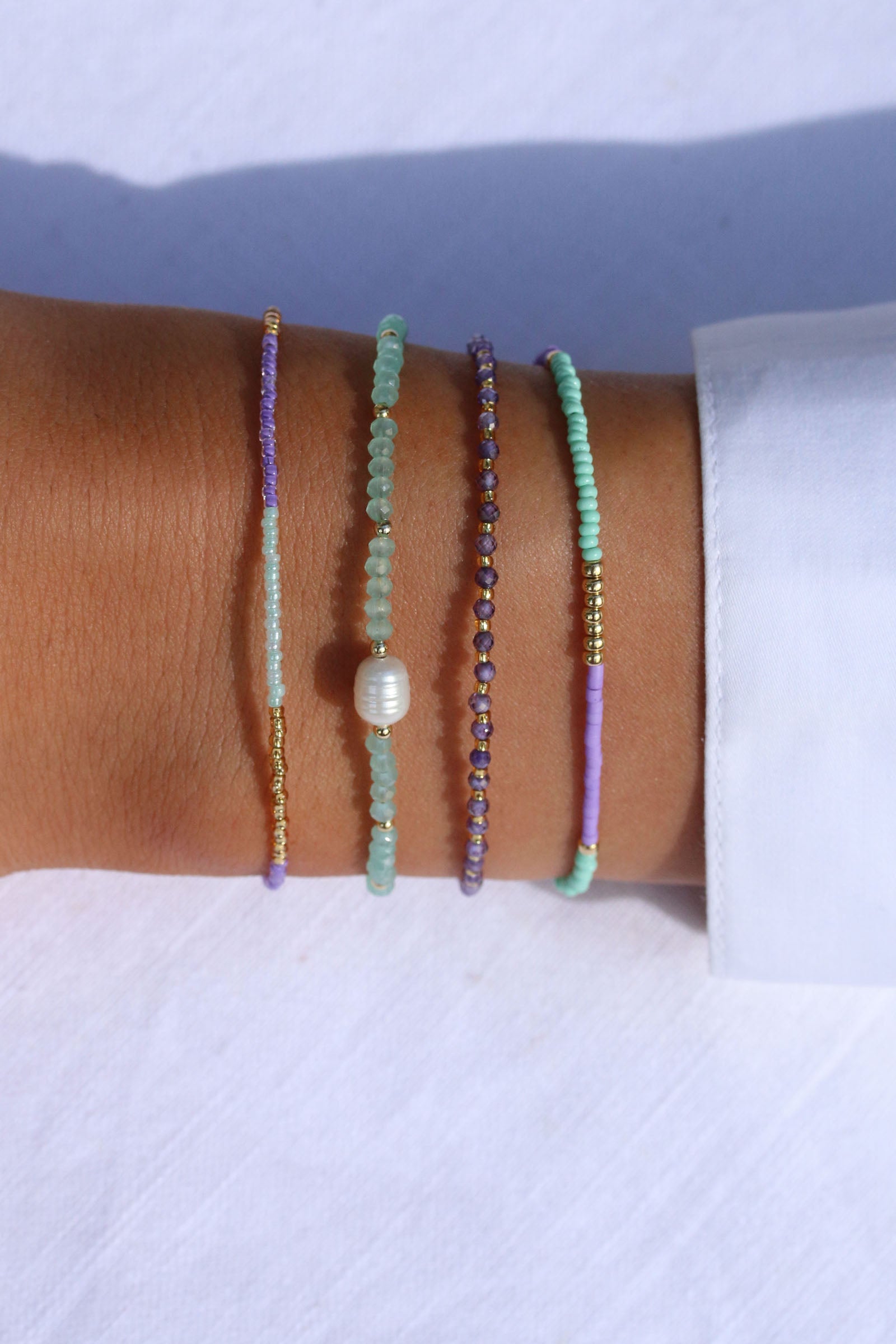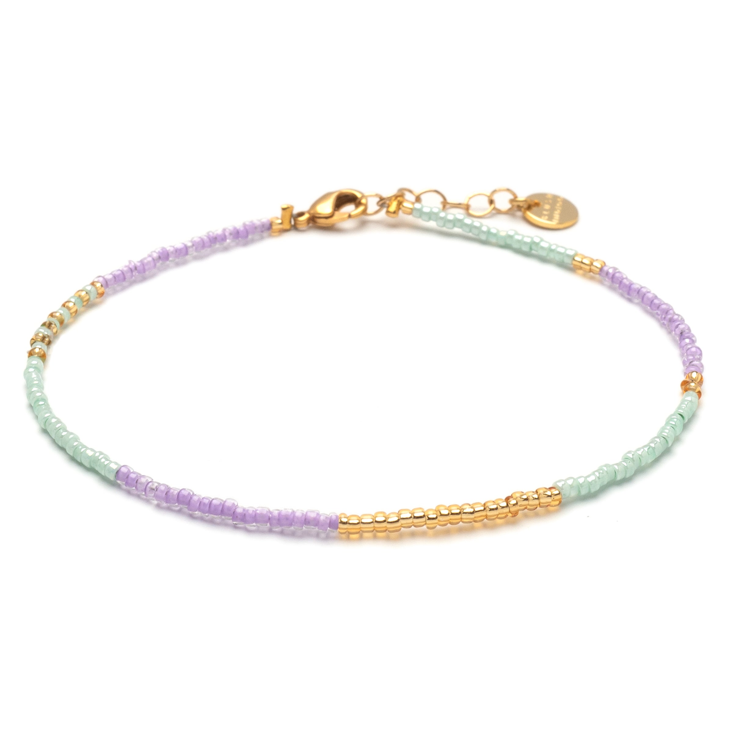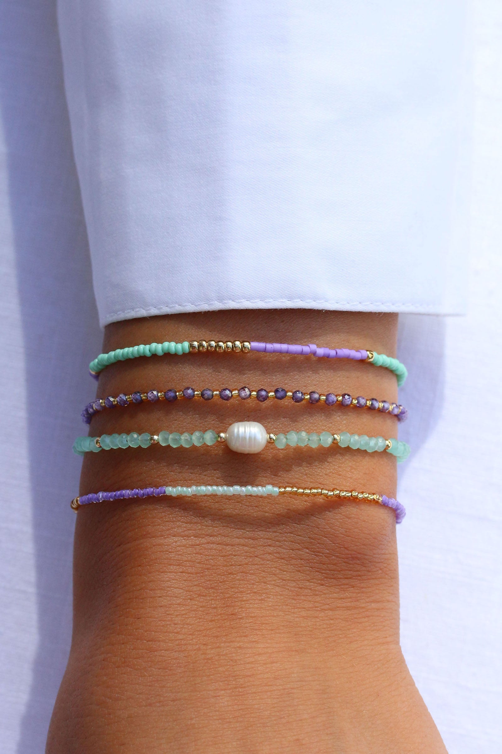 The Be Blush Bracelet will soon become indispensable on your wrist. For our golden Mint Purple we mixed together beads in Fresh Mint, Glossy Purple and Gold in an interval of 1,5 to 2,5 cm.