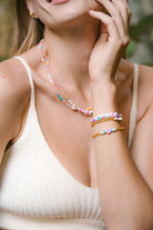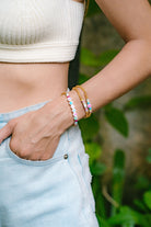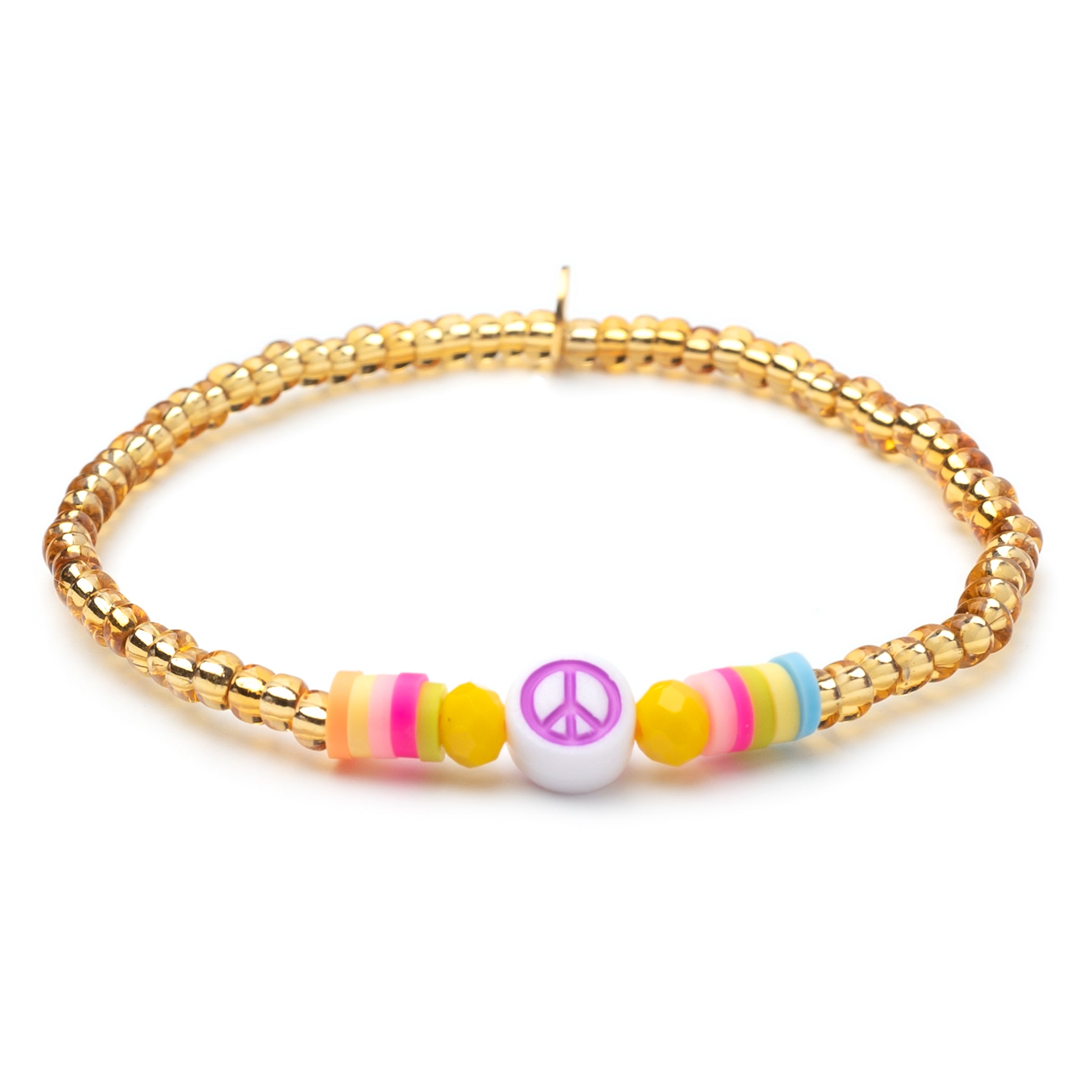 Say I love you! The gold arm candy with one heart bead is cute to nibble on. It is framed by colorful crystal beads and colorful rubber Heishi Pearls. All beads are randomly selected. This means that no two bracelets are alike.