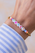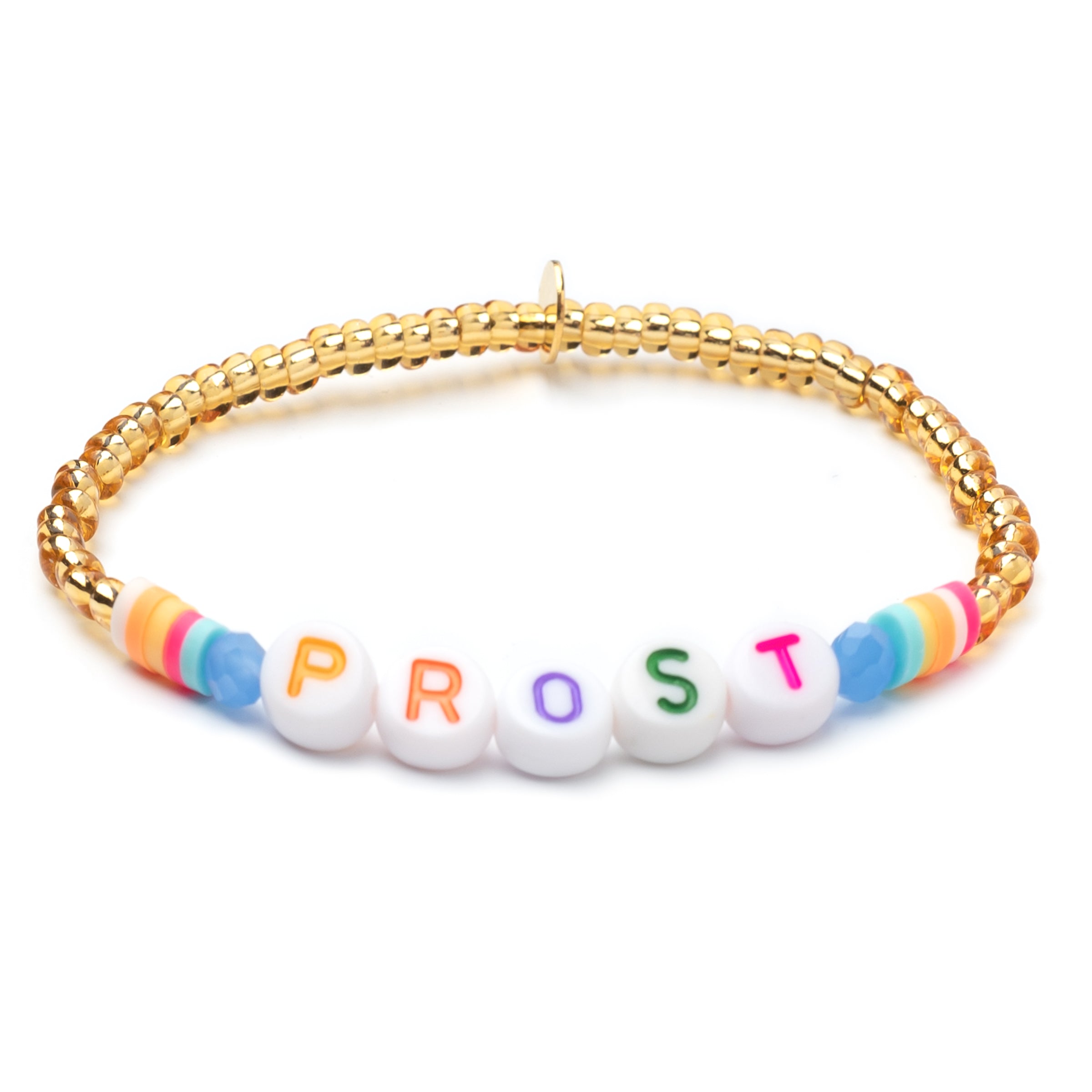 Cheers, Baby! The gold arm candy with dark letter beads is cute to nibble on. The round letters are framed by colorful crystal beads and colorful rubber Heishi Pearls. All beads are randomly selected. This means that no two bracelets are alike.