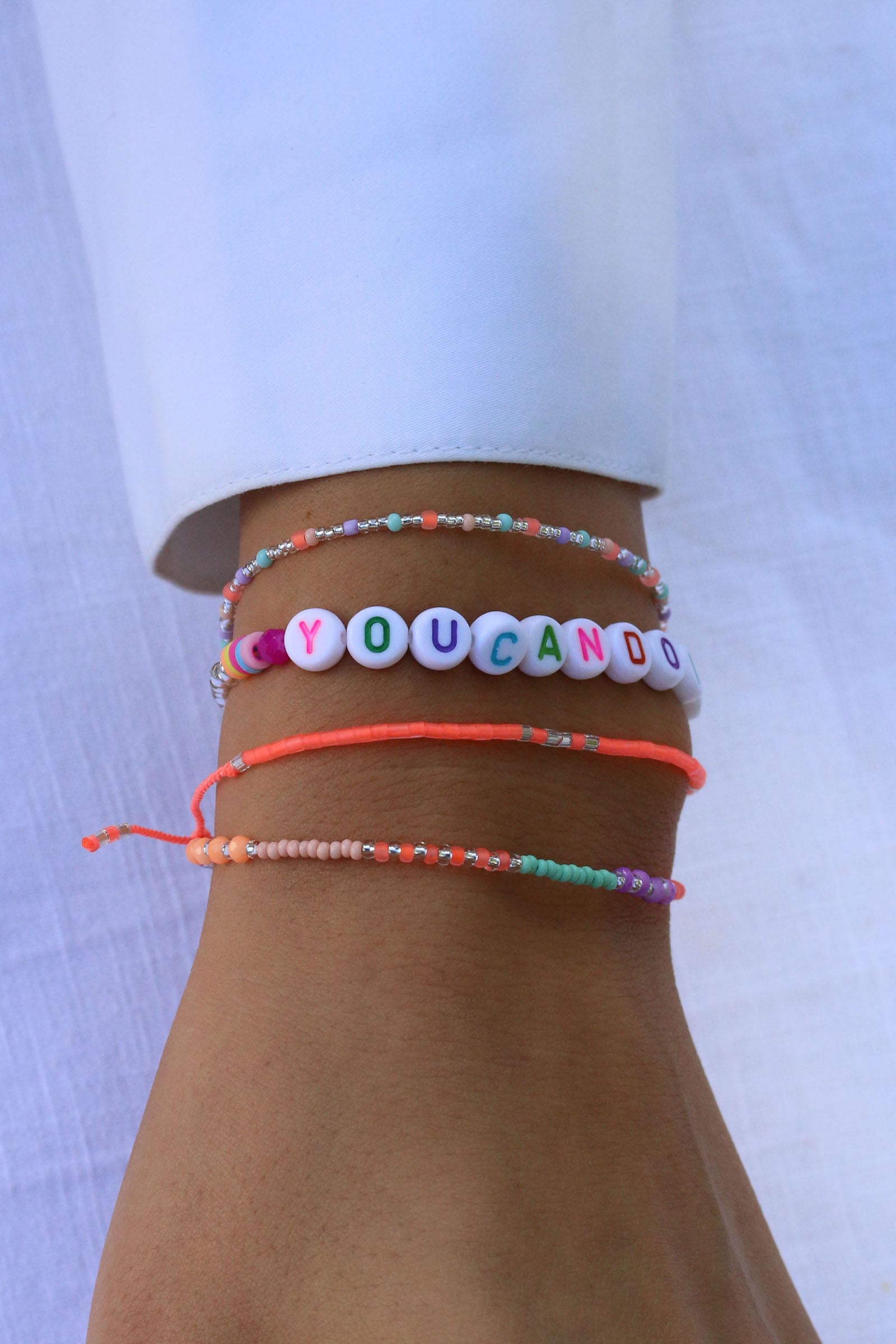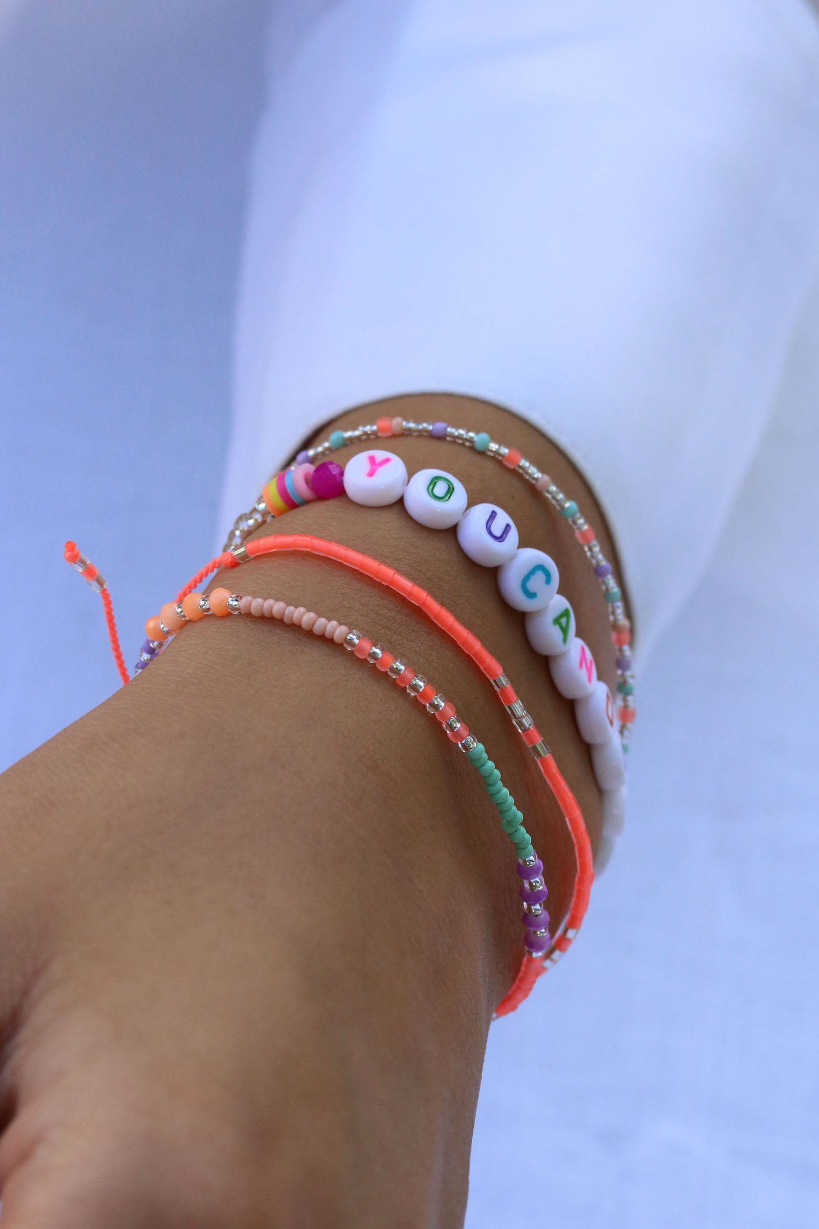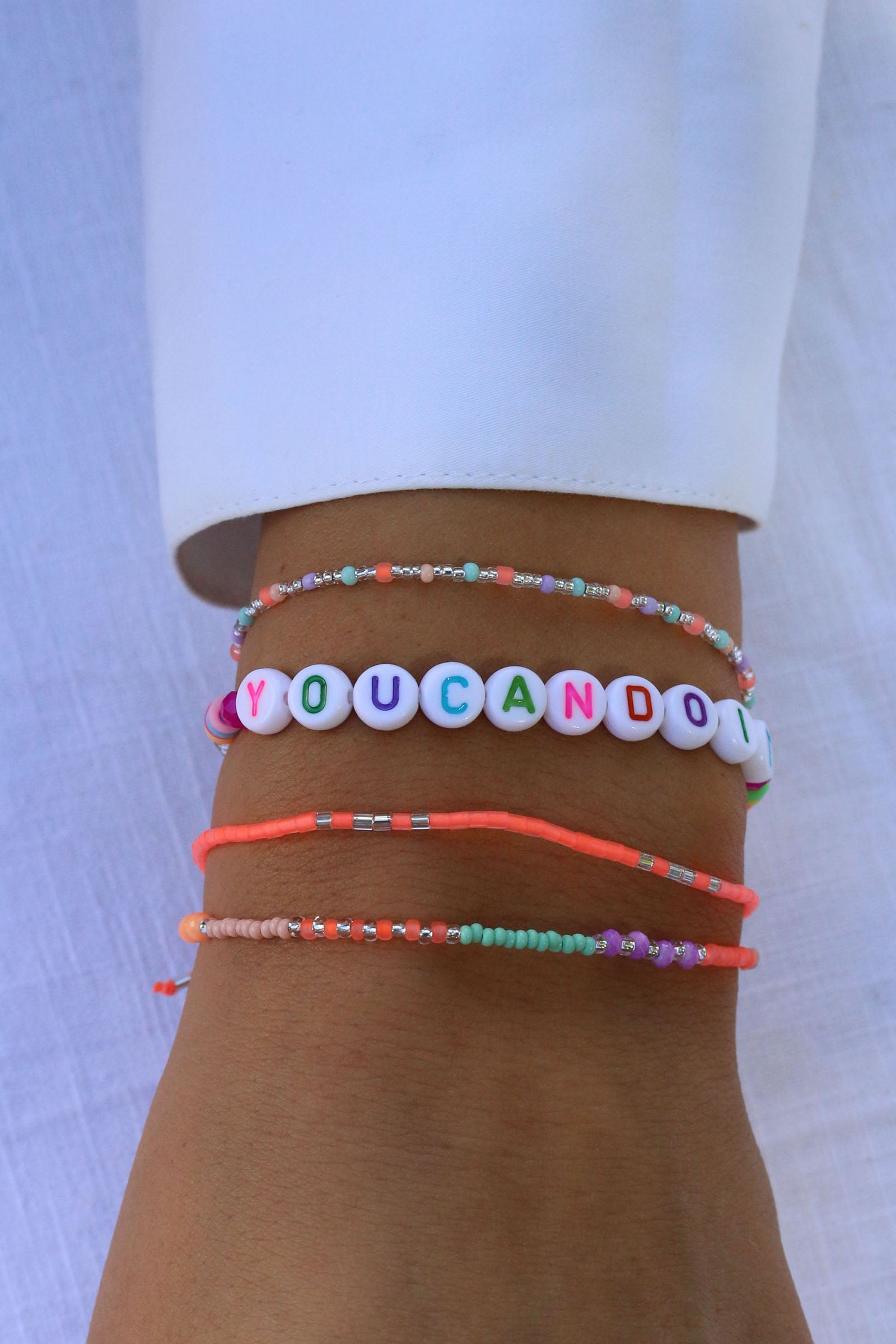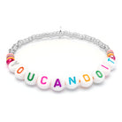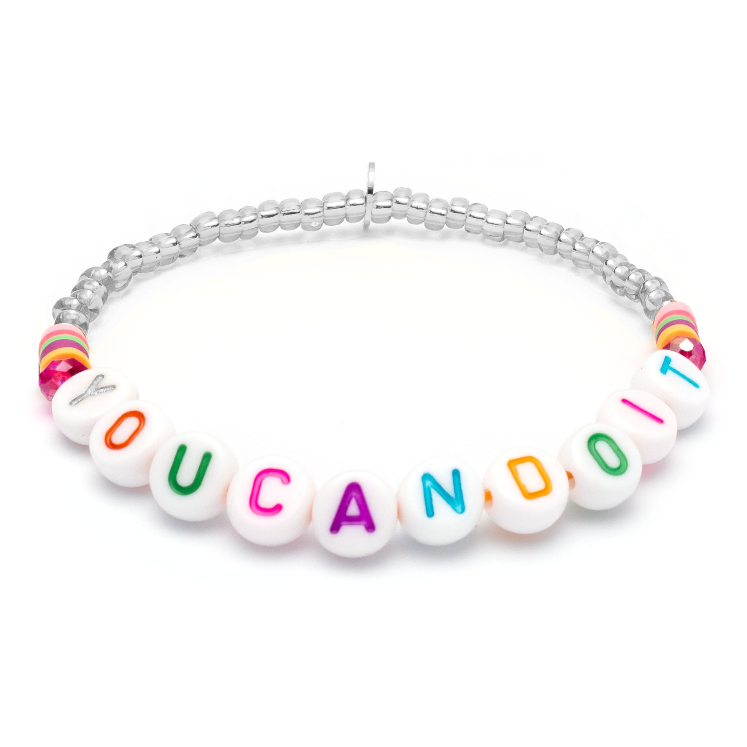 Yes, you can do it! The silver arm candy with white letter beads is cute to nibble on. The round letters are framed by colorful crystal beads and colorful rubber Heishi Pearls.