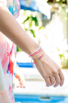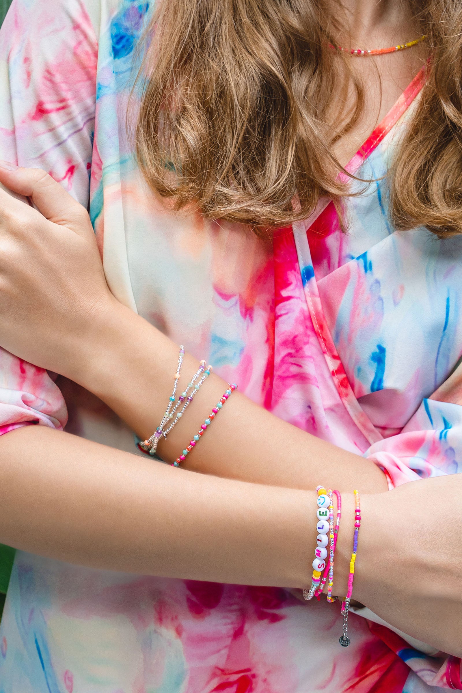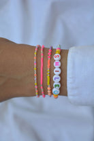Smile when you're happy! The gold arm candy with white letter beads is cute to nibble on. The round letters are framed by colorful crystal beads and colorful rubber Heishi Pearls. All beads are randomly selected. This means that no two bracelets are alike.