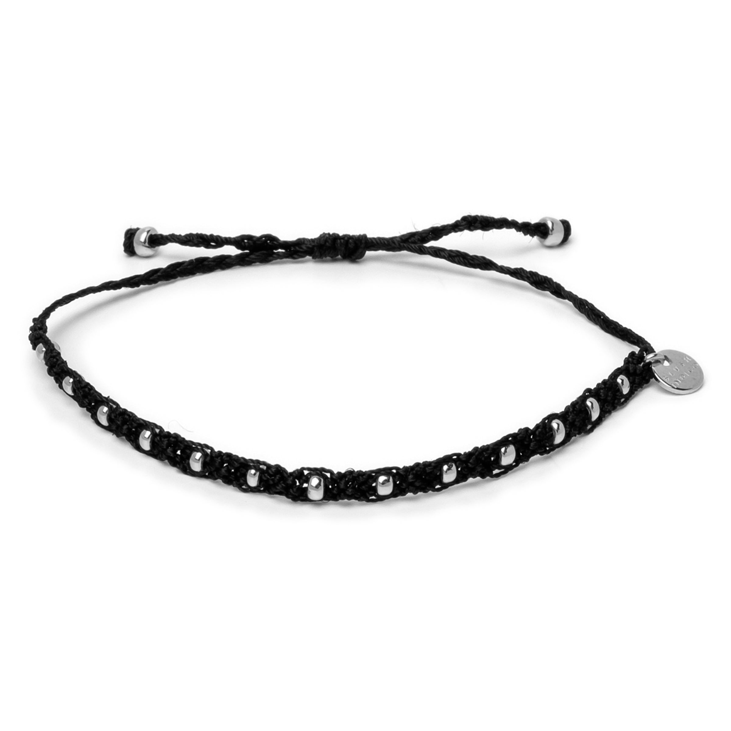 Our Cleo monochrome macramé bracelet comes in all the colors of the rainbow. The model in black has an adjustable knot fastener and end pieces decorated with pearls.