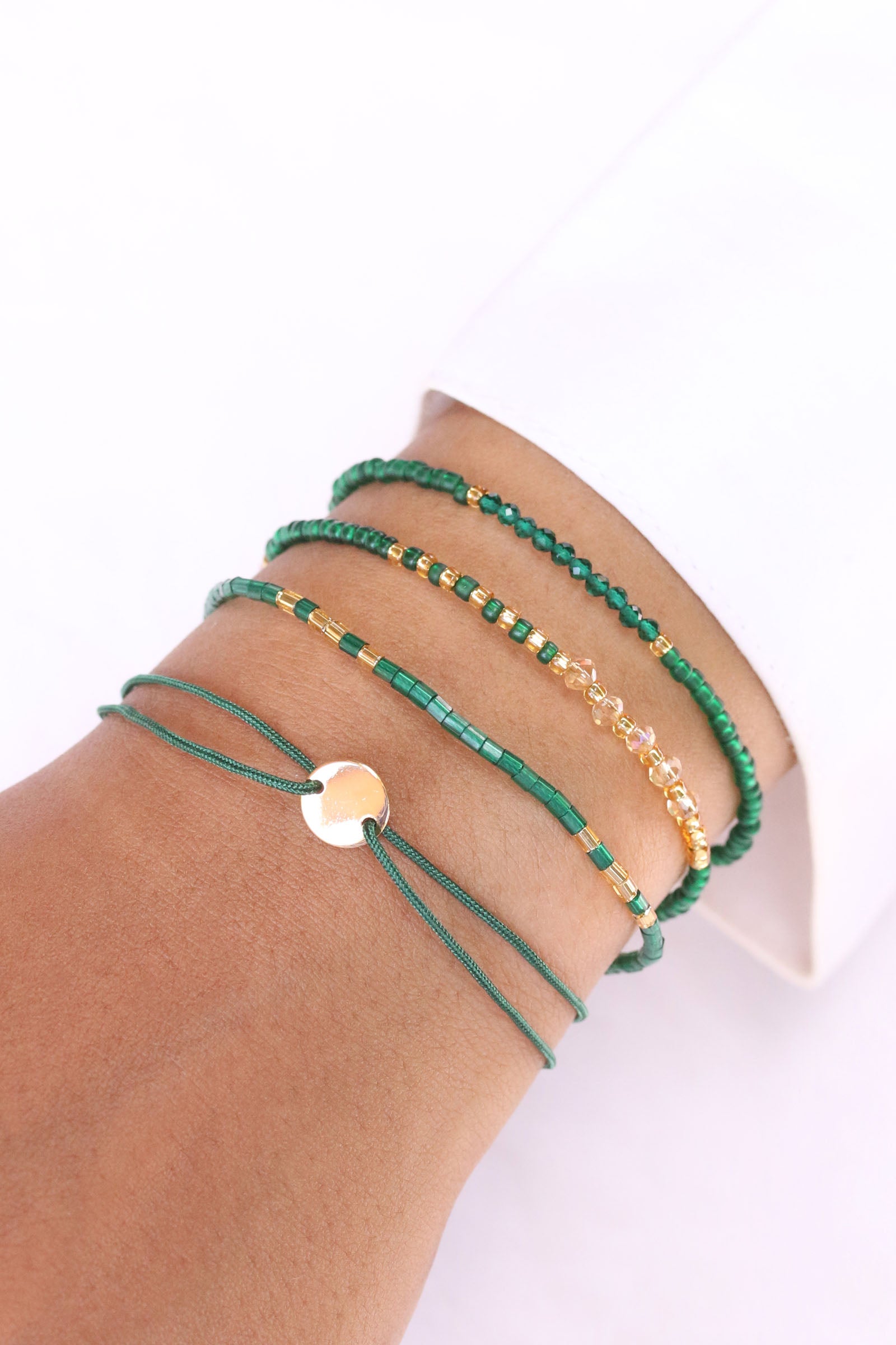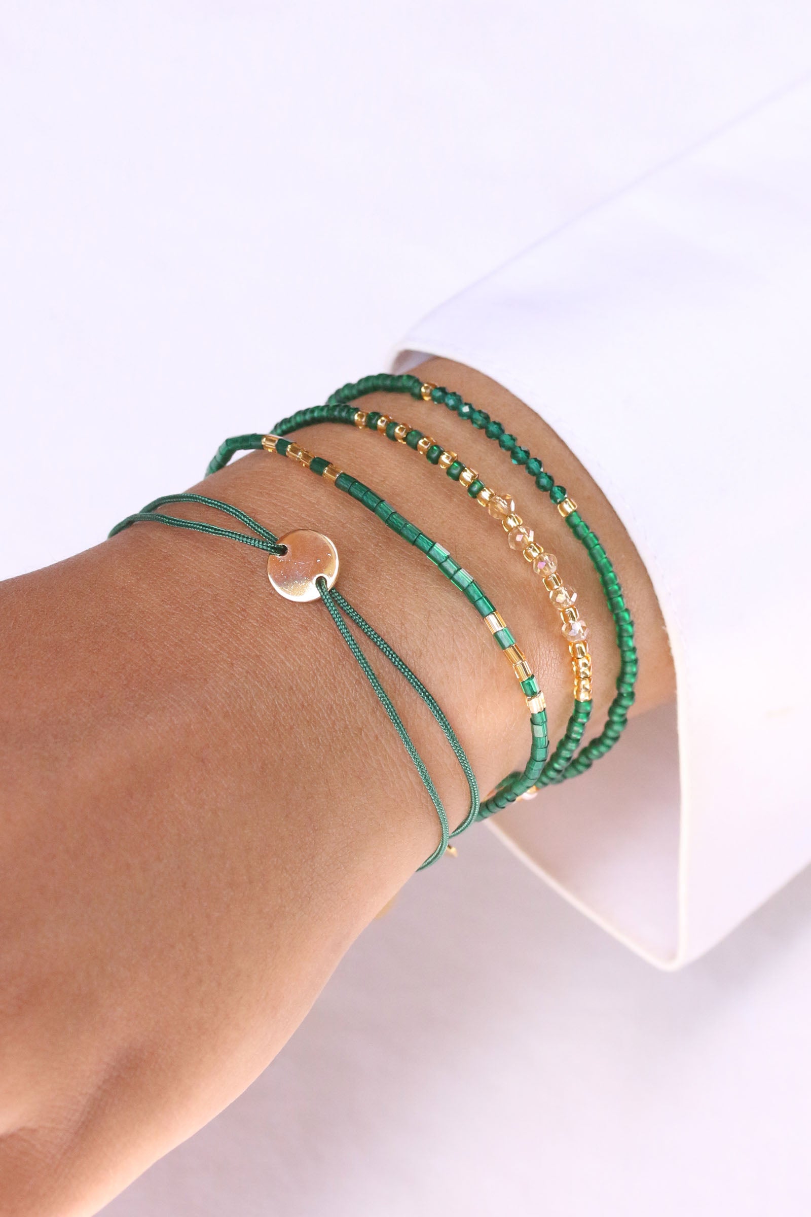 A small disc held together by nylon yarn in Pistachio Green will make this bracelet your new darling.