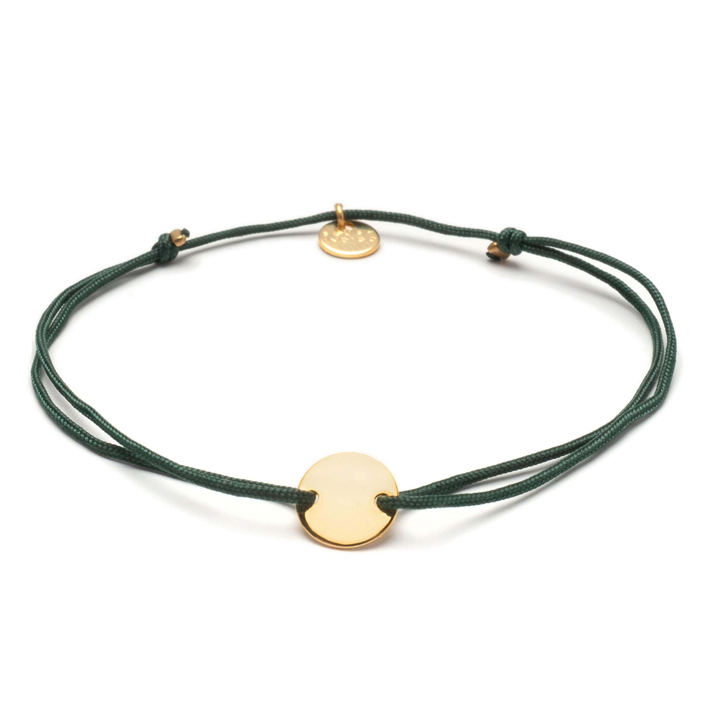 It is adjustable in size. You can choose between a variety of different string colors. The gold plated disc has a size of 8 mm. All metal pieces are 24k gold or silver dipped brass made in Germany and Italy.