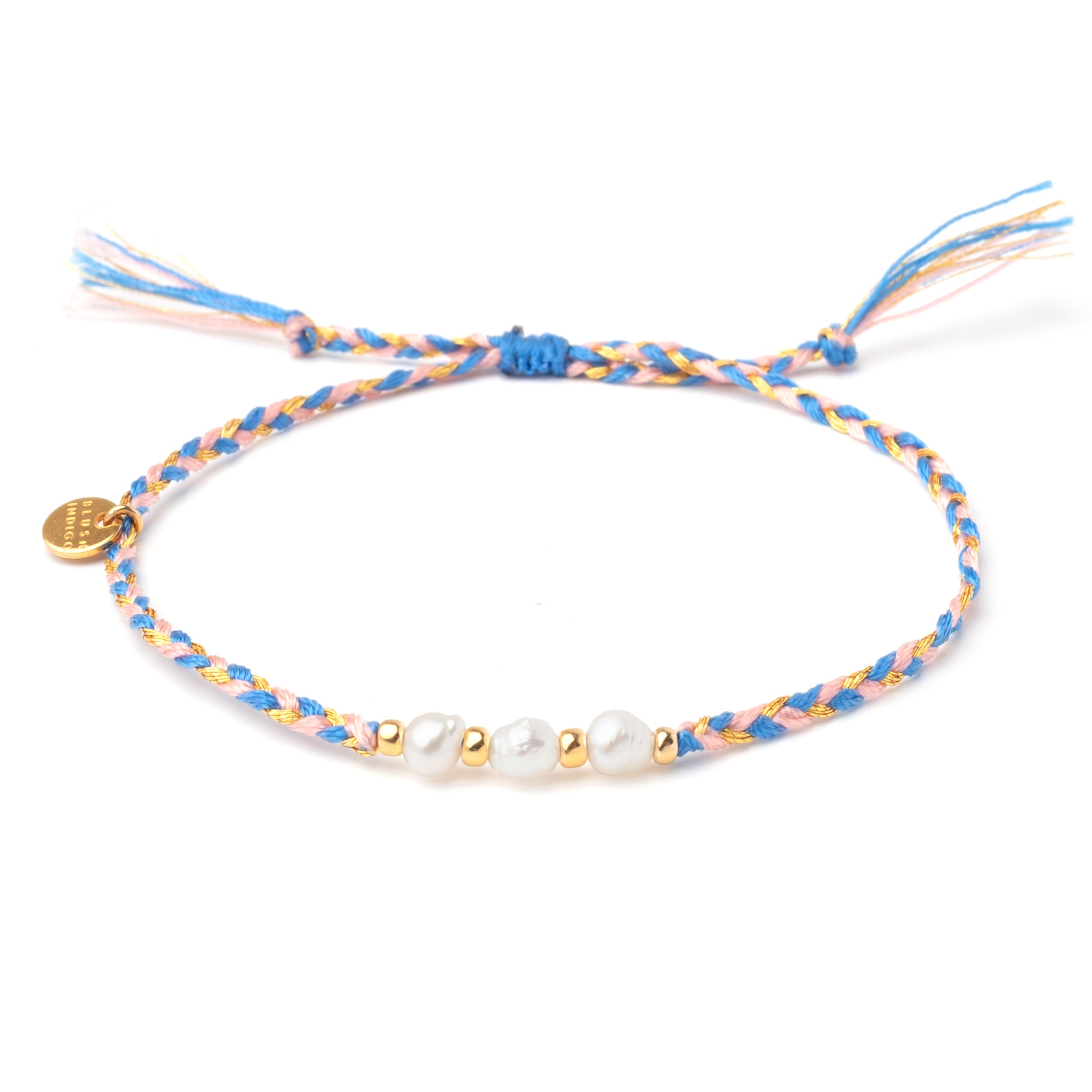 Our Dolce bracelet is a braided color sensation in the colors ocean green, beige and gold. Three freshwater pearls threaded in the middle bring a summer vacation mood to your wrist.