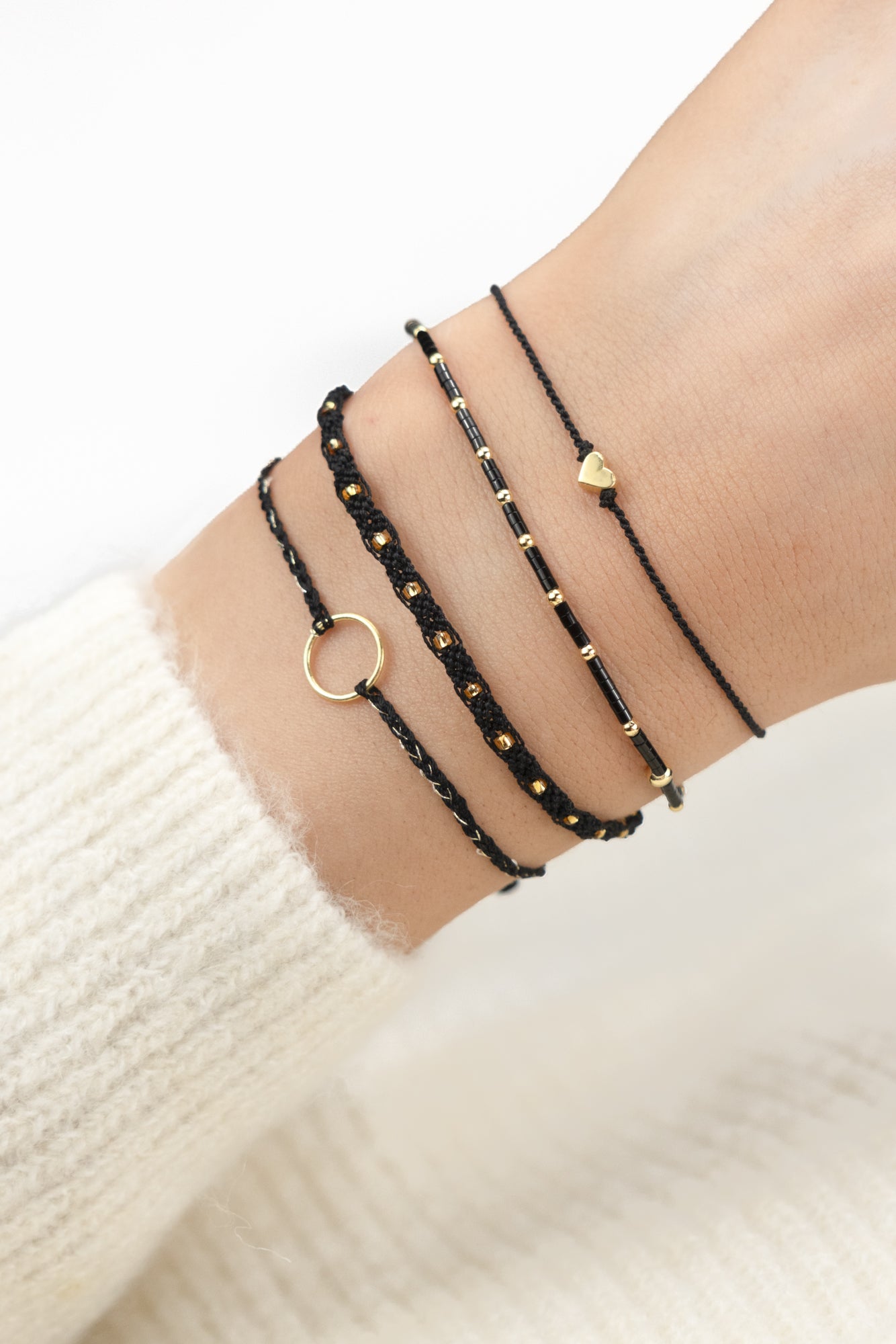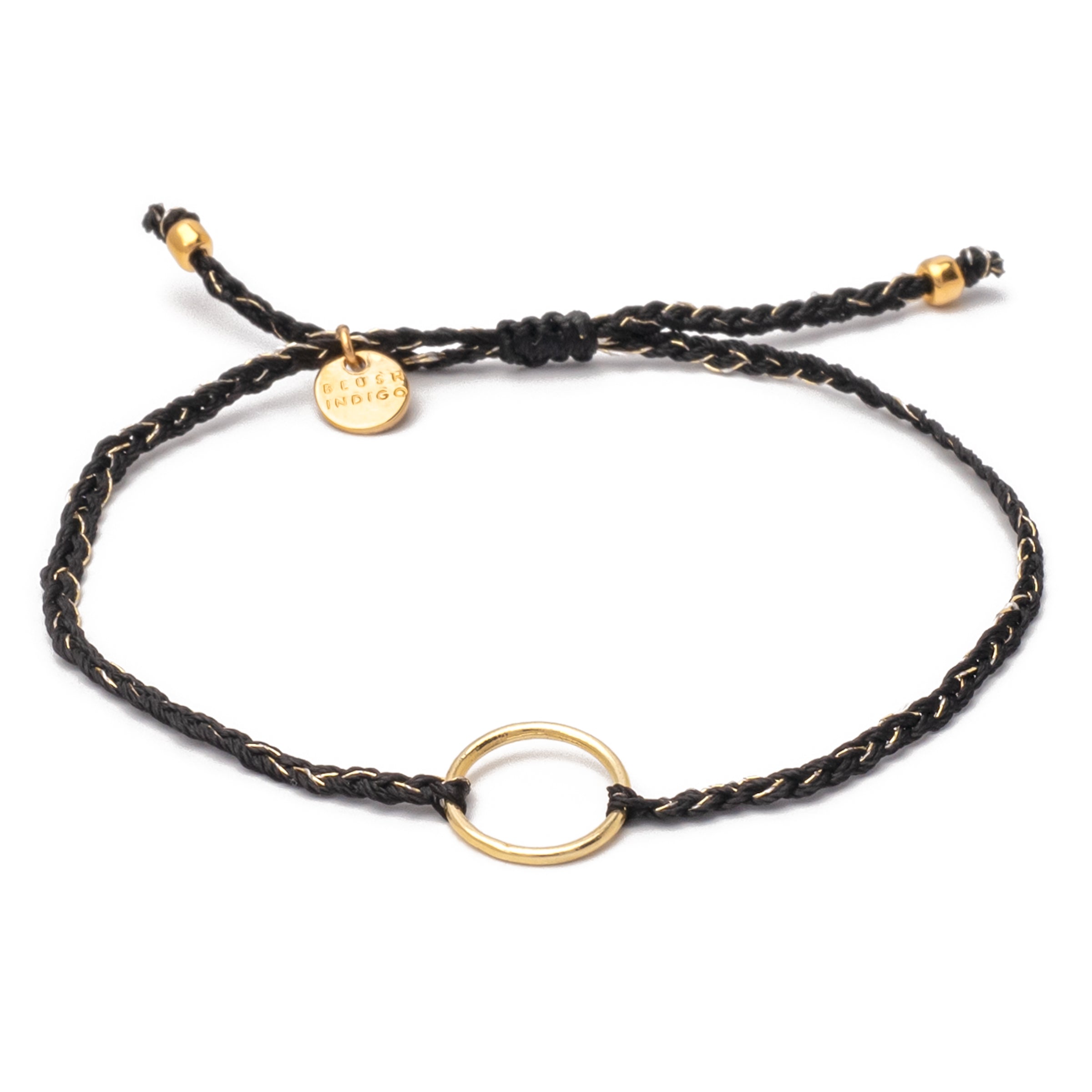 Our braided karma bracelet with circle pendant and interwoven gold threads brings an extra dose of sparkle to your wrist.