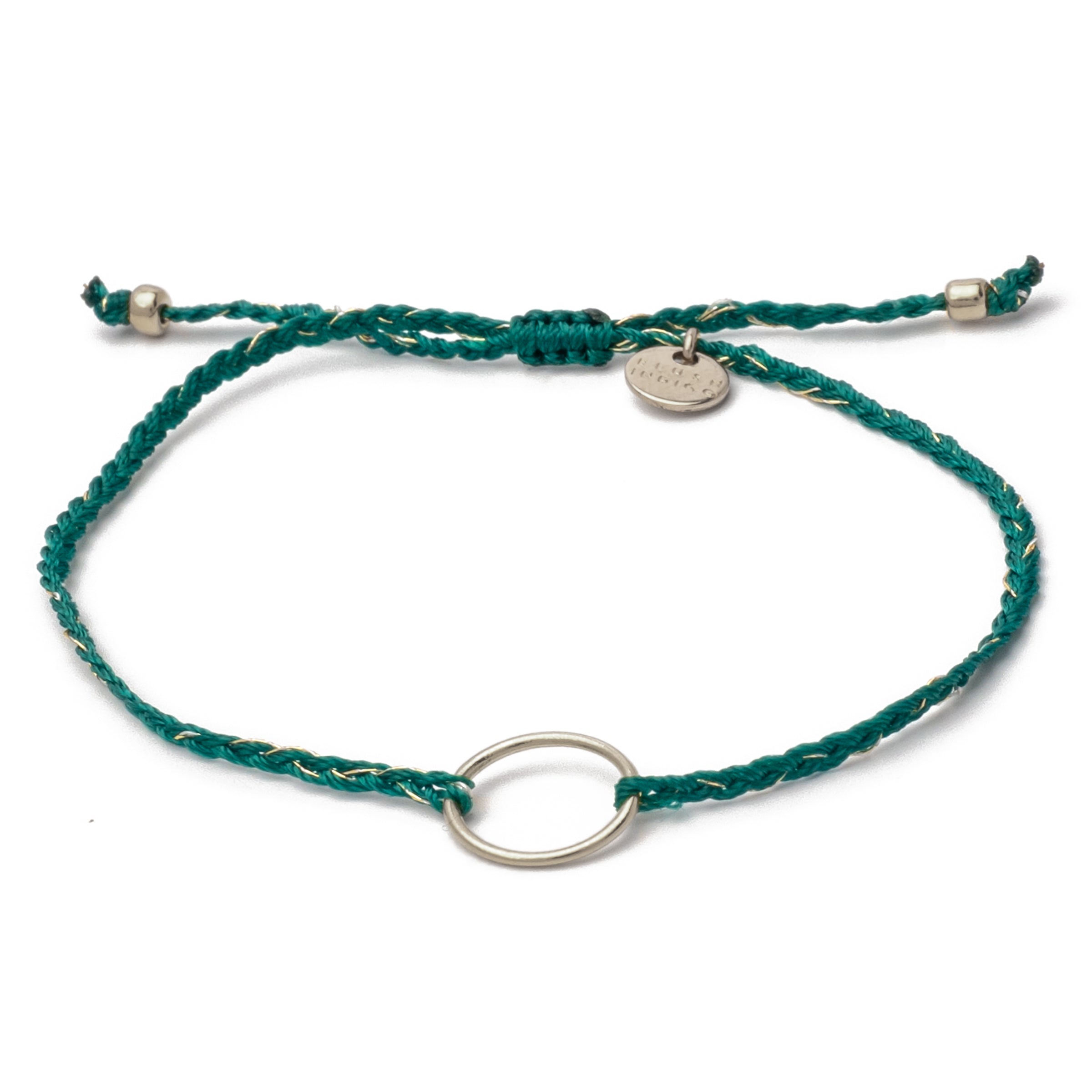 Our braided karma bracelet with circle pendant and interwoven gold threads brings an extra dose of sparkle to your wrist.