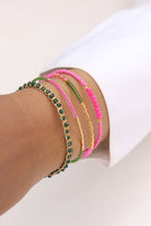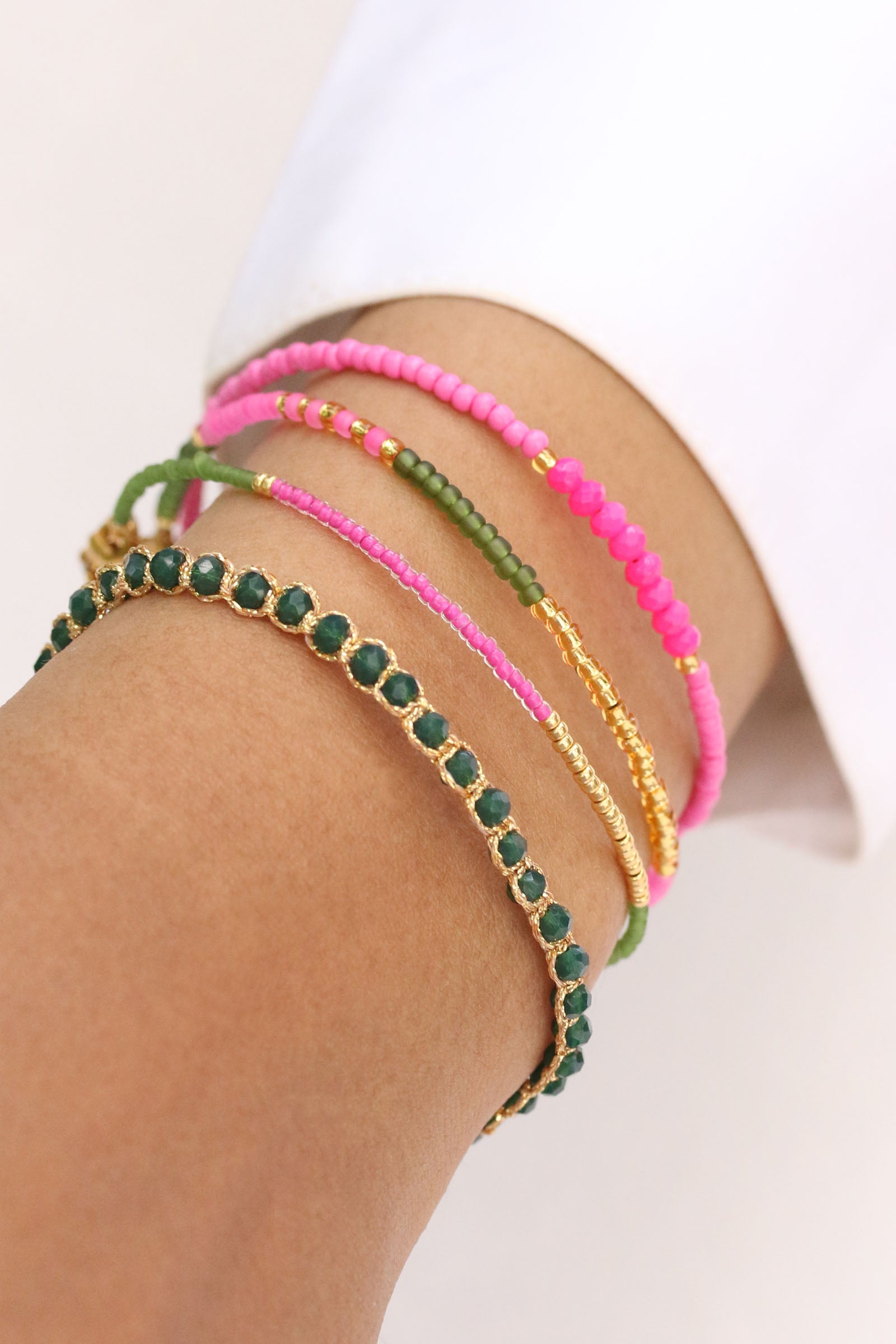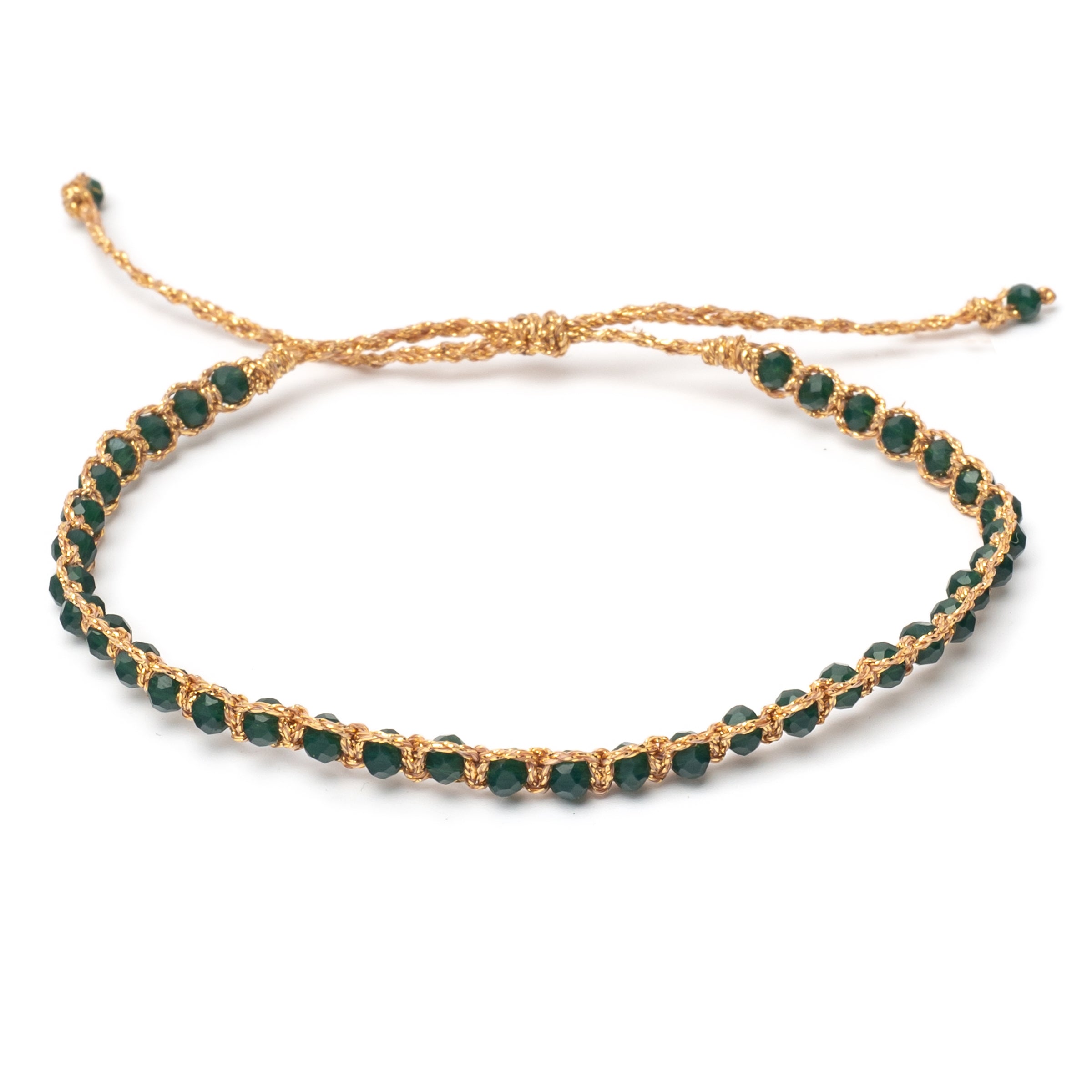 Your time to shine! Our Mino bracelet combines bold color accents with an irresistible glow. The matt emerald green crystals are knotted in rows with glittering gold-colored textile to create an elegant bracelet.