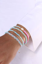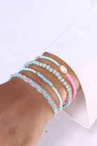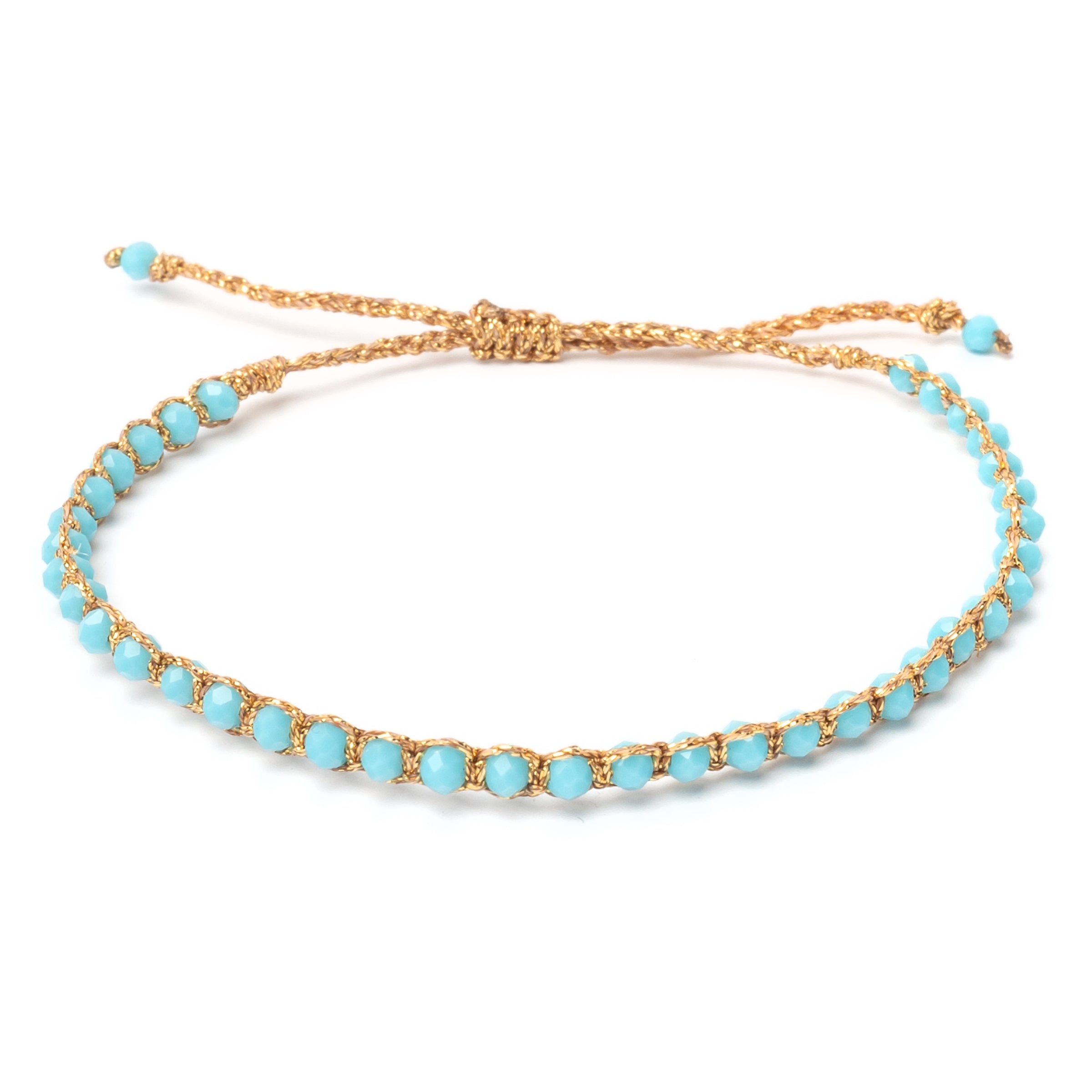 Your time to shine! Our Mino bracelet combines soft color accents with an irresistible glow. The matt turquoise crystals are knotted in rows with glittering gold-colored textile to create a sparkling bracelet.
