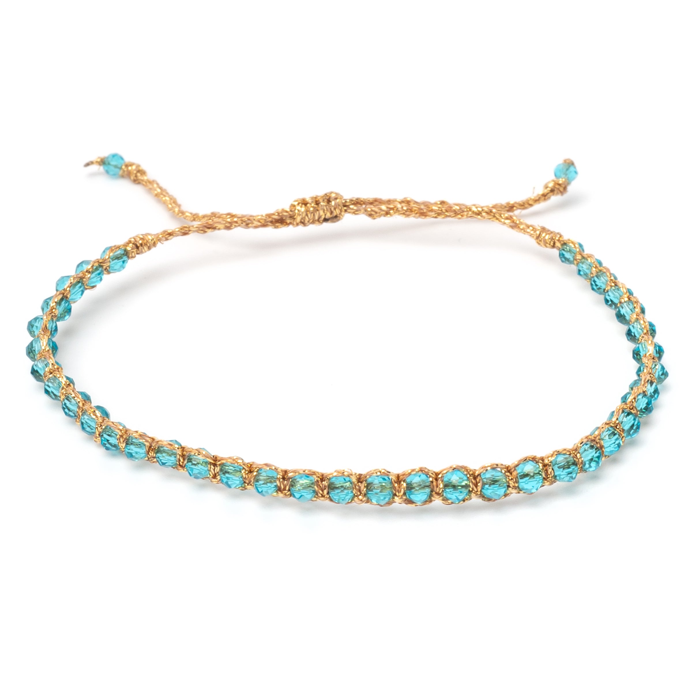 Your time to shine! Our Mino bracelet combines soft color accents with an irresistible glow. The turquoise glass crystals are knotted in rows with glittering gold-colored textile to create a sparkling bracelet.