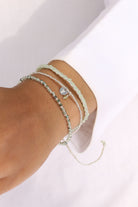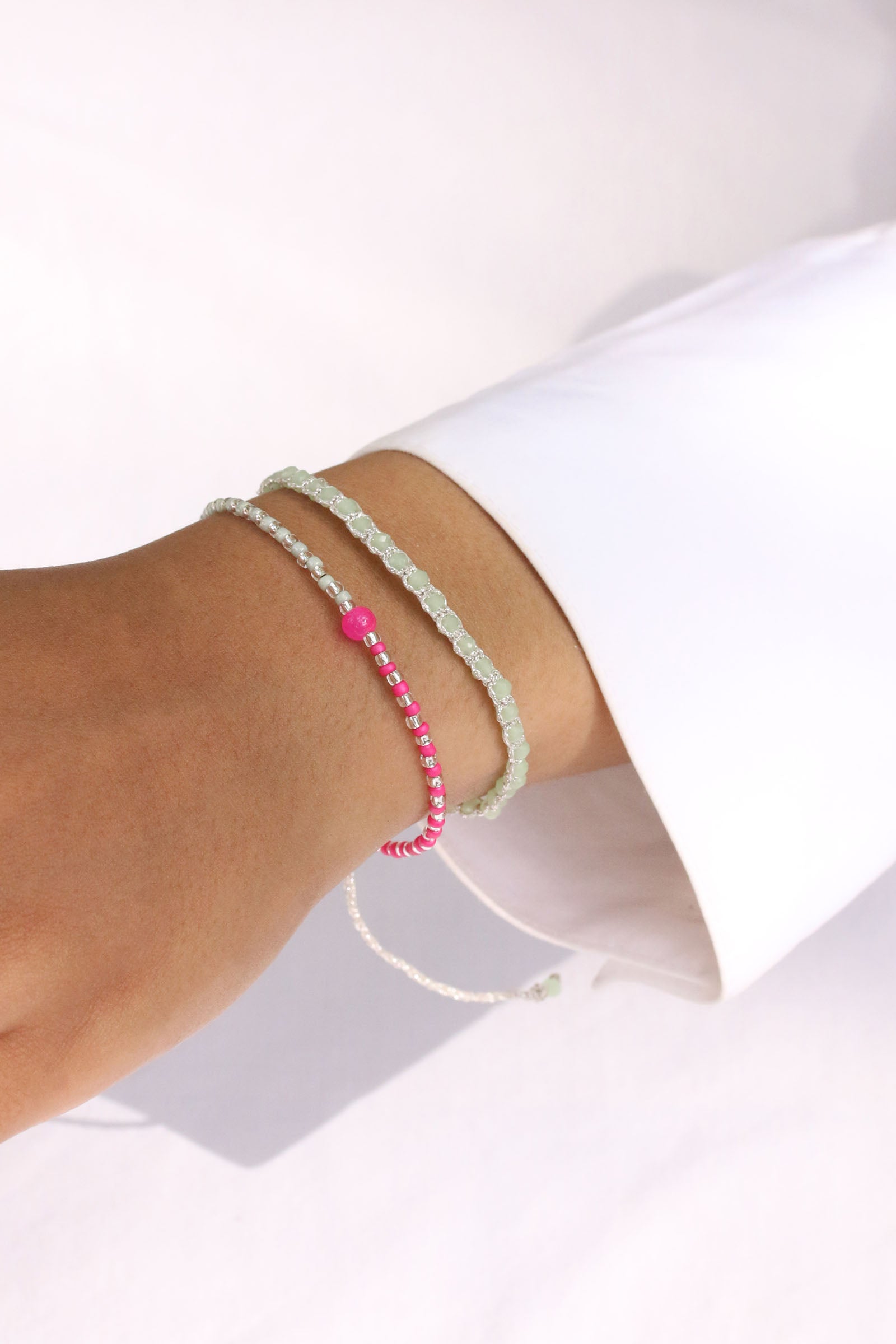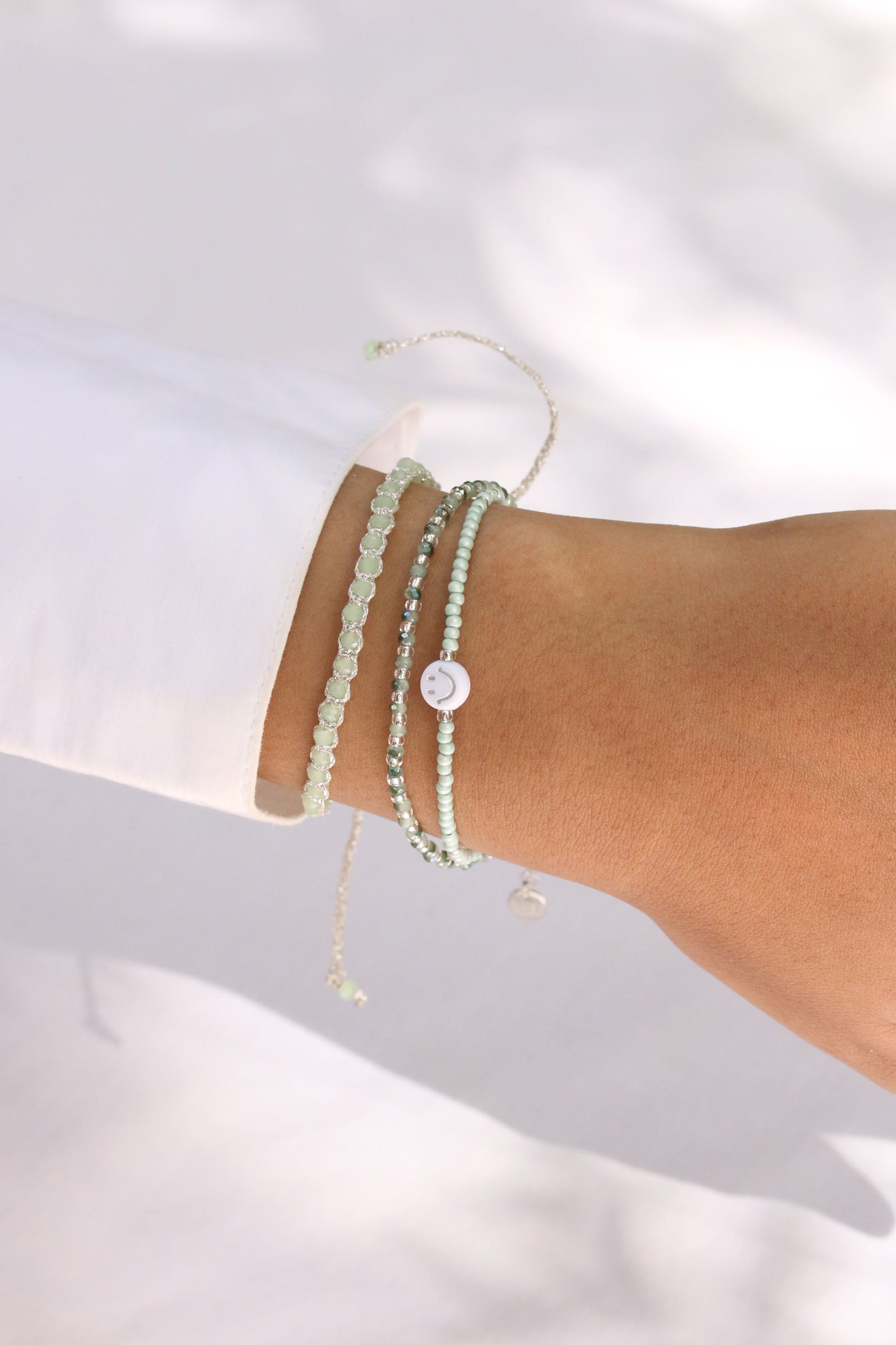 Your time to shine! Our Mino bracelet combines soft color accents with an irresistible glow. The matt light green crystals are knotted in rows with glittering silver-colored textile to create an elegant bracelet.