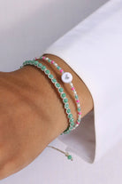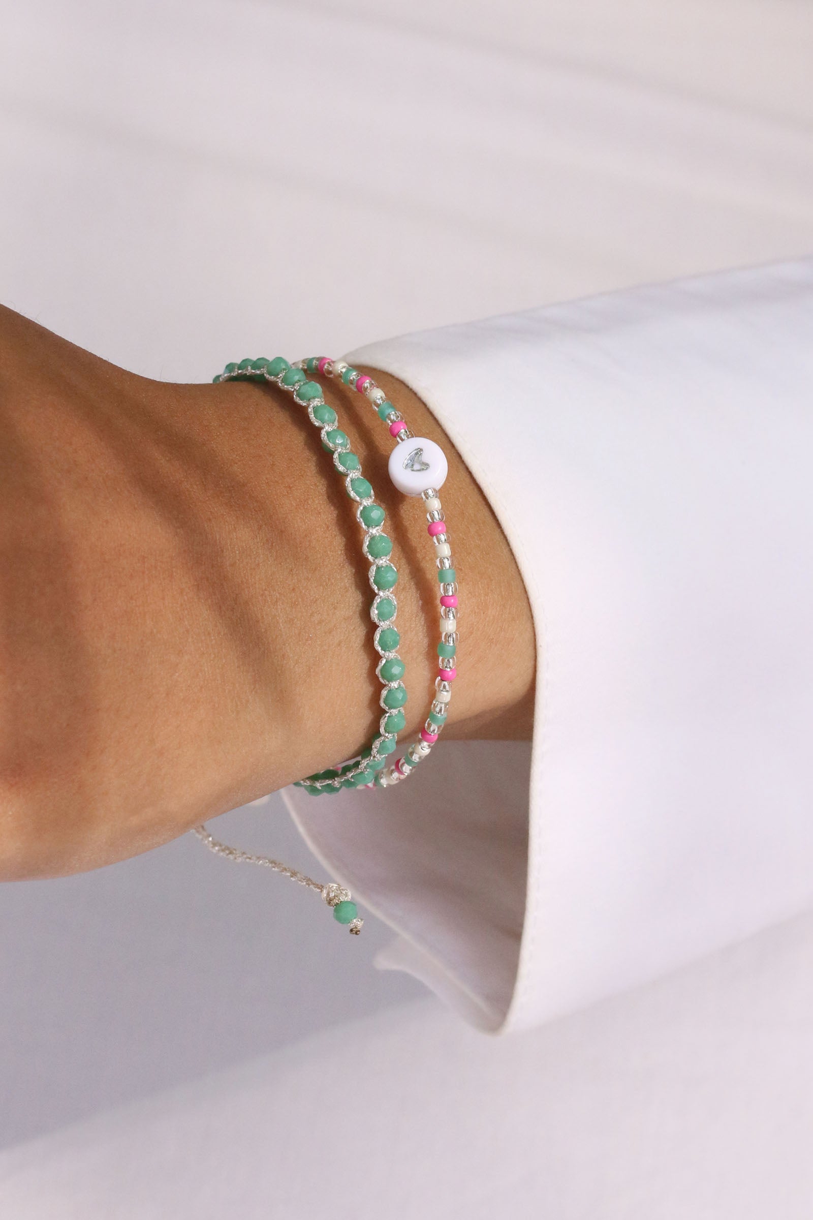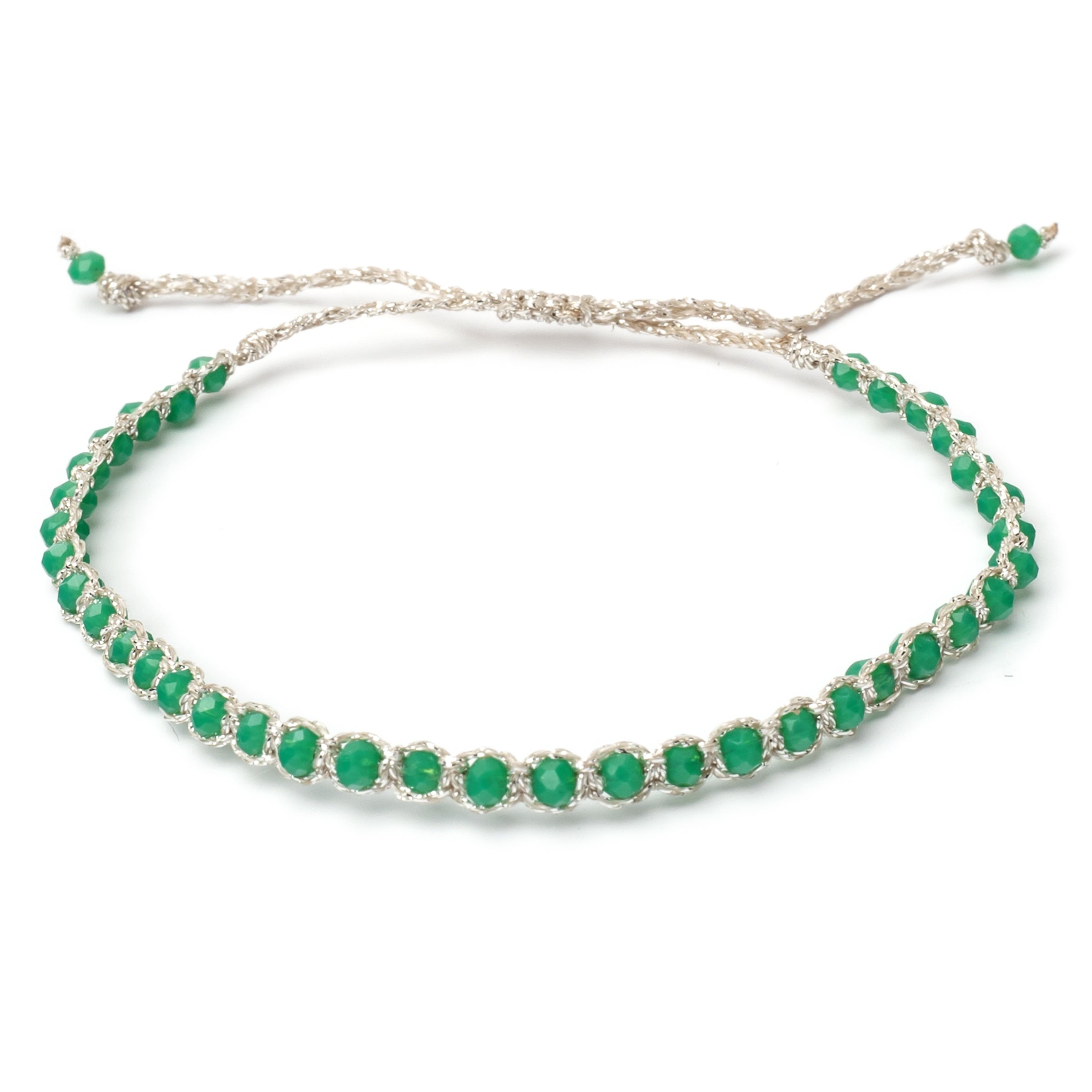 Your time to shine! Our Mino bracelet combines soft color accents with an irresistible glow. The matt grass green crystals are knotted in rows with glittering silver-colored textile to create an elegant bracelet.