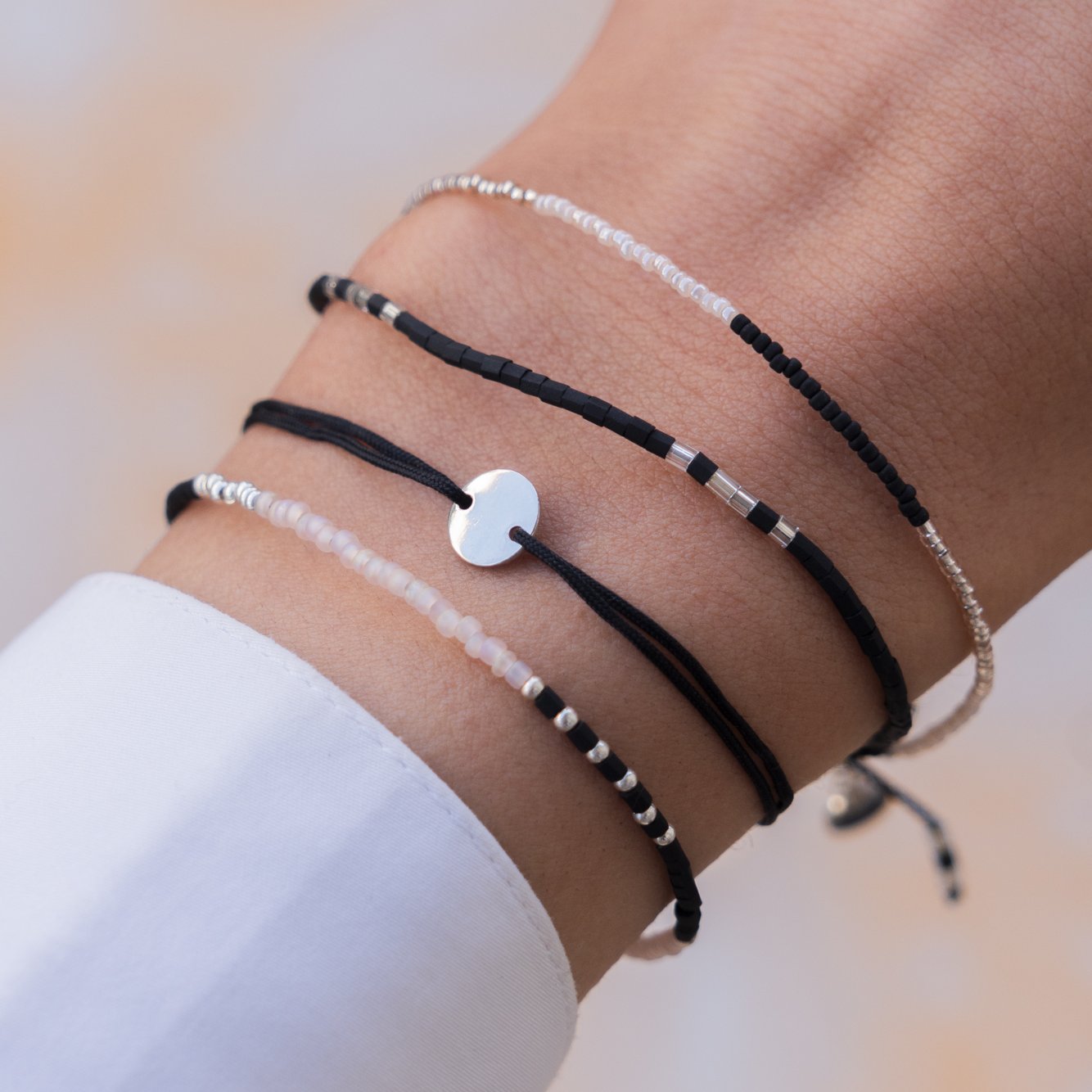 The silver Black Velvet bracelet mix consists of four ribbons in matte black and cream. Occasional silver beads provide an elegant finish.