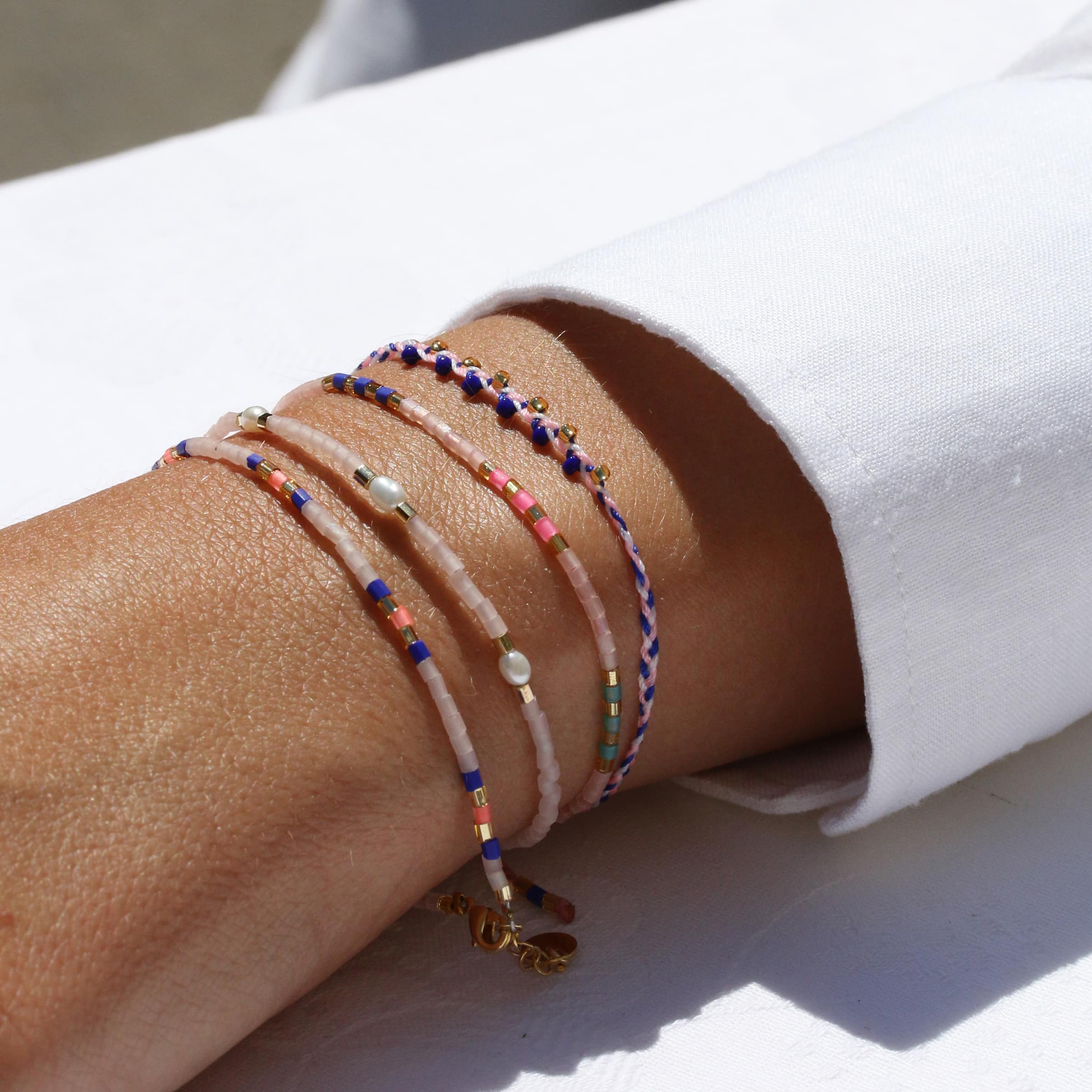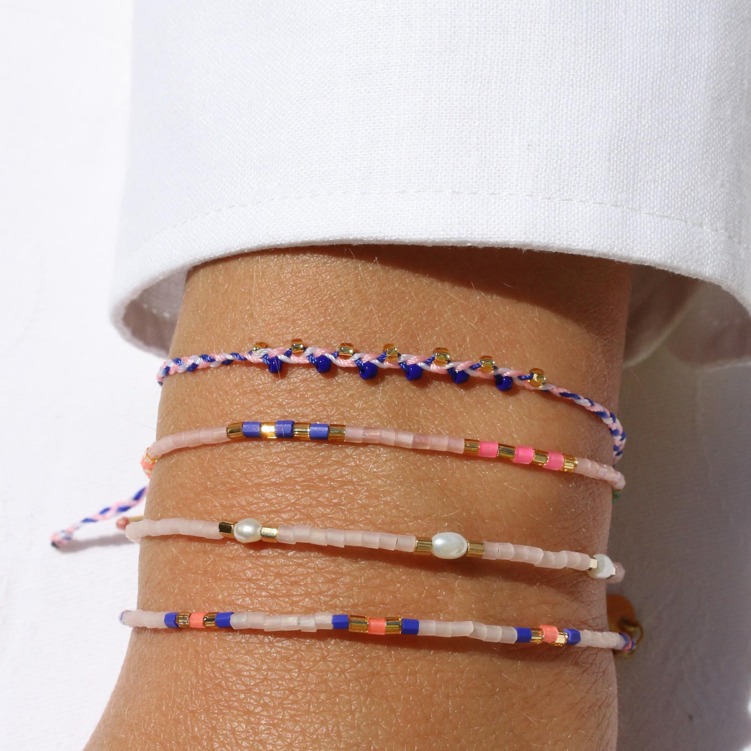 Blush My Heart! Spotlight on our favorite color combo Blush Rose and Indigo Blue. One Amalfi bracelets with beads in Frosted Blush, Indigo Blue, Neon Coral and Gold teams up with a Sweet String bracelet, a Capri bracelet made with 11 freshwater pearls and a Take a Twist bracelet in our signature colors.
