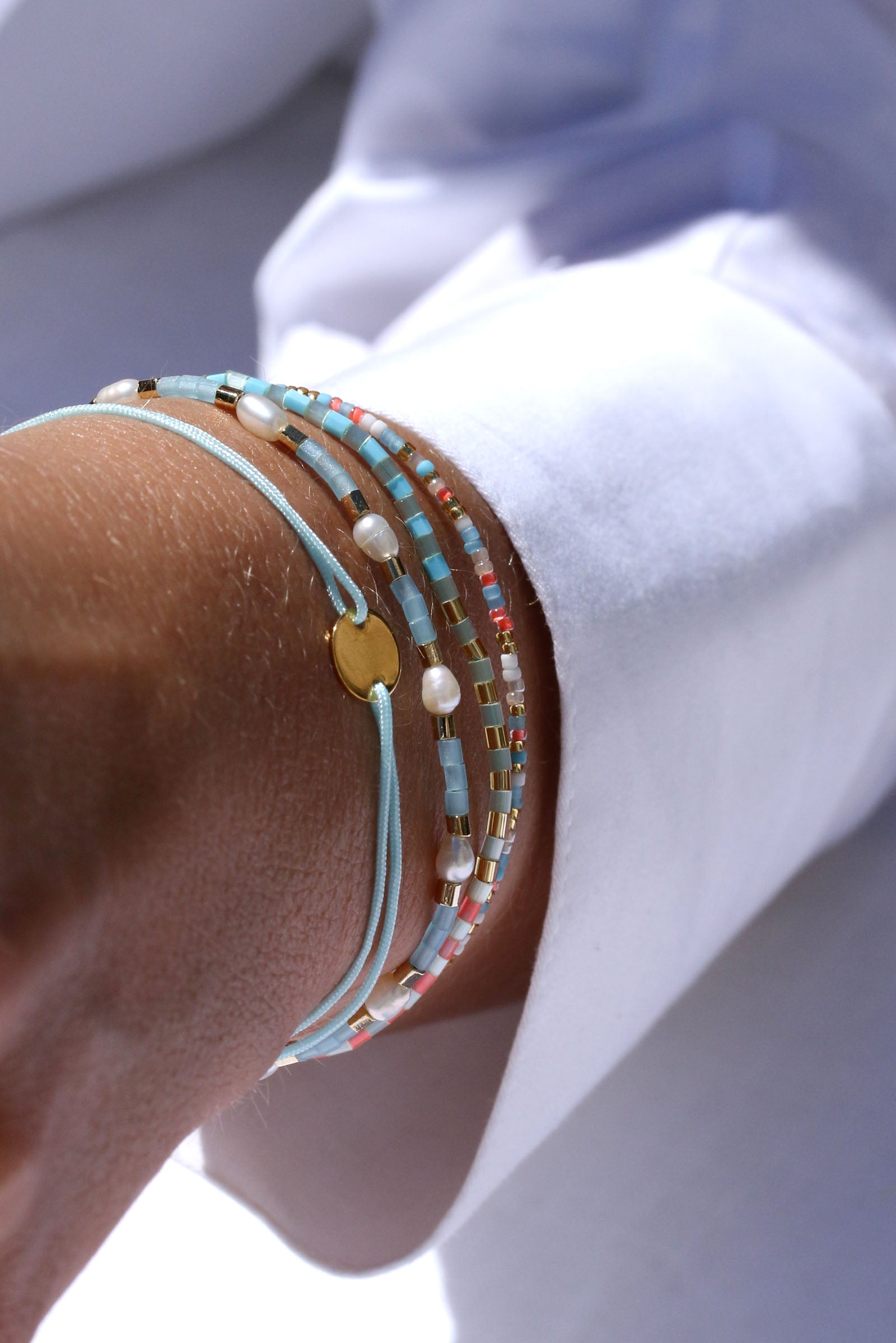 Beach walks are mandatory with our bracelet stack Cape Cod in light blue hues with coral highlights and scattered gold beads for an elegant finish. Eleven tiny freshwater pearls mixed together with frosted beads in Sky Blue make Cape Cod picture perfect.