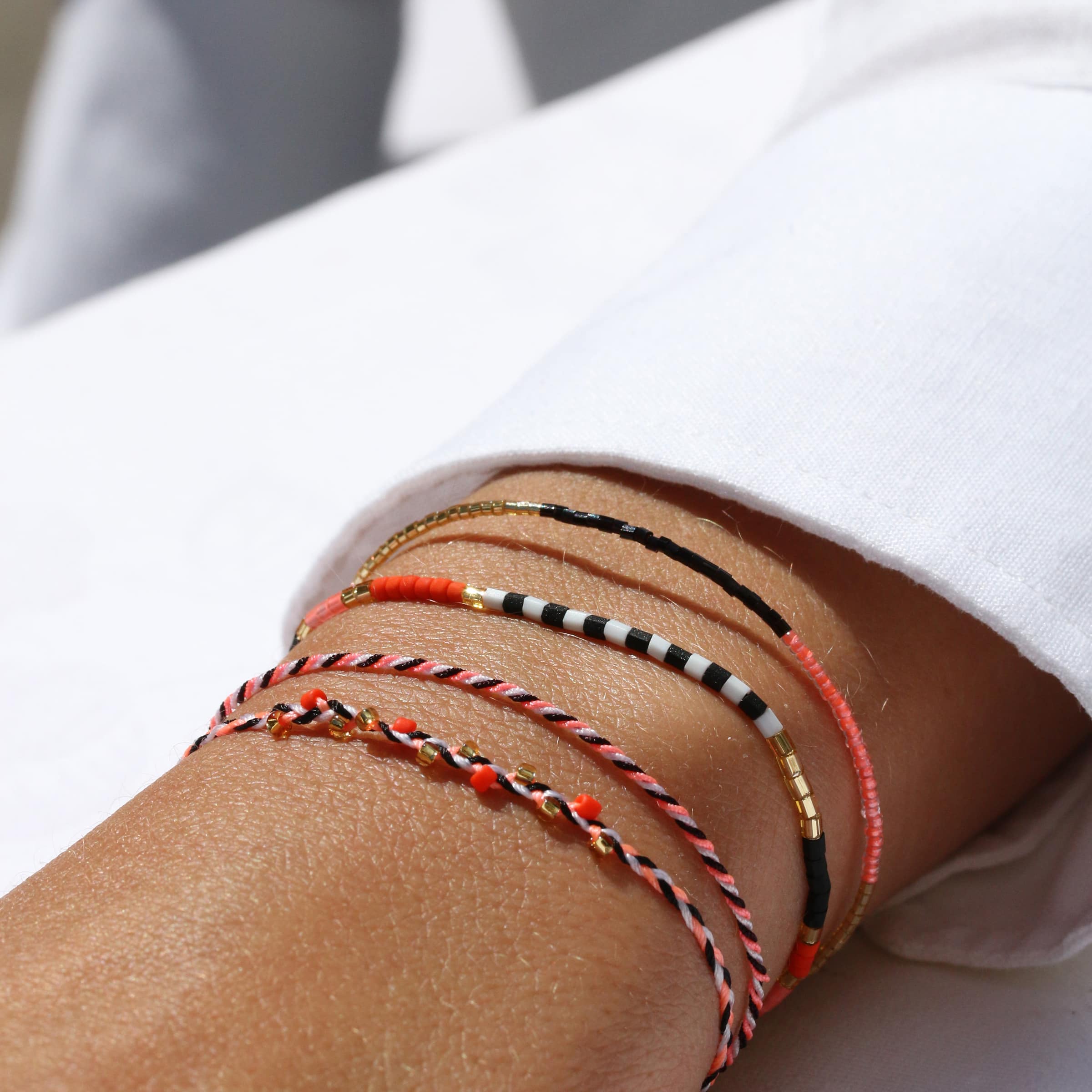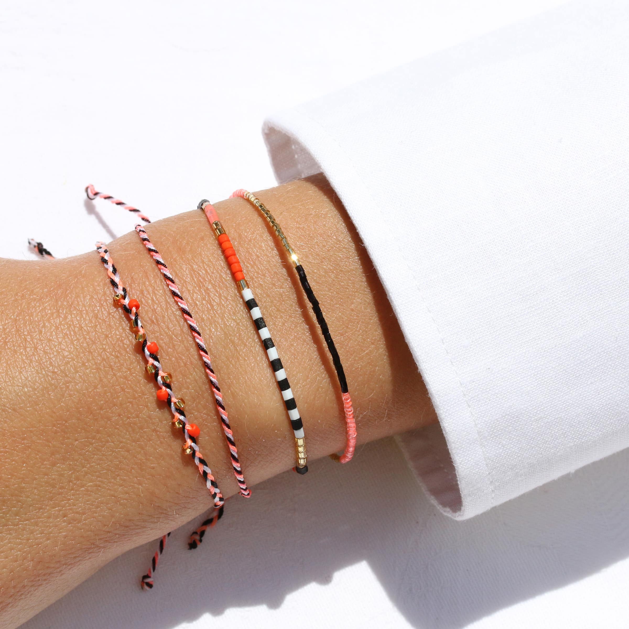 Let's play a game of domino! One Be Blush bracelet with beads in Glossy Pink, Black and Gold teams up with one Sweet String, Take a Twist and True Temple bracelet made of twirled yarn in black, white and coral. The Bali temple bracelet is a lucky