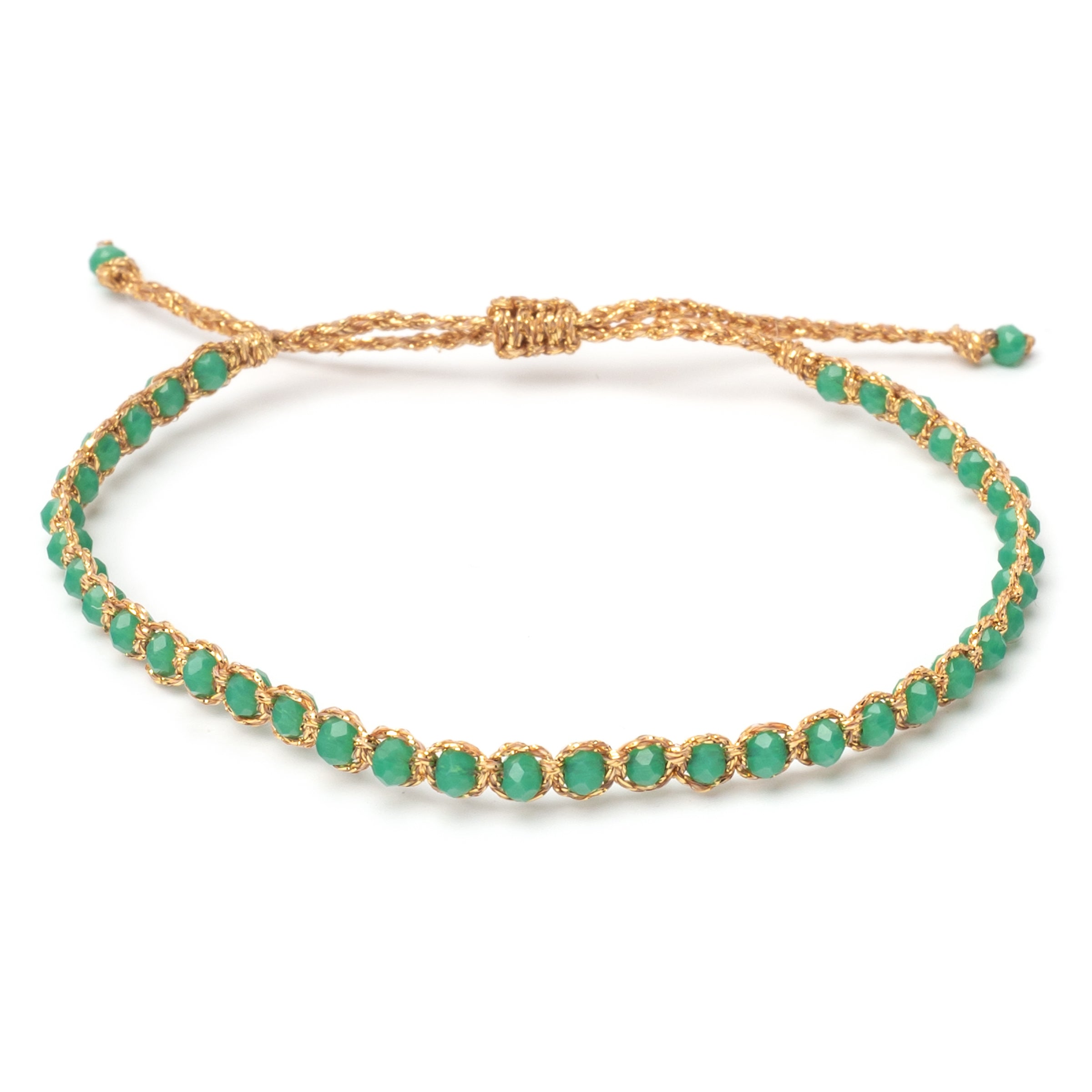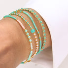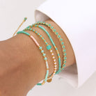 The Livorno bracelet set is a symphony of green. Matte beads in ocean green, blush rose, and mint green are lined up next to each other, while golden beads and four sparkling crystal beads add a fresh touch to the bracelet quartet.