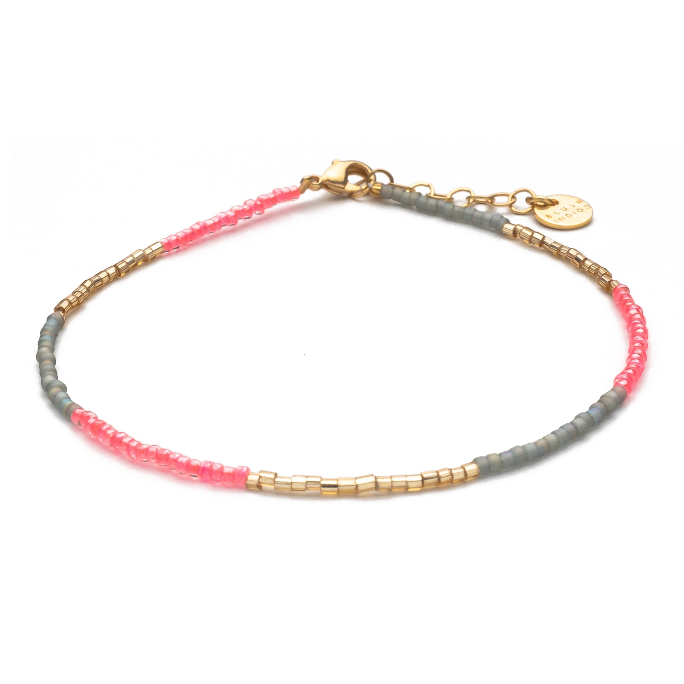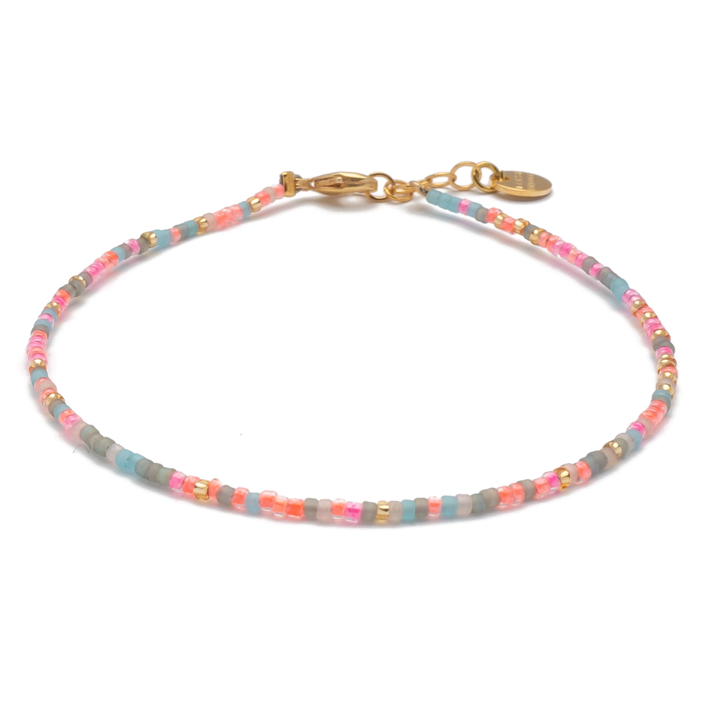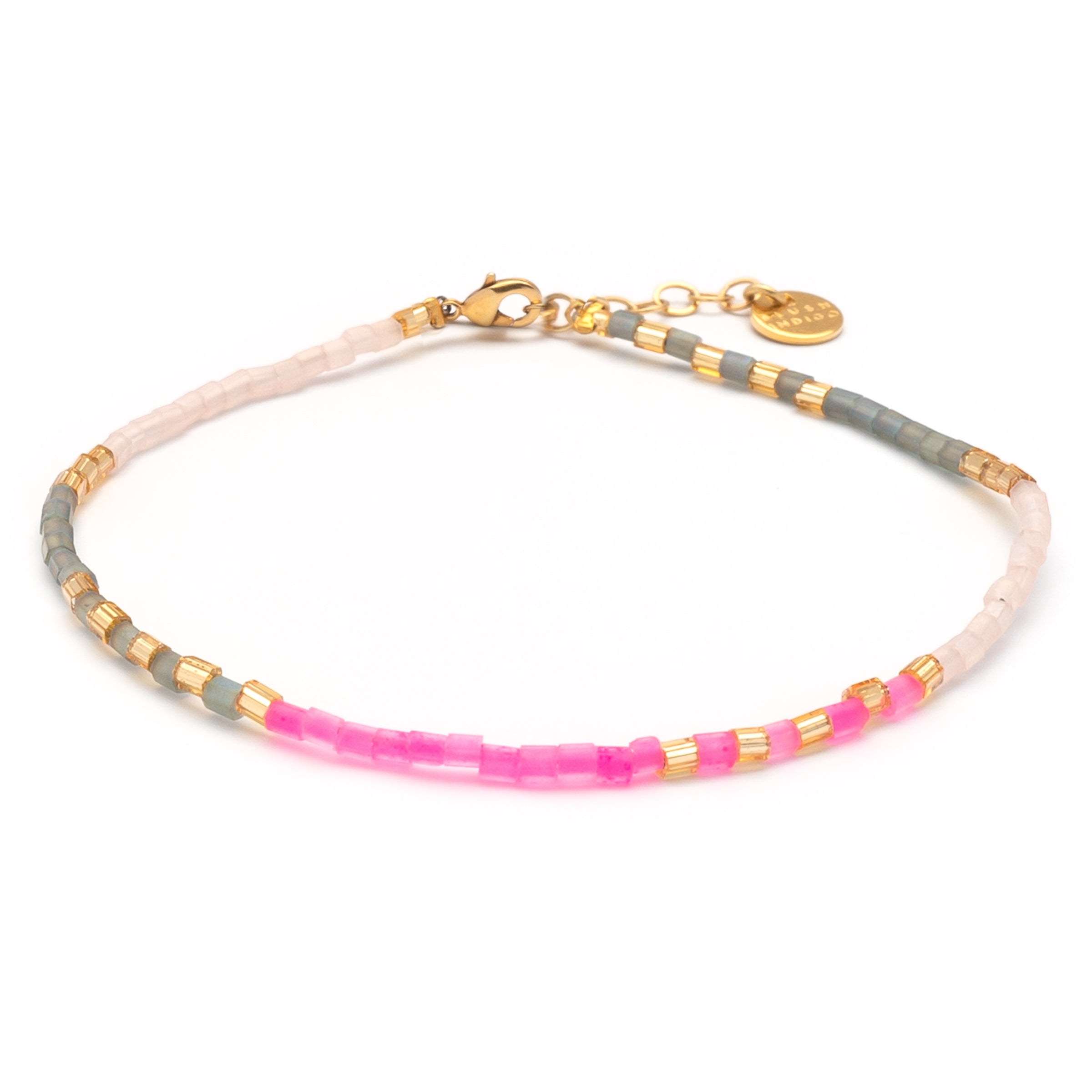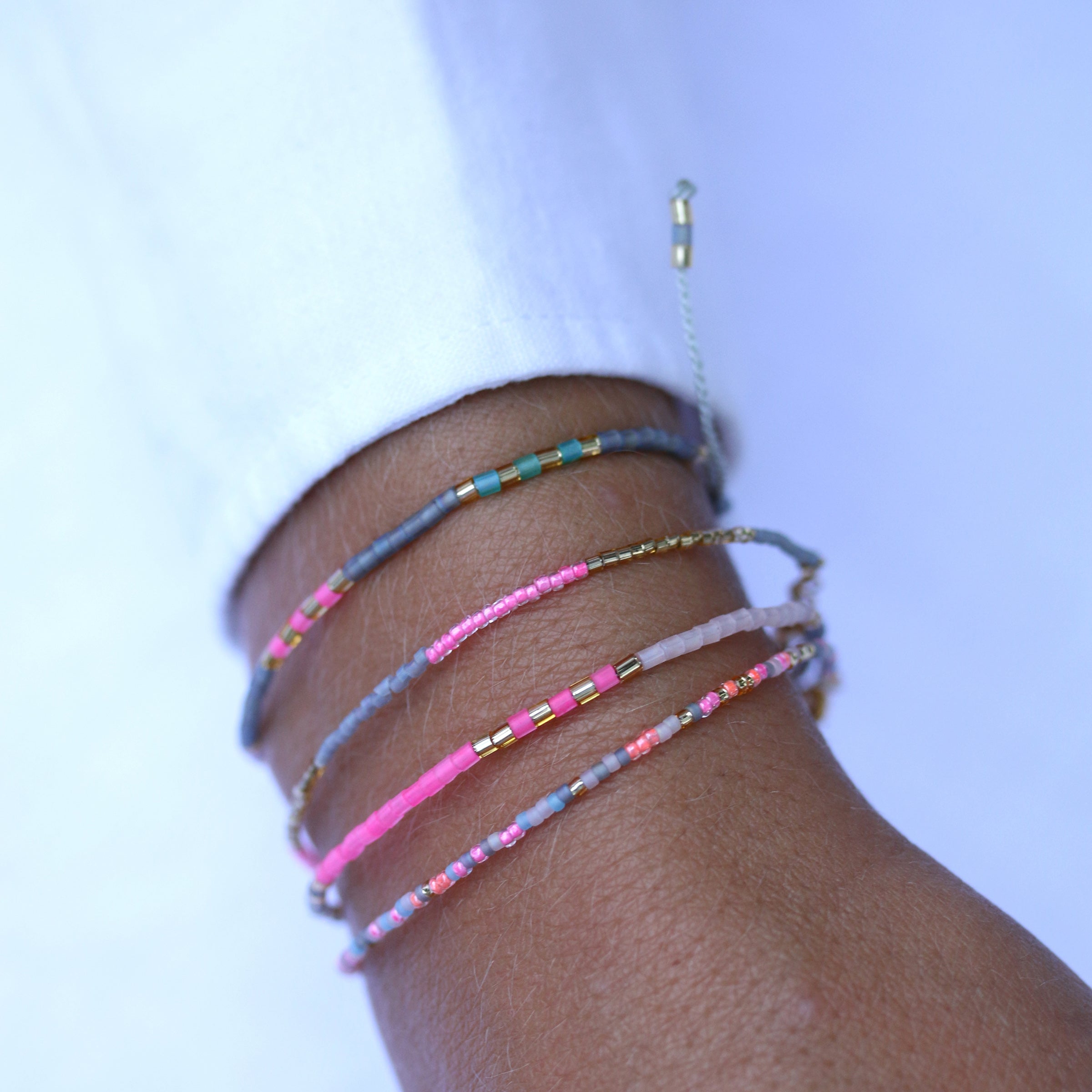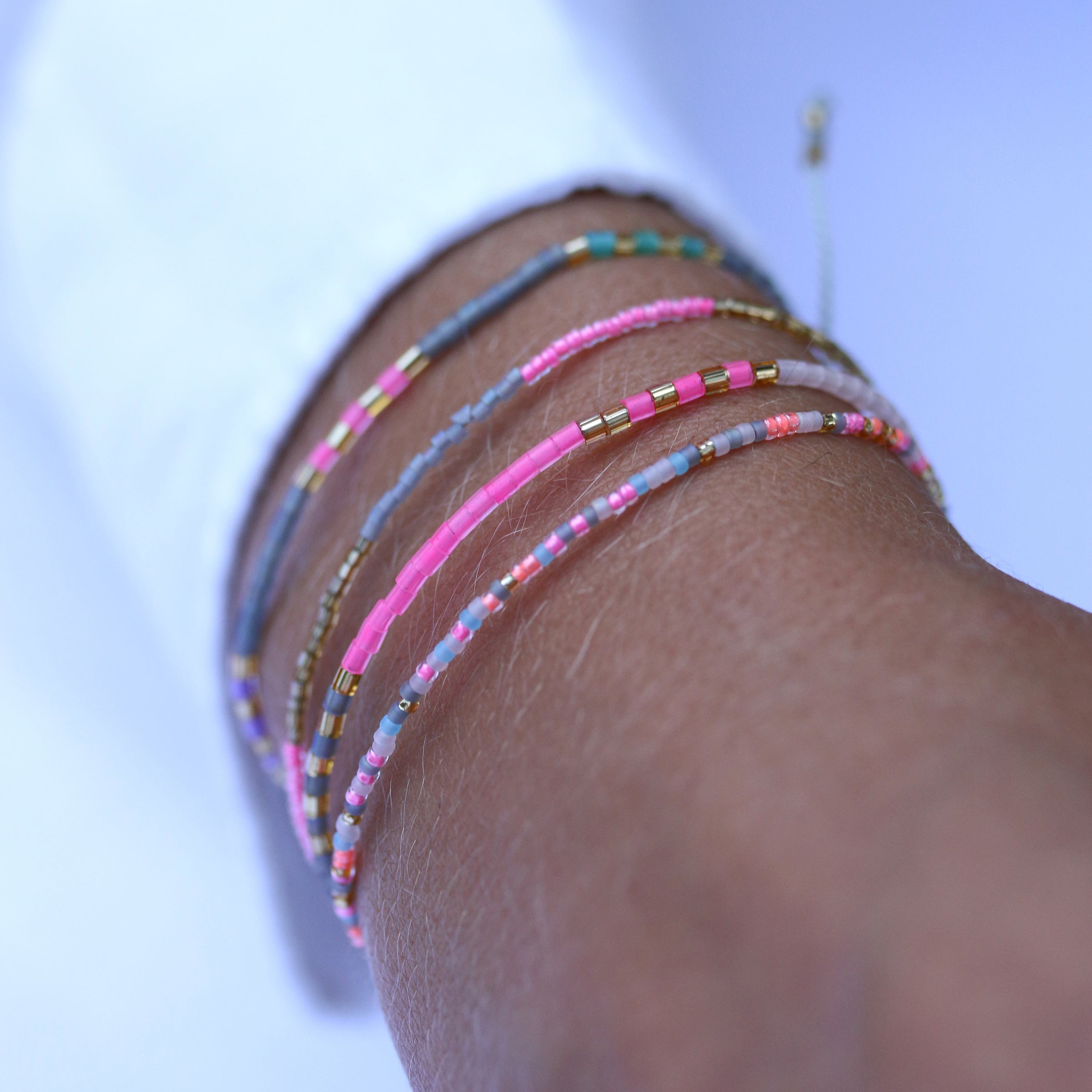 Take a cruise along the French Riviera with this bracelet stack in a wild mix of Frosted Grey, Glossy Pink, Frosted Blush and Light Blue. Golden beads add an elegant finish.