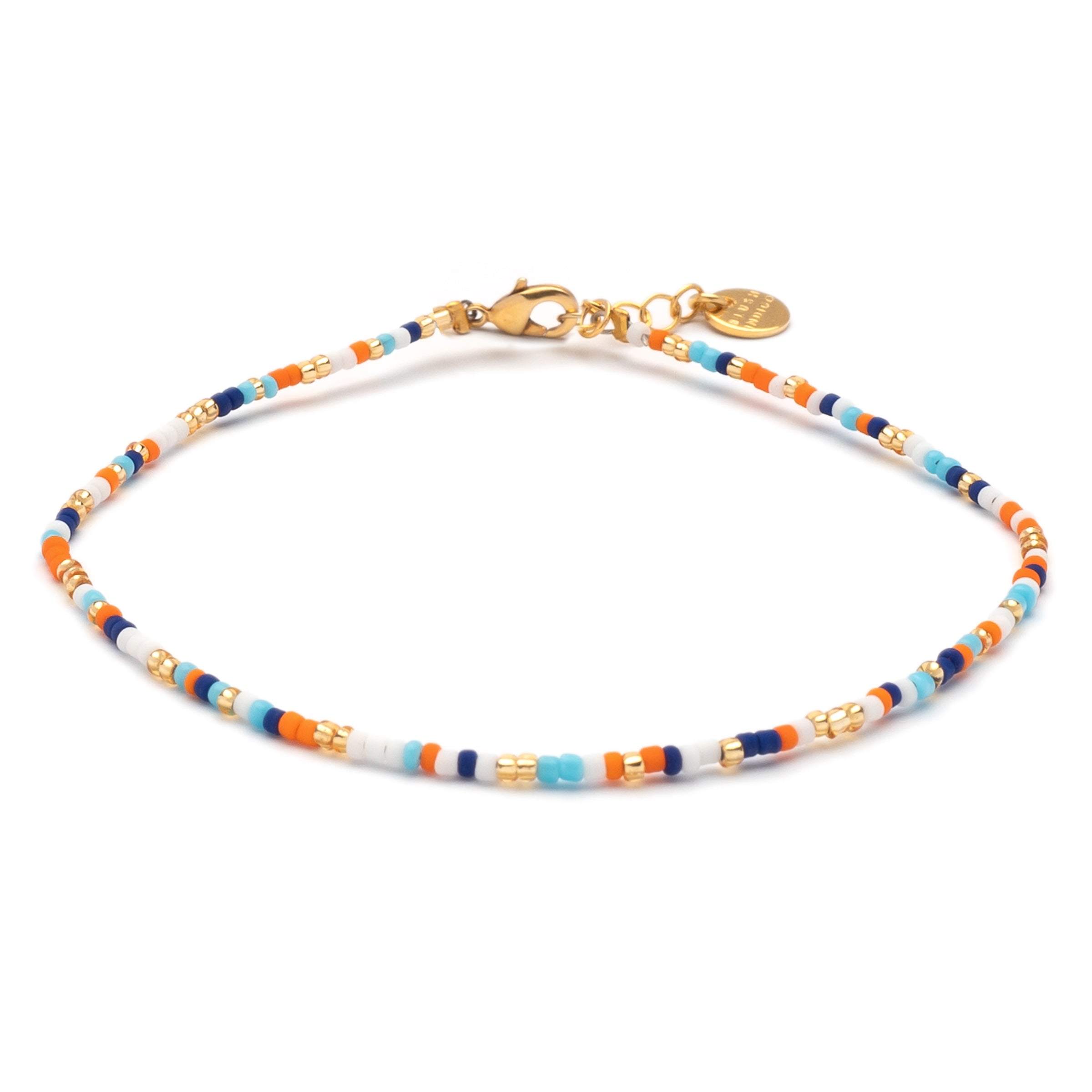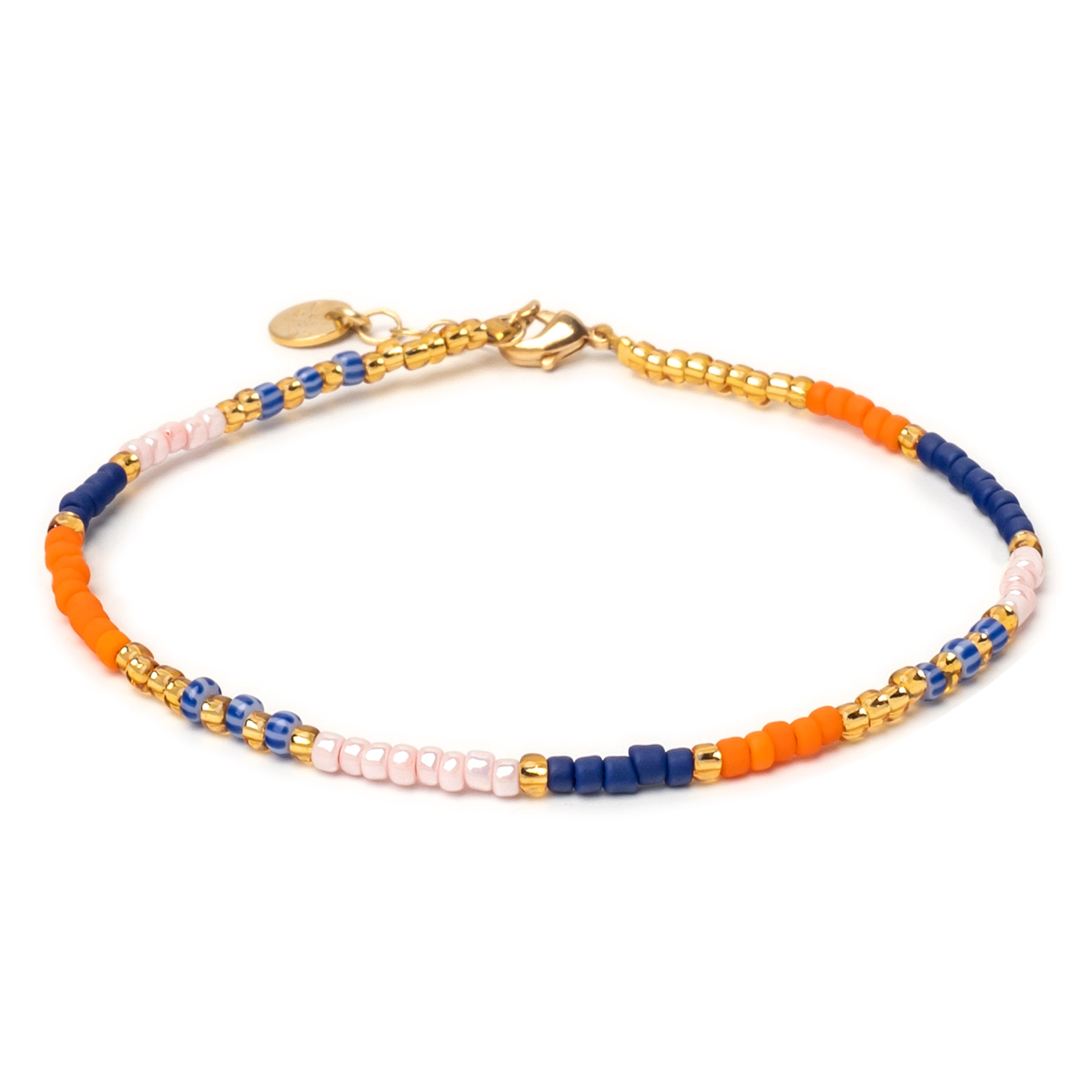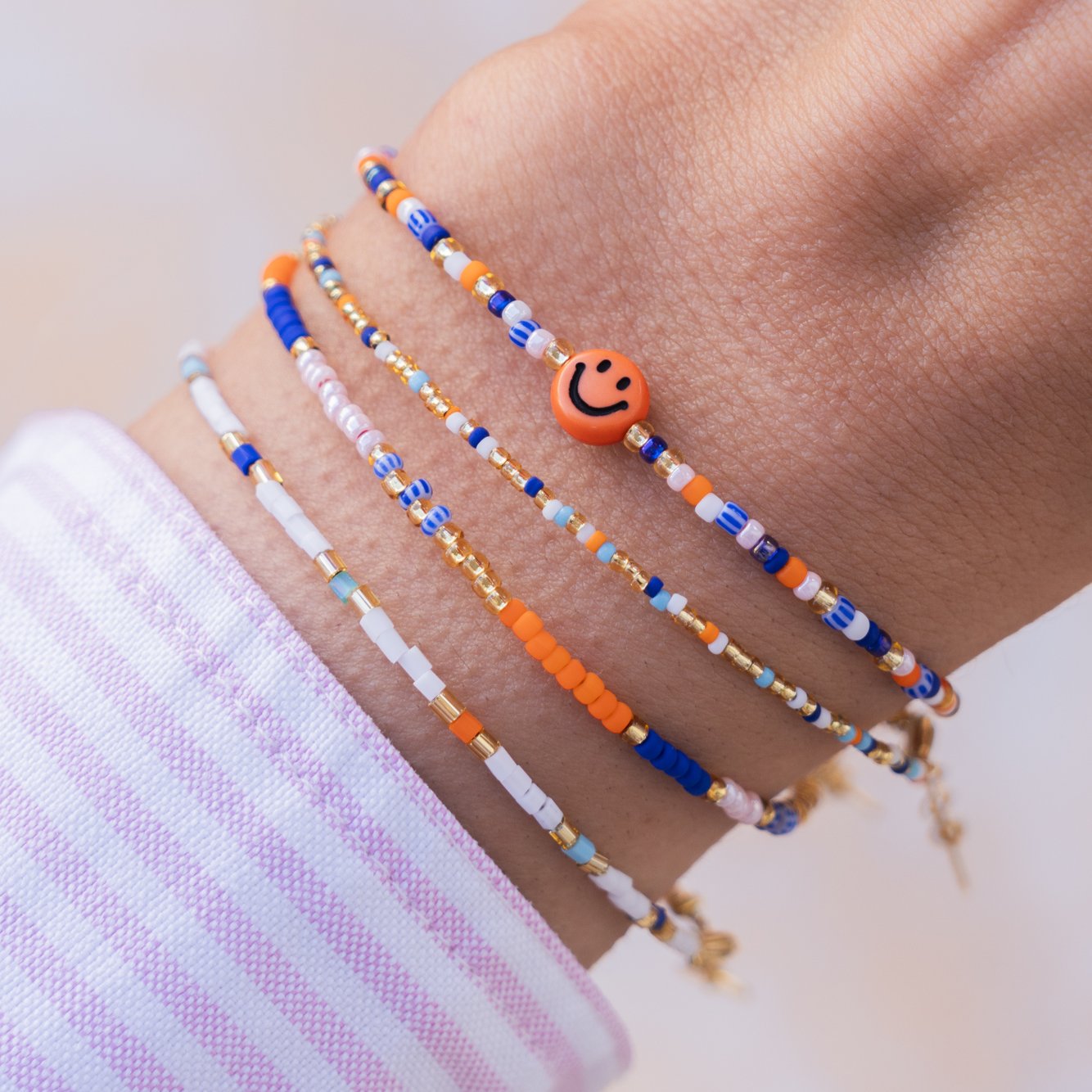 The Orange Smile bracelet quartet unfolds its splendor of colors in orange, indigo blue, white, pink, and light blue. The bracelet with an orange smiley bead is a cheerful eye-catcher, sure to bring a smile to your face and those around you.