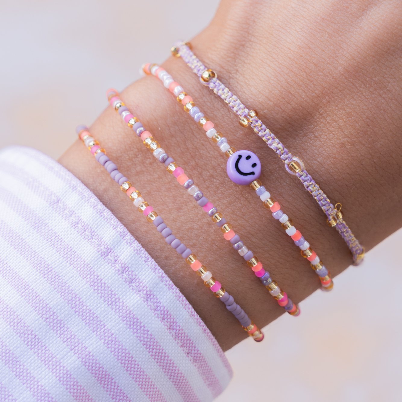 The Purple Smile bracelet set unfolds its soft splendor of colors in lilac and neon coral. The bracelet with a purple smiley bead is a cheerful eye-catcher. It will put a smile on your face and that of those around you.