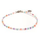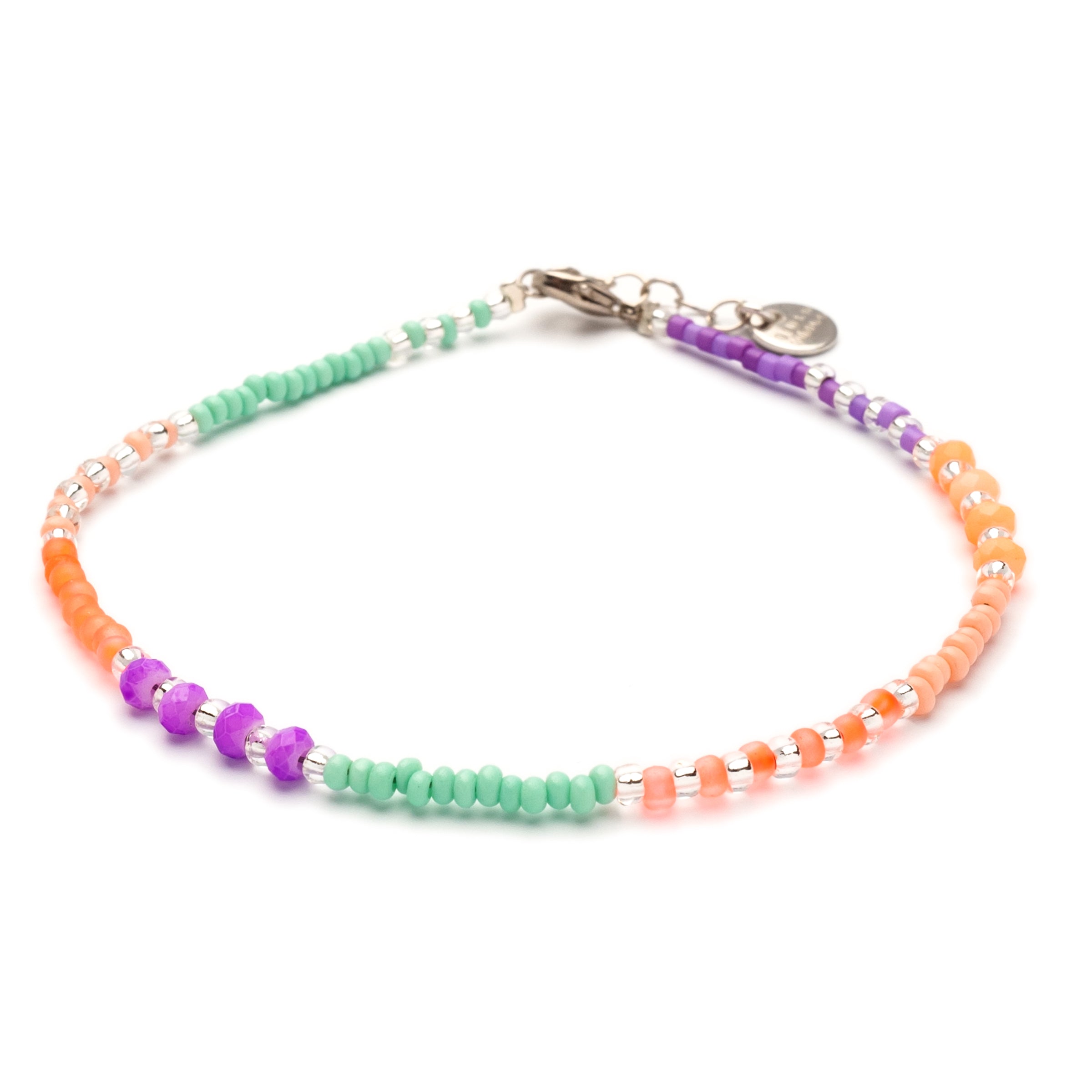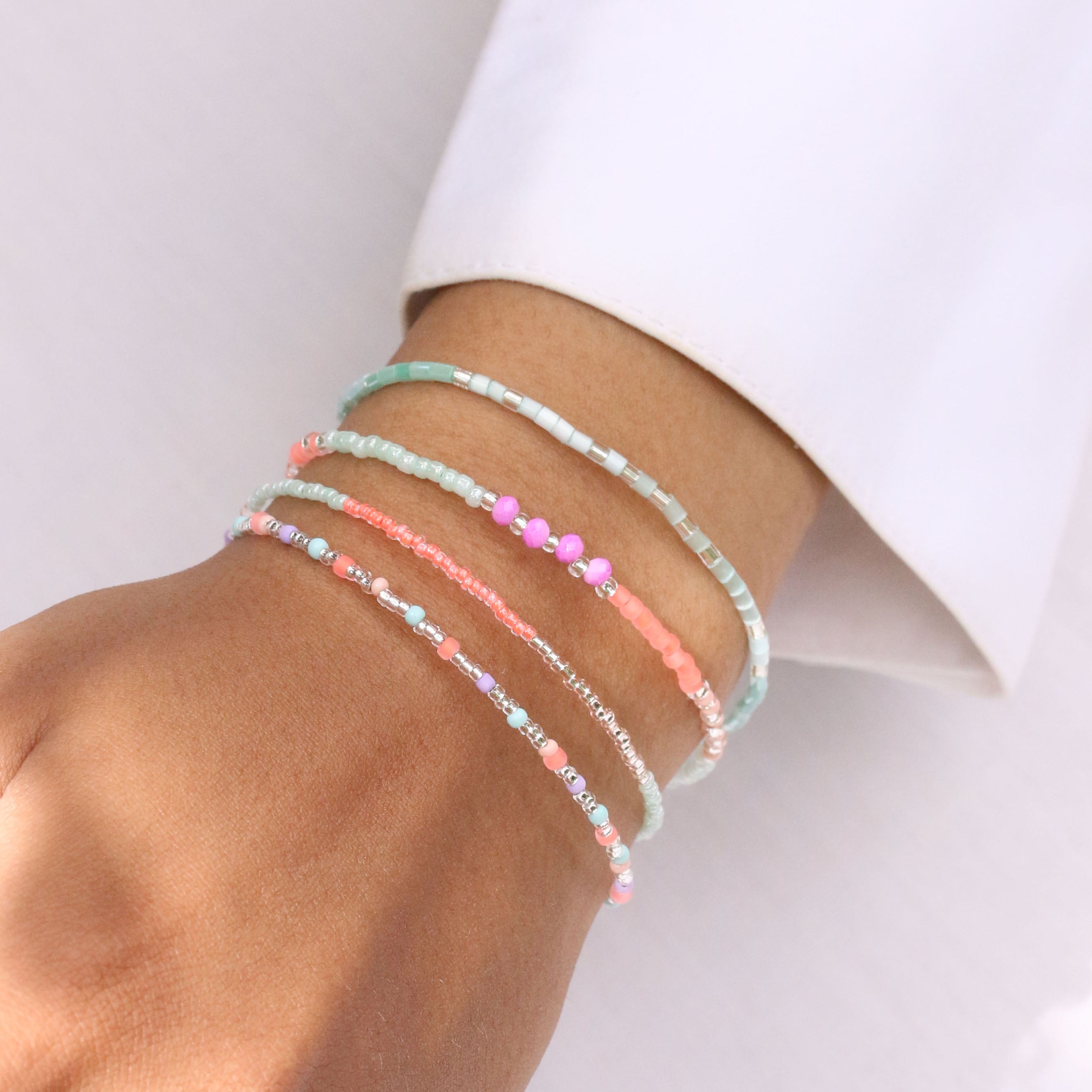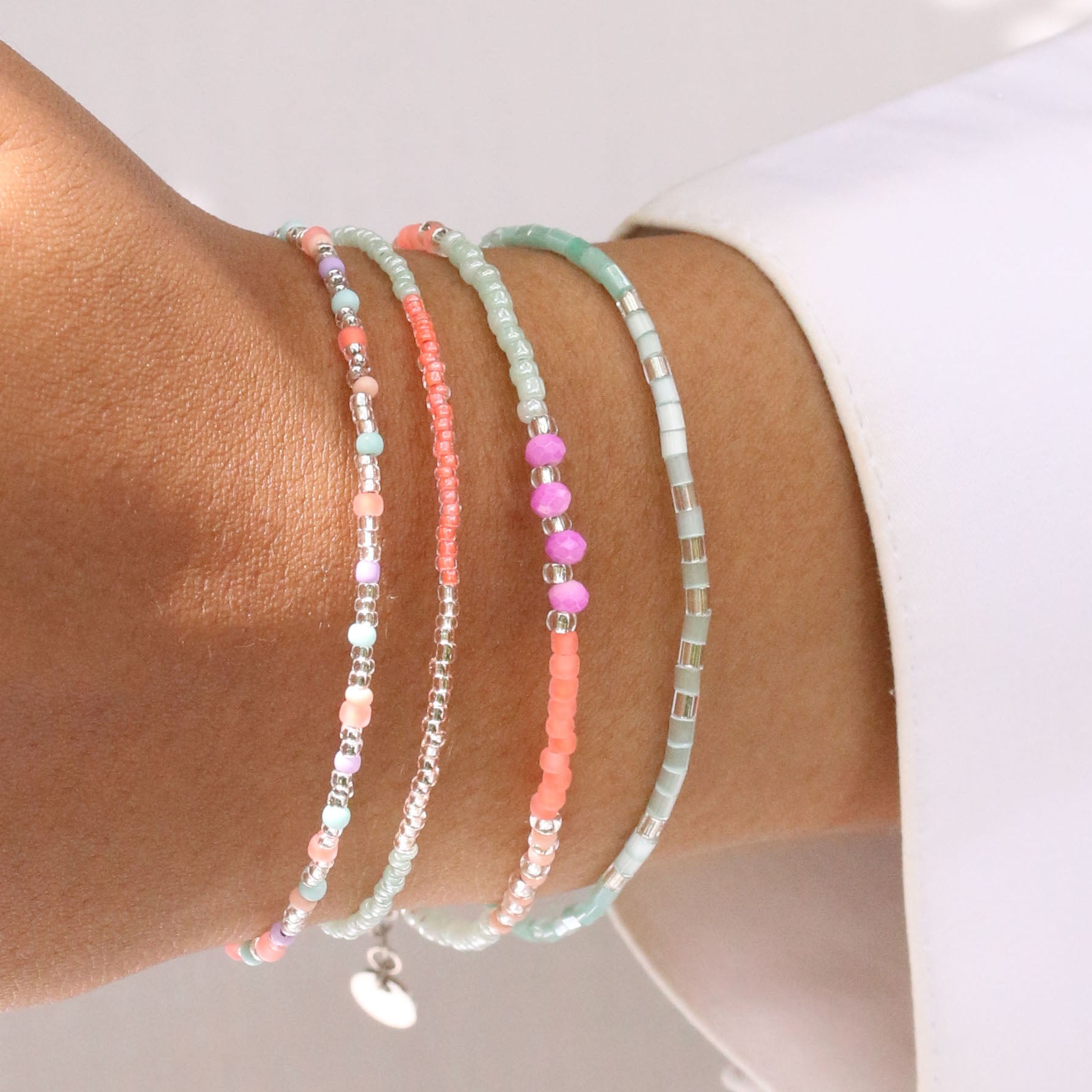 The colors of our silver Rhodos bracelet set shine in soft neon tones. Alongside pearls in coral, mint green, and lilac, matte glass crystals in purple and neon coral add elegant accents.