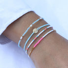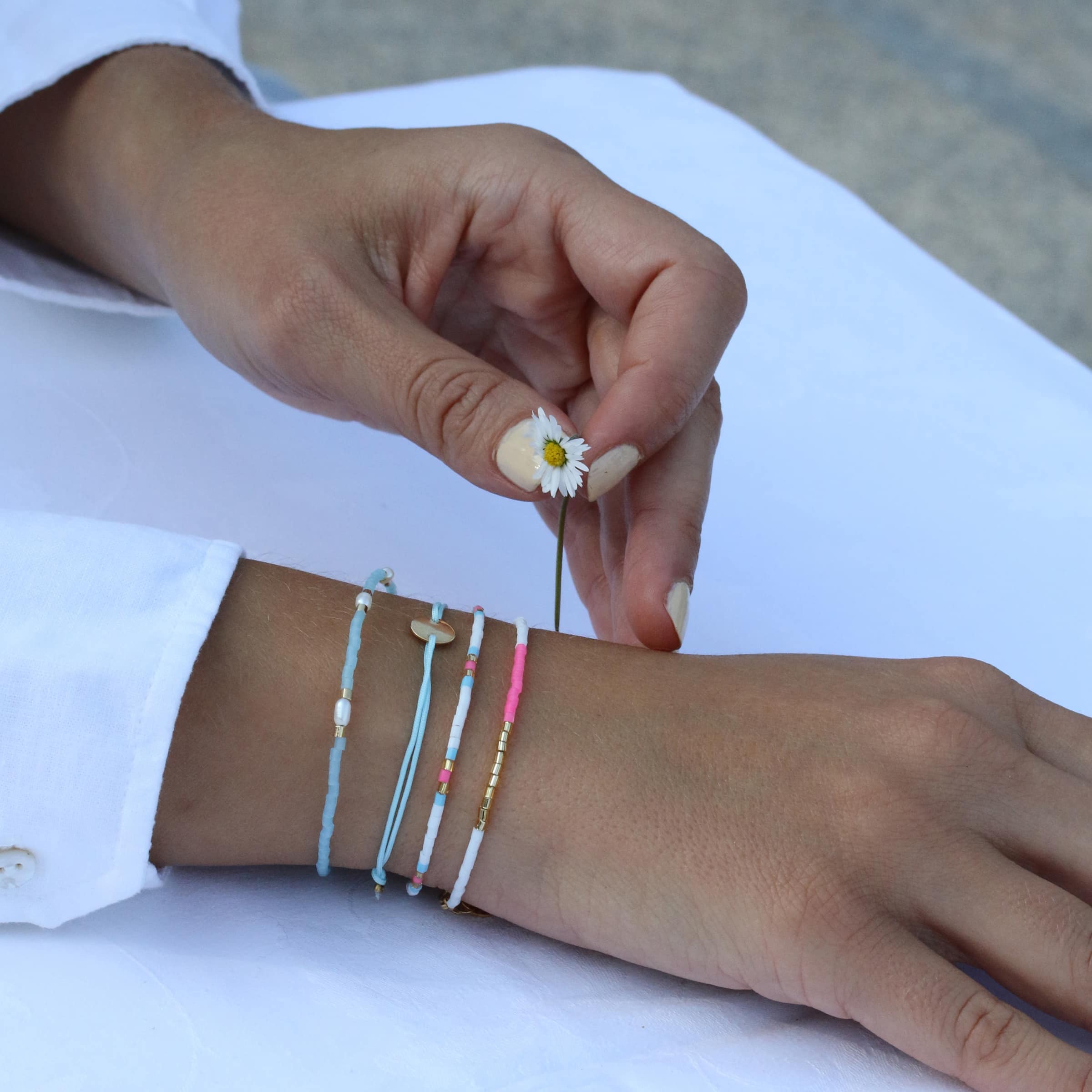 A bracelet stack made for walking the beach promenade: Two Amalfi bracelets with beads in Gold, White, Sky-Blue and Frosted Pink team up with one Darling Disc and Capri bracelet made with 3 freshwater pearls.