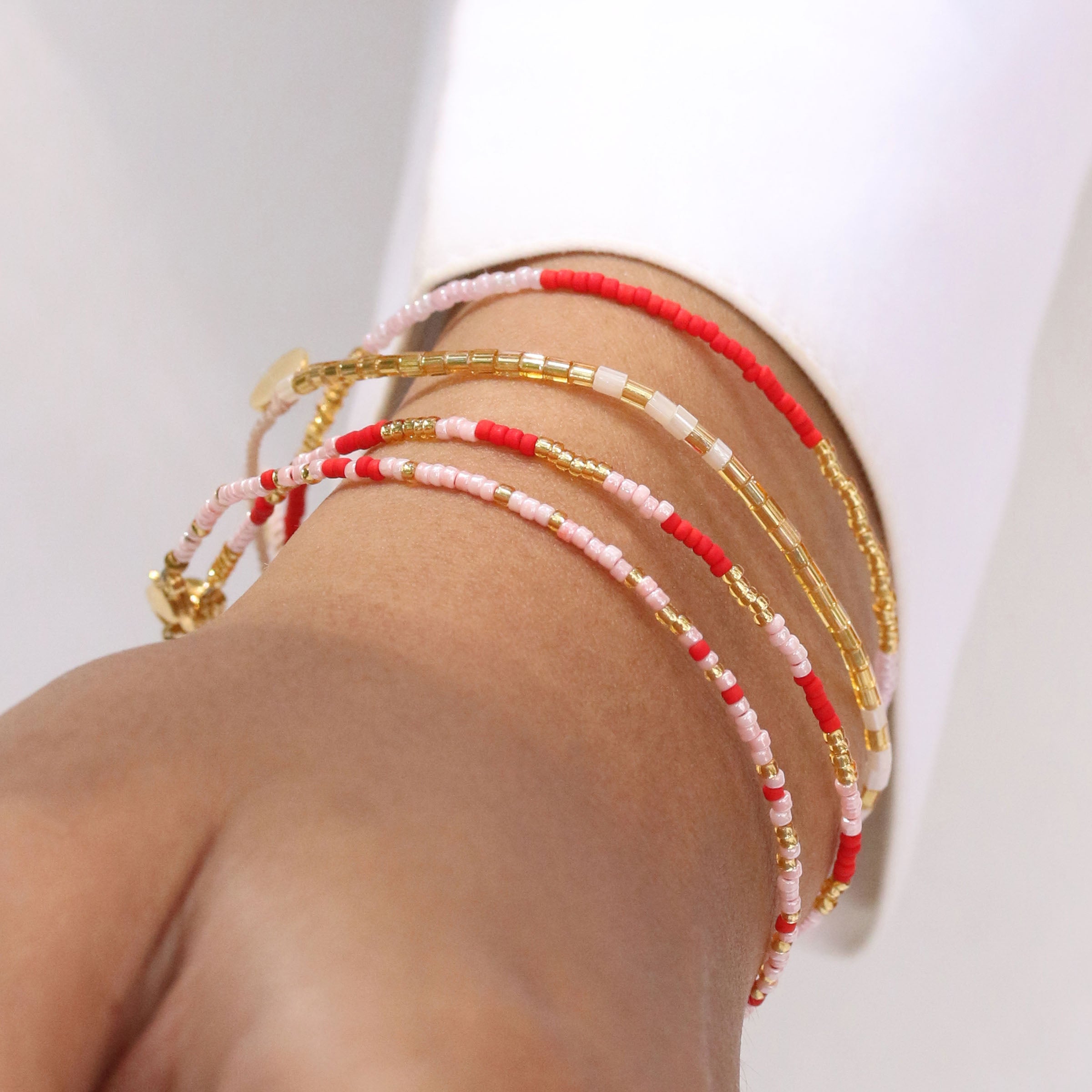 Our Rose Garden bracelet set combines red and pink to create a romantic love affair on your wrist. Golden beads add sparkle to the colorful rose garden of matte and shiny glass beads.